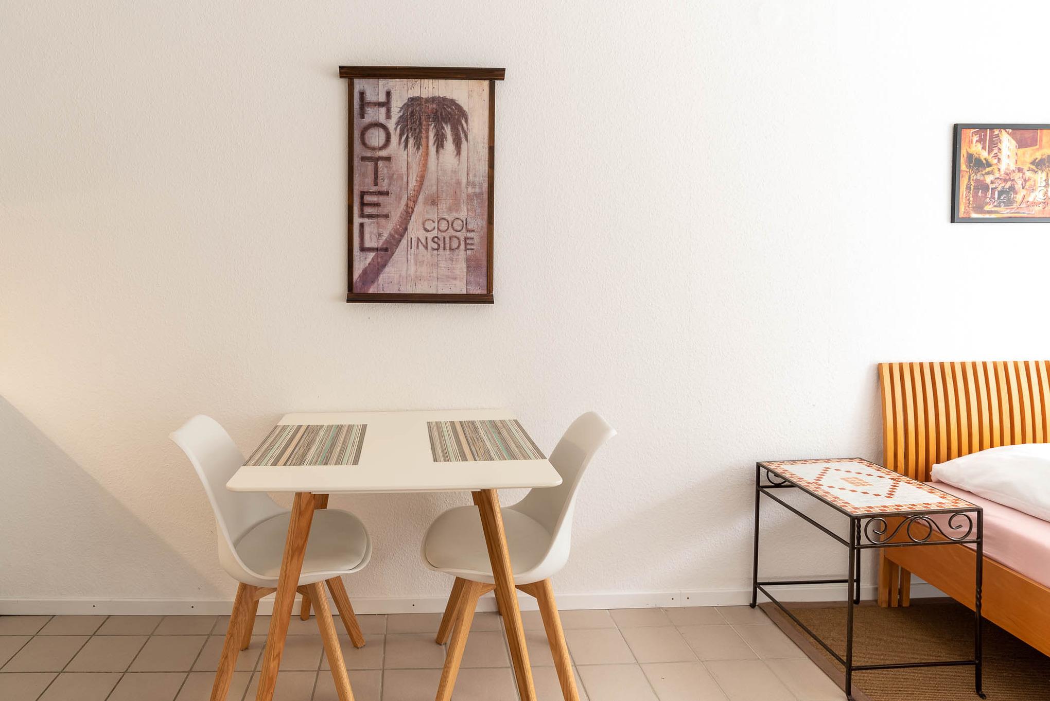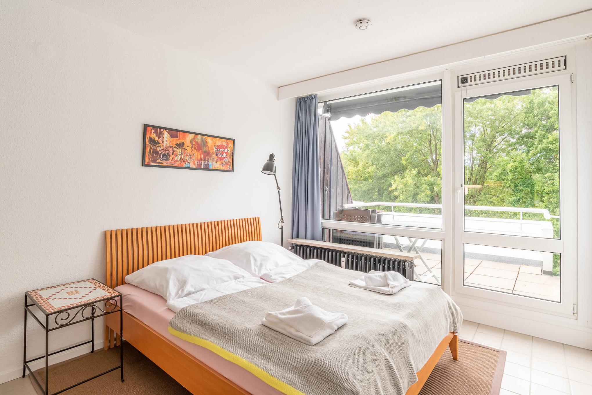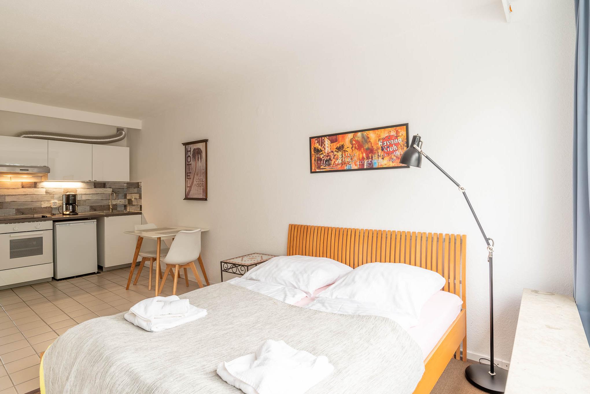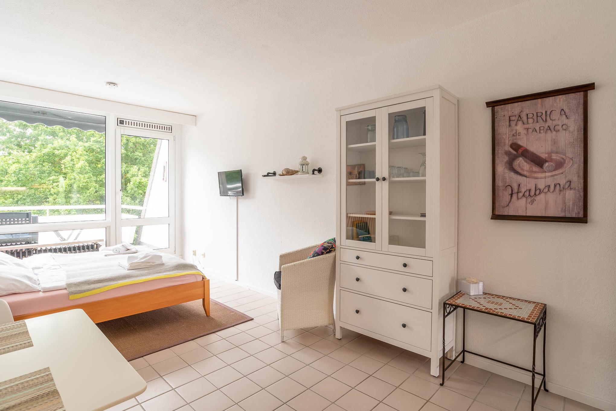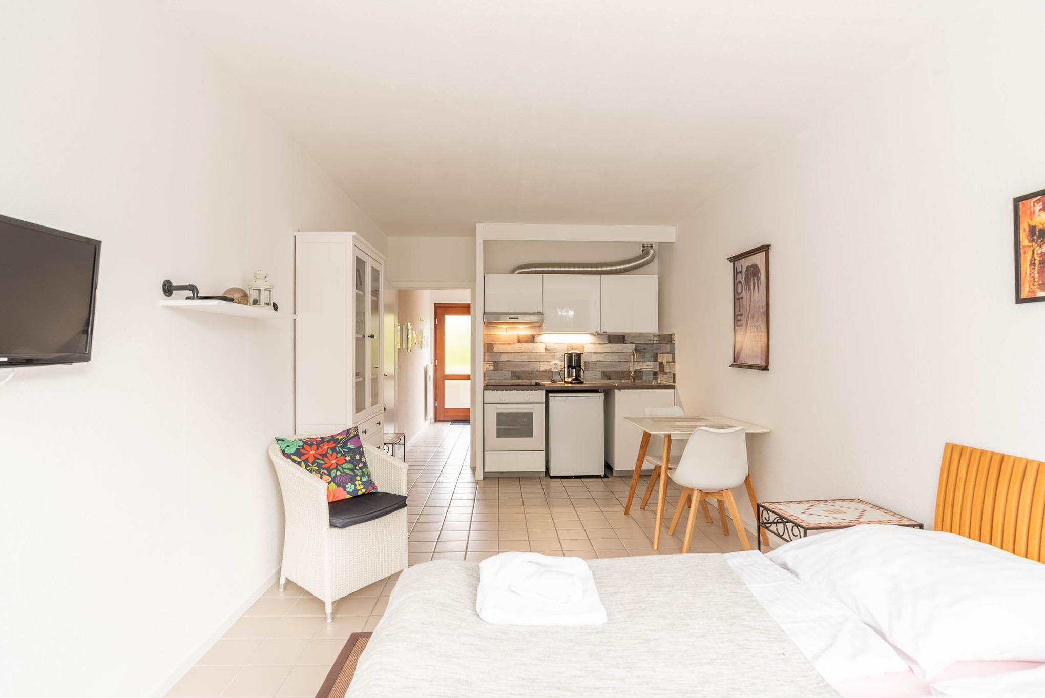 Die 1-Zimmer-Wohnung ist freundlich eingerichtet. Beim Betreten der Wohnung gelangen Sie zuerst in einen kleinen Flur mit Möglichkeiten Ihr Gepäck zu verstauen. Von hier aus erreichen Sie das voll ausgestattete Badezimmer, sowie den Wohn-, Ess-, und Schlafbereich. Das Apartment lässt sich bei Bedarf mit Gardinen abdunkeln. Zum Übernachten steht Ihnen ein Doppelbett (Liegefläche von 160 x 200 cm) zur Verfügung. Neben einer Vitrine, die ausreichend Stauraum bietet und einem Sessel ist zudem ein kleiner Flatscreen-Fernseher in diesem Apartment für Sie vorhanden.