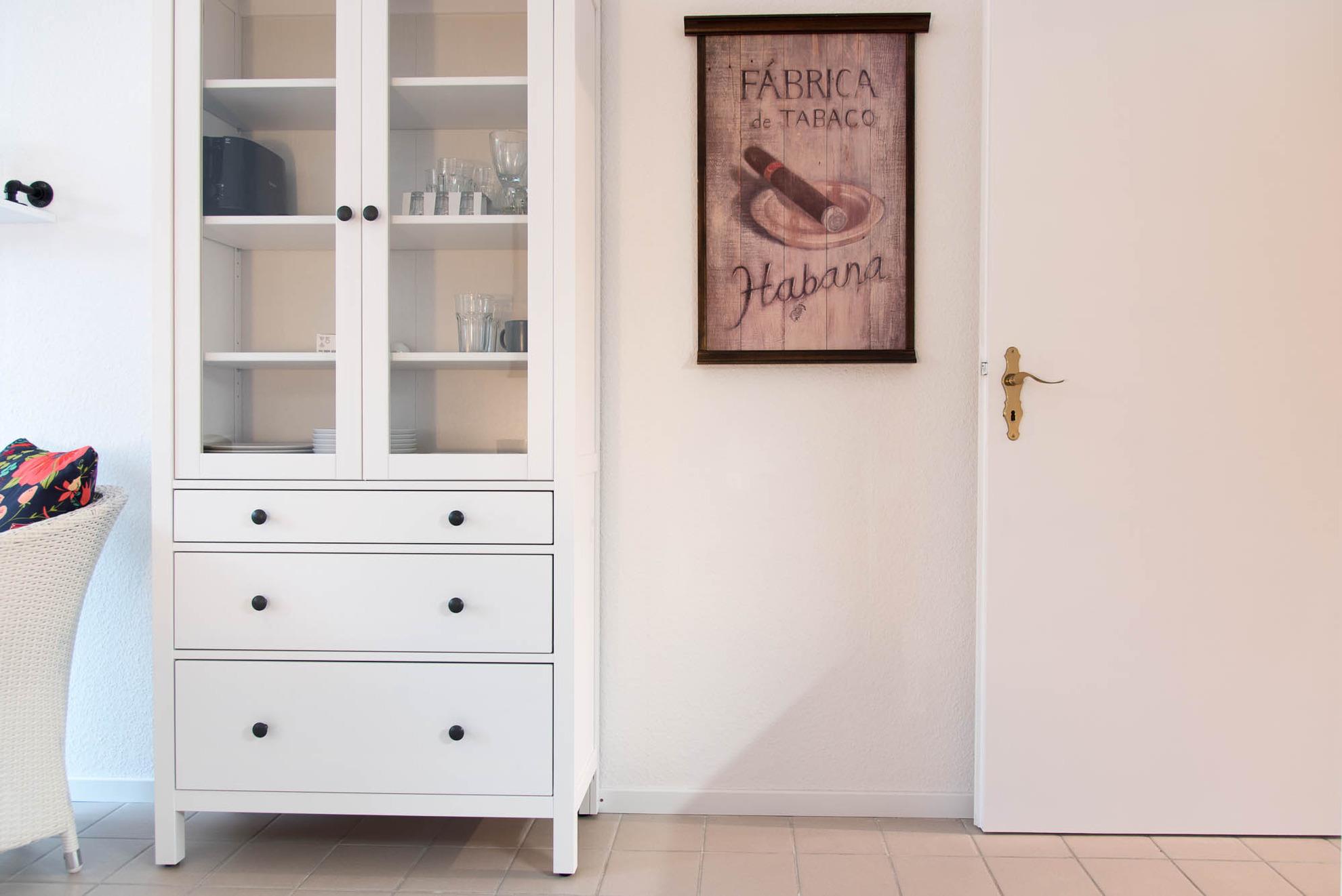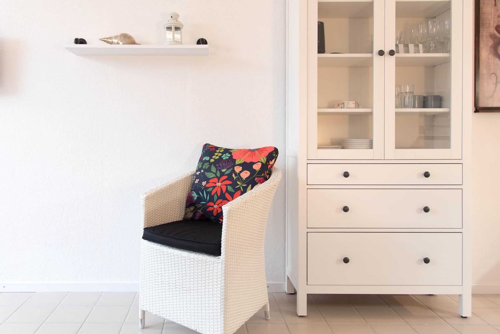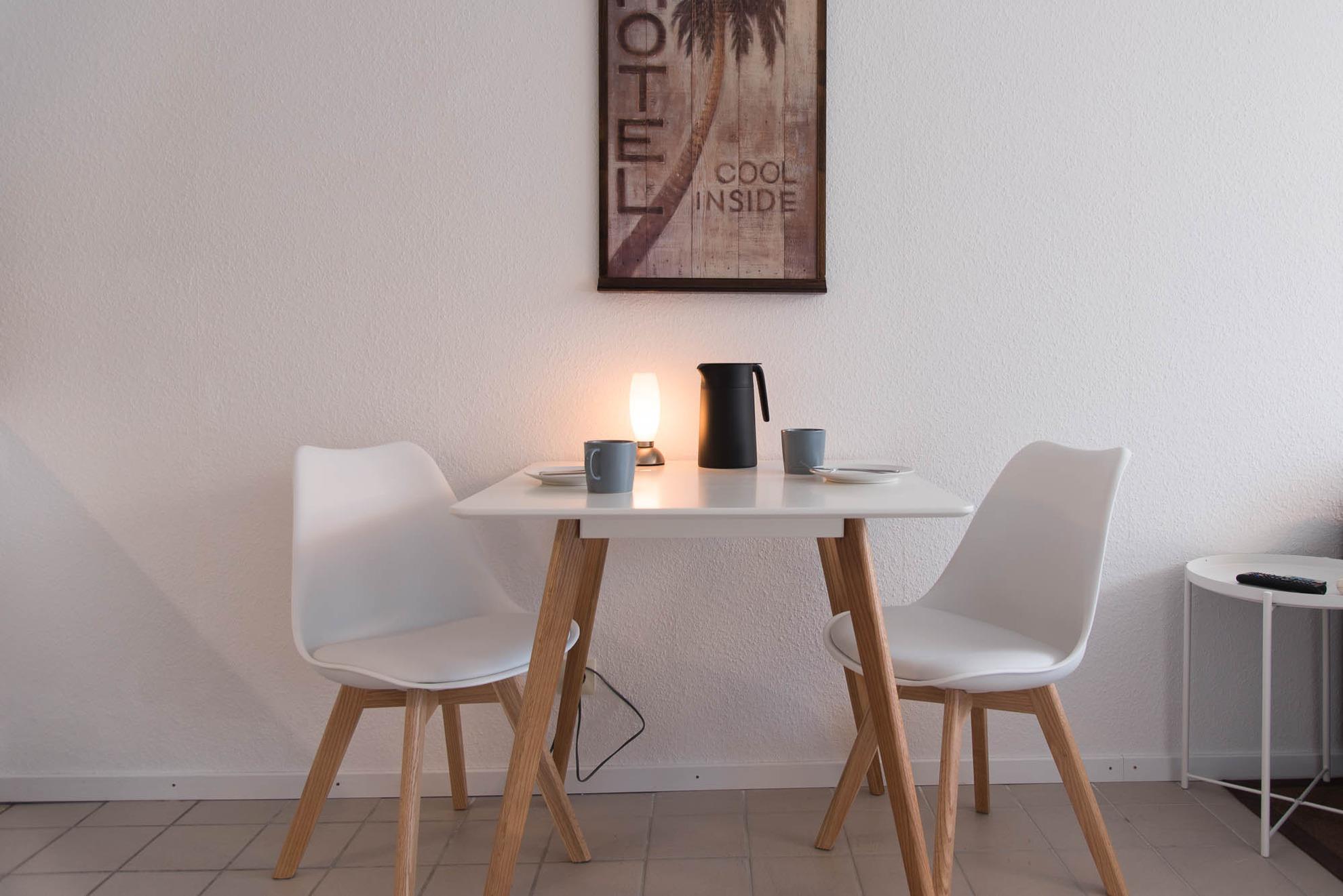 Die offene Küche ist mit gut ausgestattet, was Sie für den täglichen Bedarf benötigen: Von der Kaffeemaschine über das Ceran-Kochfeld, den Ofen, Toaster, Kühlschrank mit Gefrierfach bis hin zum Wasserkocher und ausreichendem Geschirr und Gläser, sollte es Ihnen an nichts fehlen. An der Küchenzeile schließt sich der Essbereich mit einem Tisch und zwei Stühlen an.