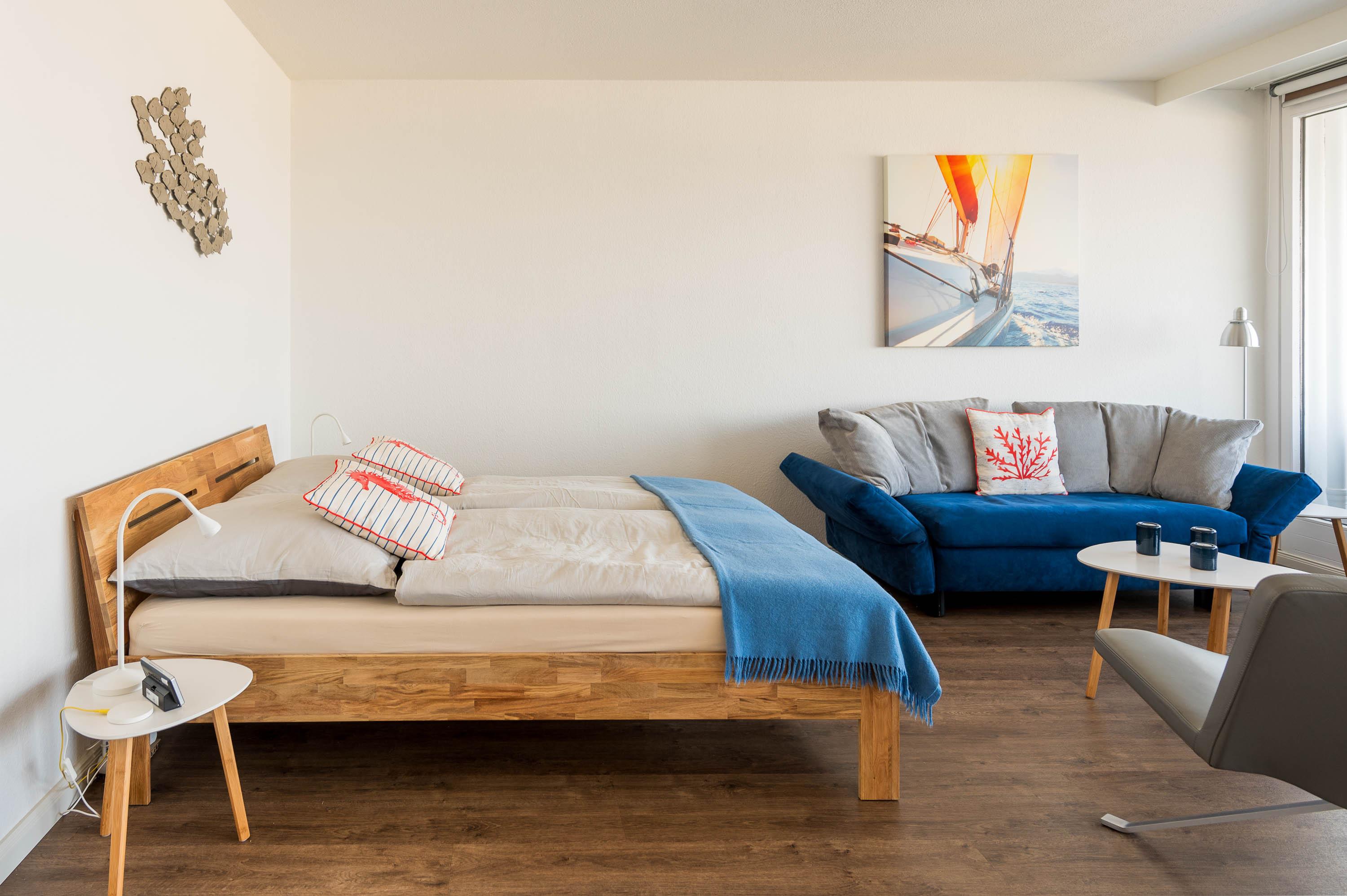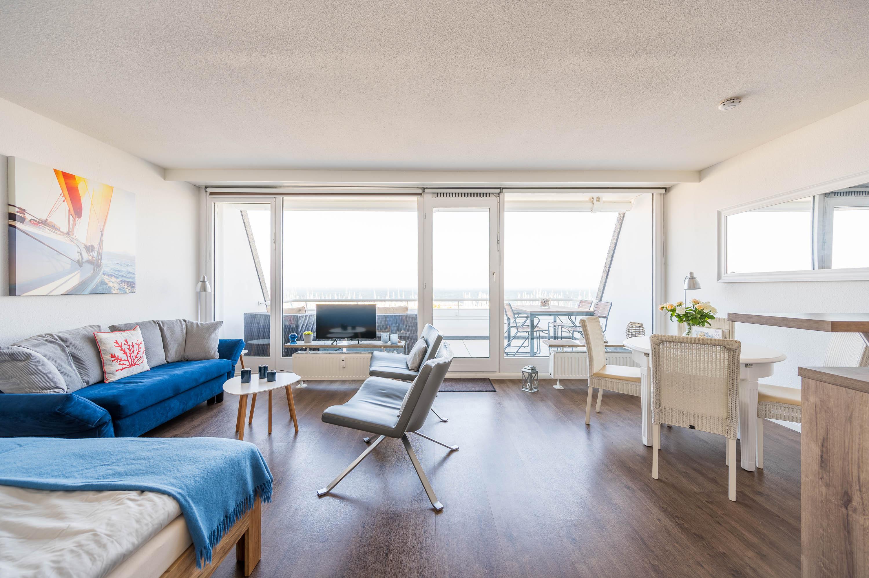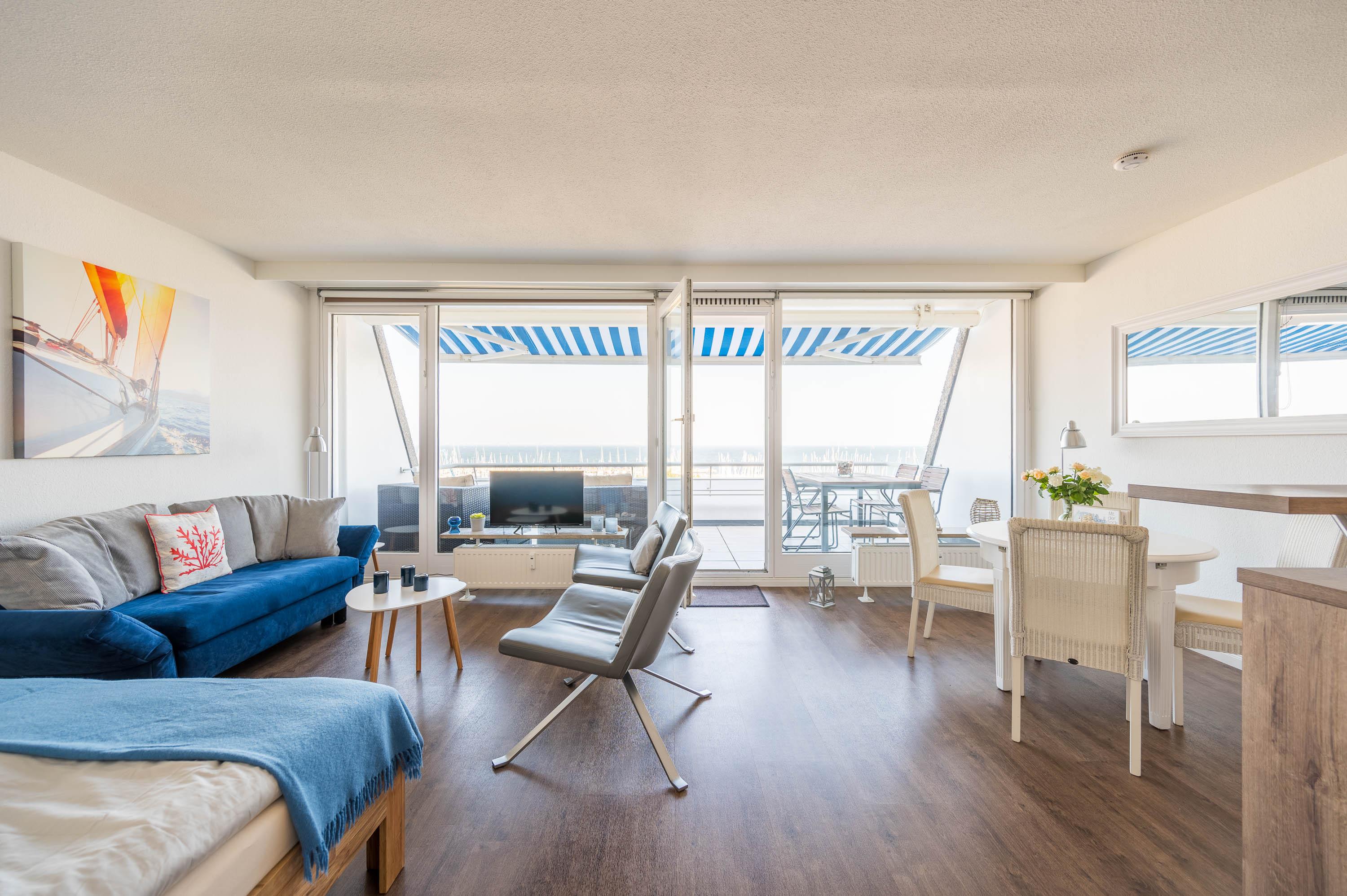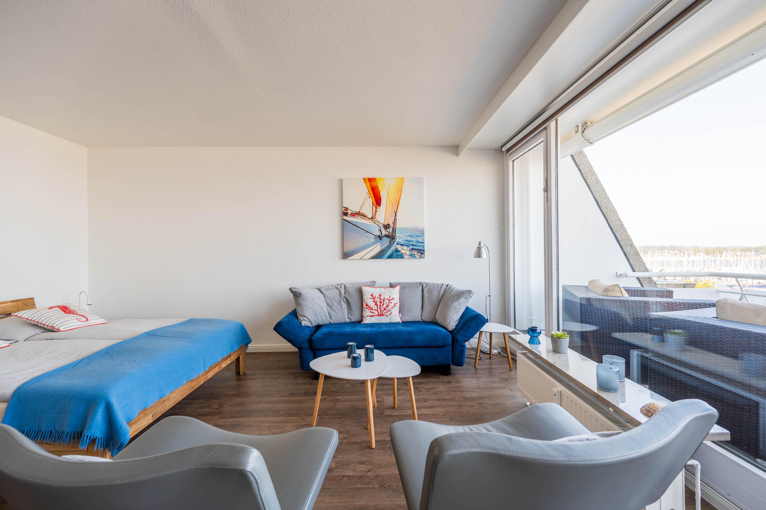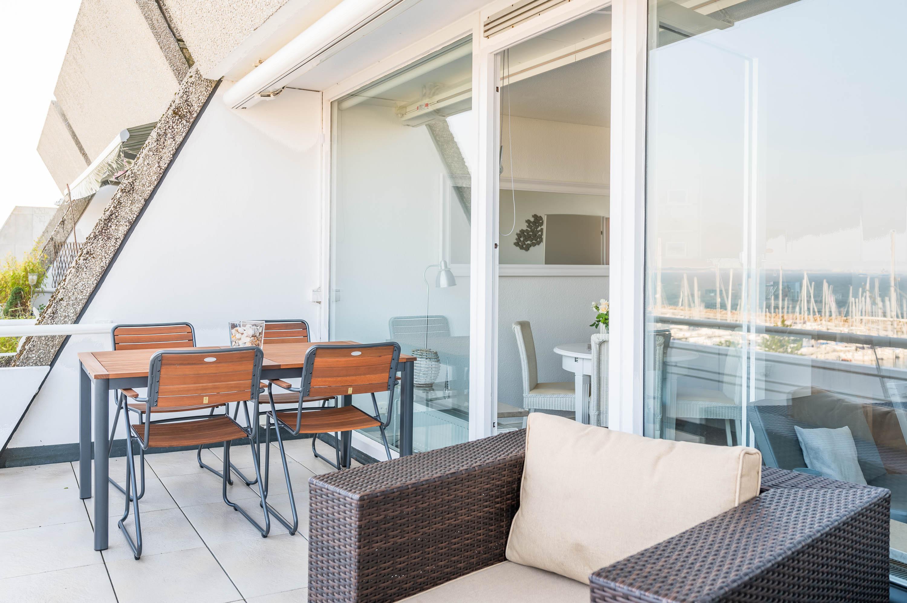 Die Unterkunft lässt sich durch Rollos abdunkeln. Mit ein paar Handgriffen lässt sich die Couch in ein Schlafsofa mit der Liegefläche von 135x200cm umbauen. Hier kann eine Person zusätzlich übernachten. Der 12qm² große Balkon verfügt über einen robusten Gartentisch sowie vier Stühle und zwei Loungesesseln. Von hier lässt sich wunderbar der Hafen und das Treiben auf der Ostsee beobachten. Vor der Morgen- und Mittagssonne schützt eine ausfahrbare Markise.