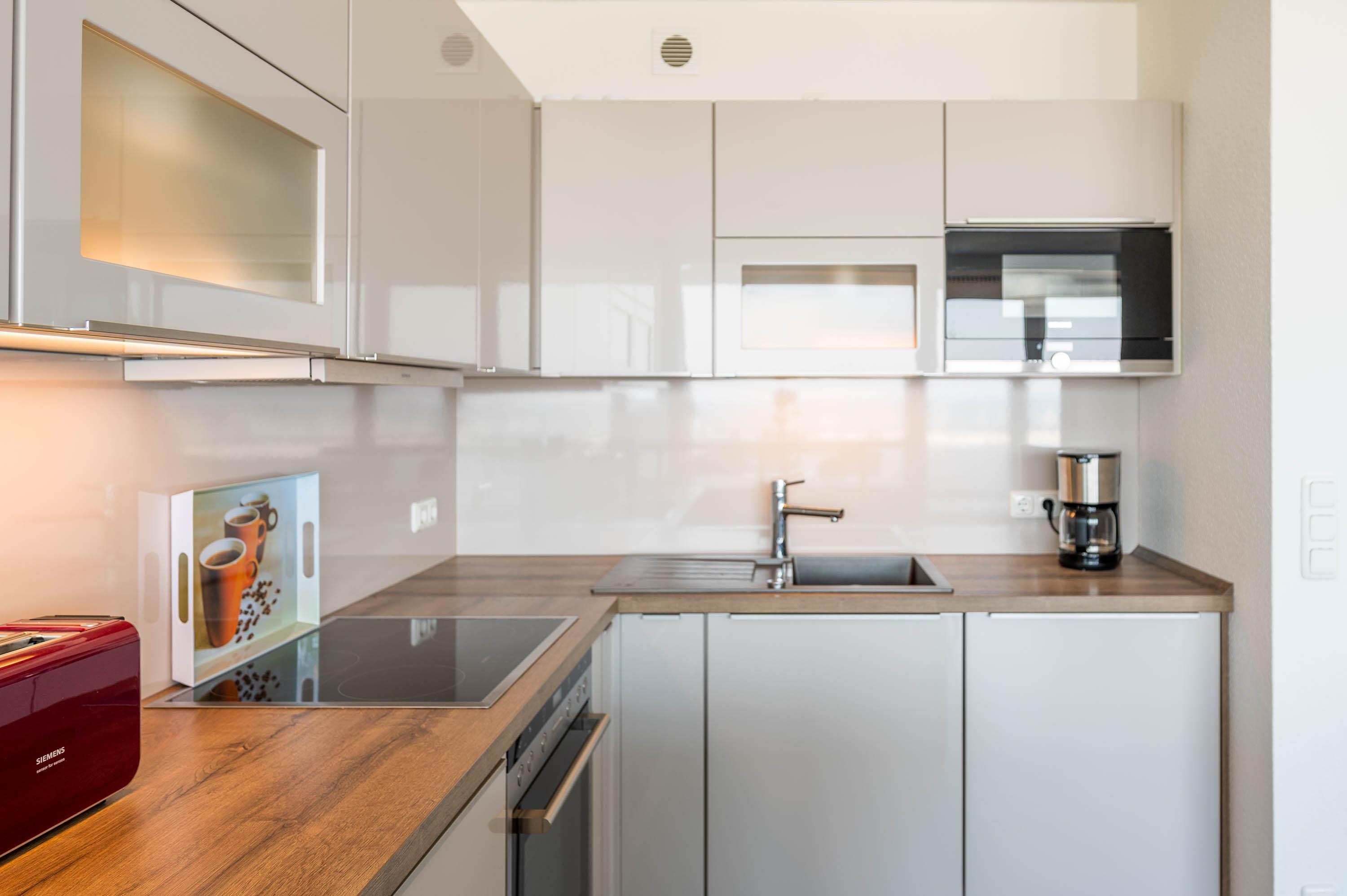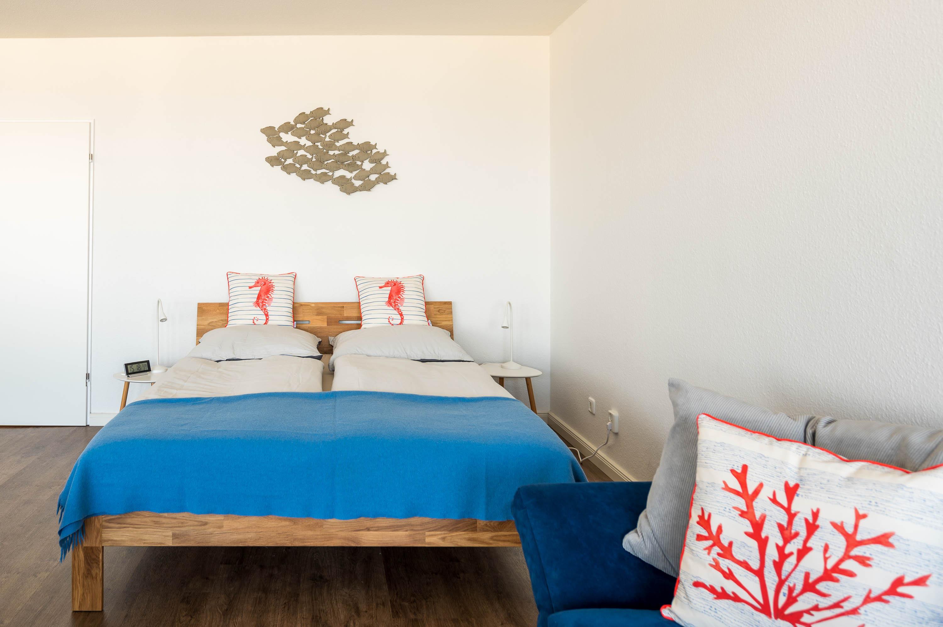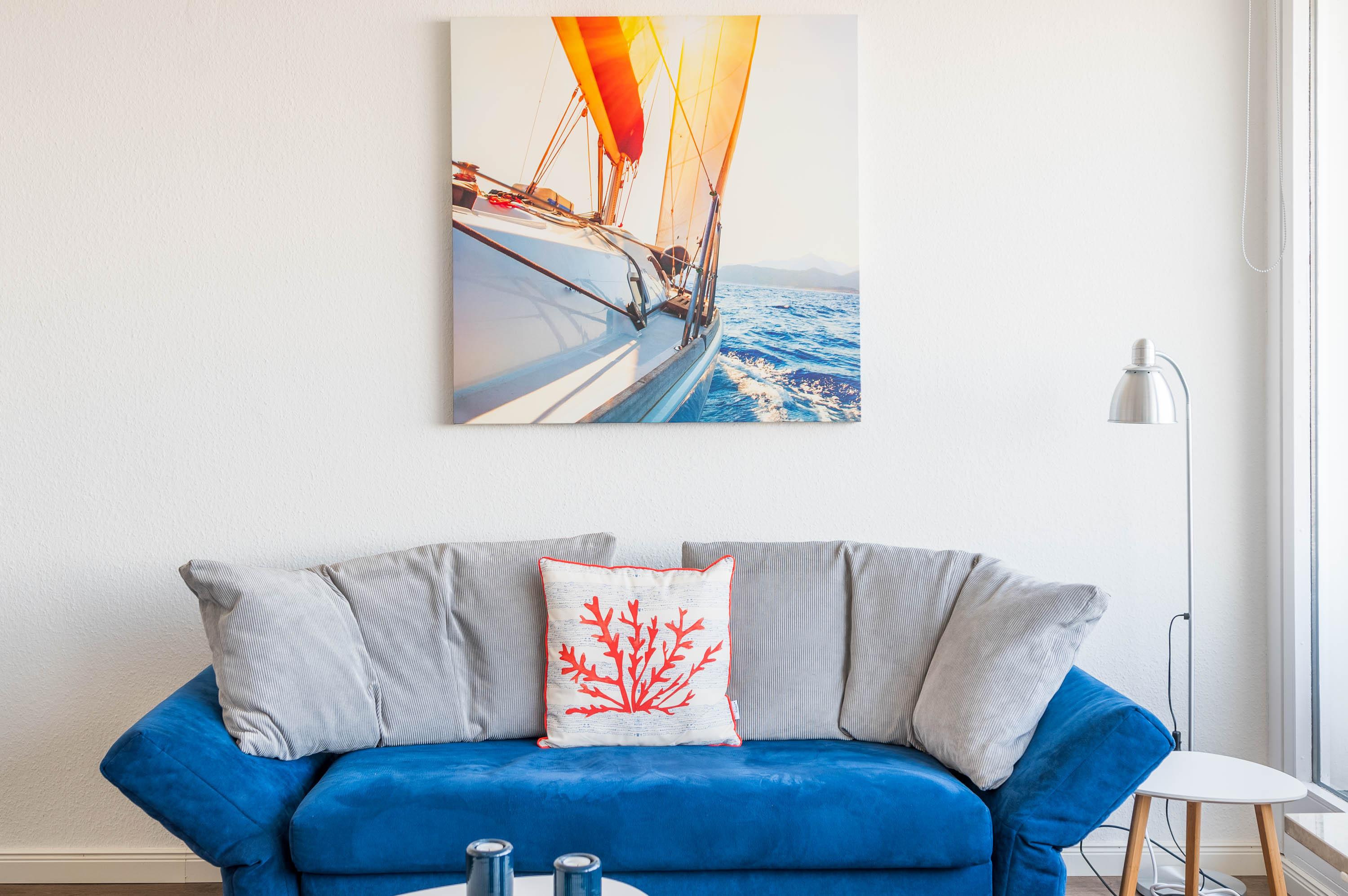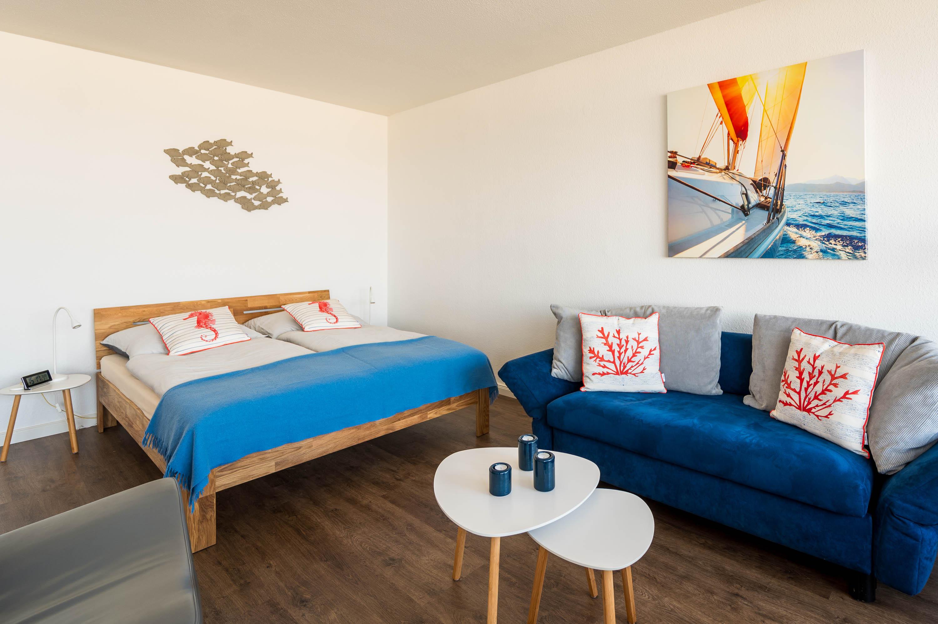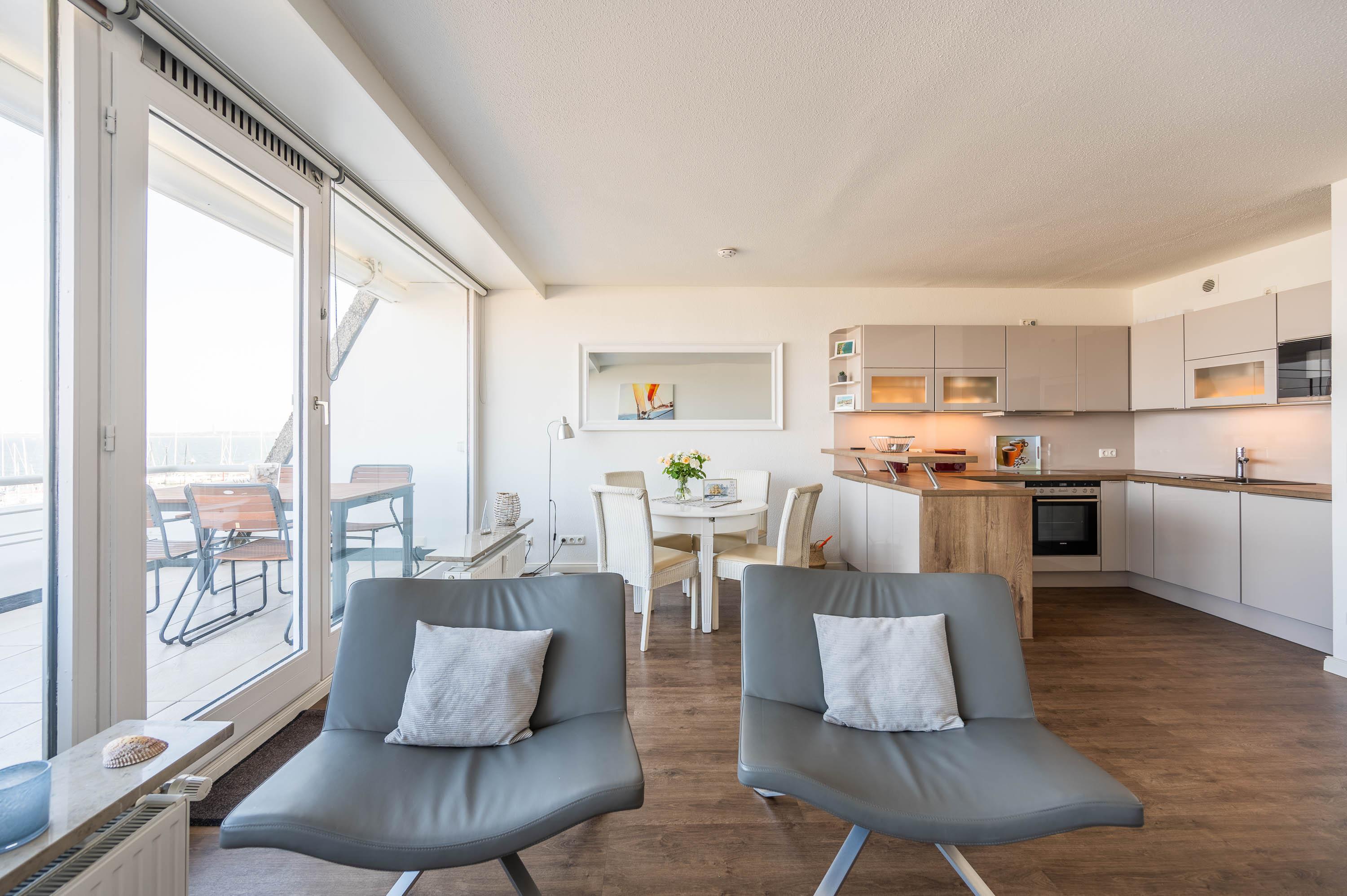 Die Unterkunft lässt sich durch Rollos abdunkeln. Mit ein paar Handgriffen lässt sich die Couch in ein Schlafsofa mit der Liegefläche von 135x200cm umbauen. Hier kann eine Person zusätzlich übernachten. Der 12qm² große Balkon verfügt über einen robusten Gartentisch sowie vier Stühle und zwei Loungesesseln. Von hier lässt sich wunderbar der Hafen und das Treiben auf der Ostsee beobachten. Vor der Morgen- und Mittagssonne schützt eine ausfahrbare Markise.