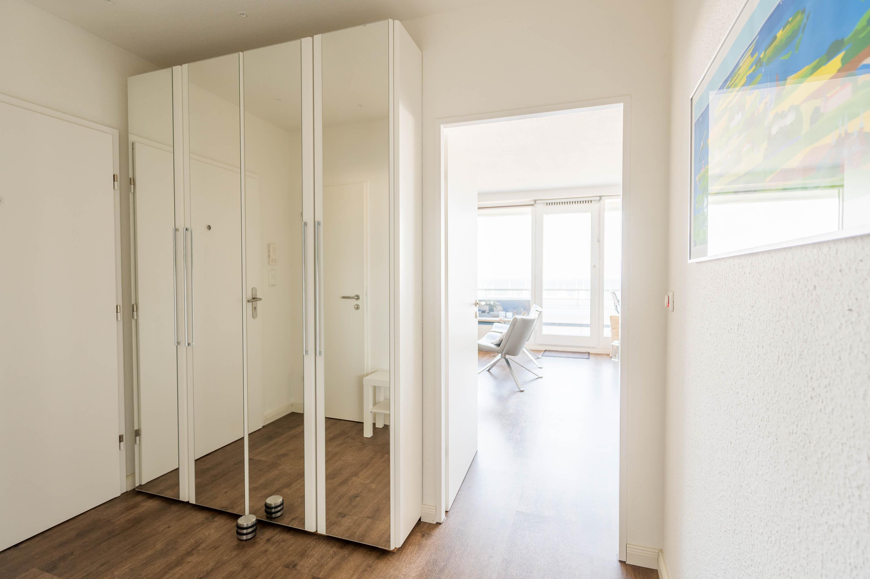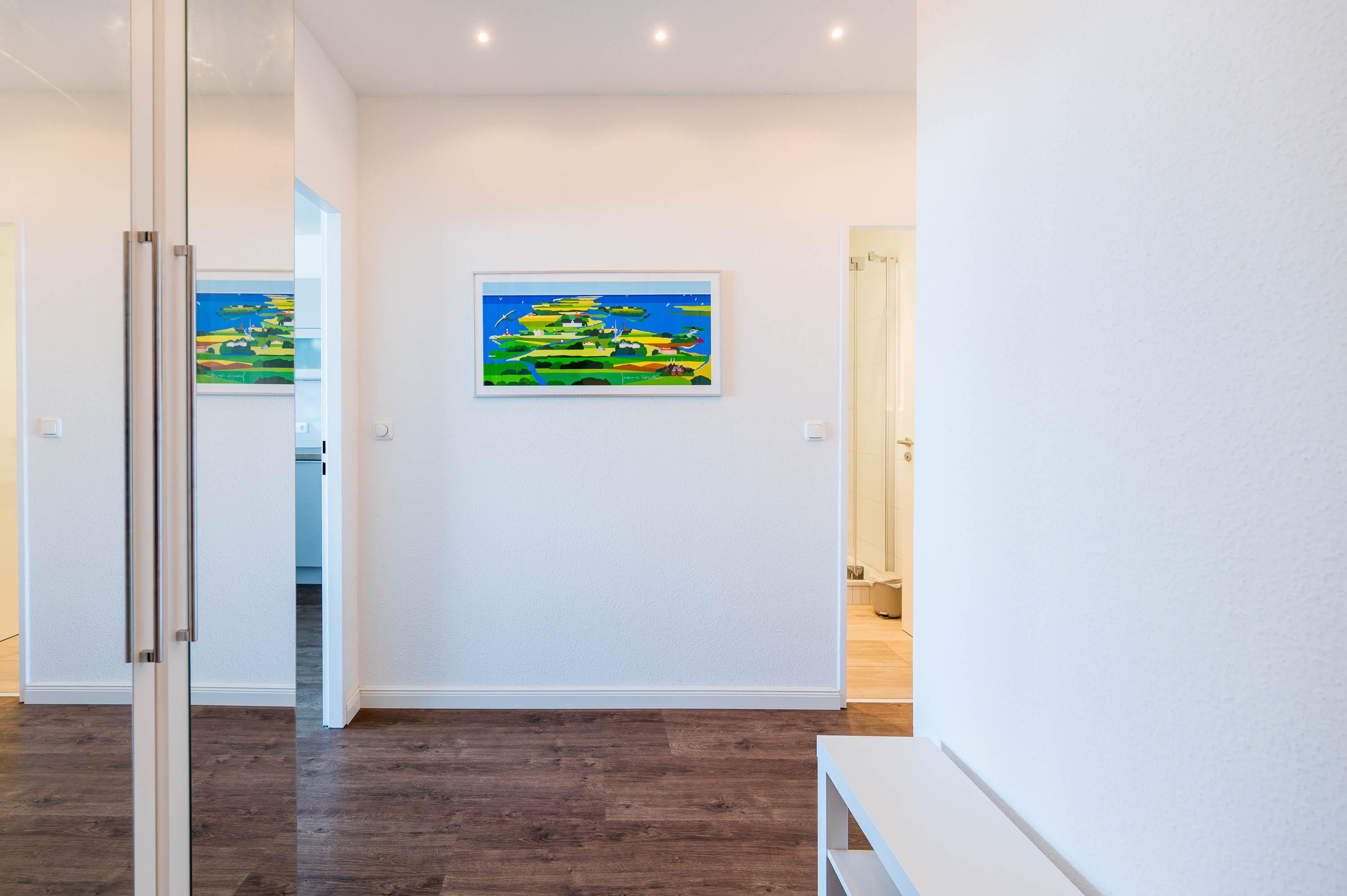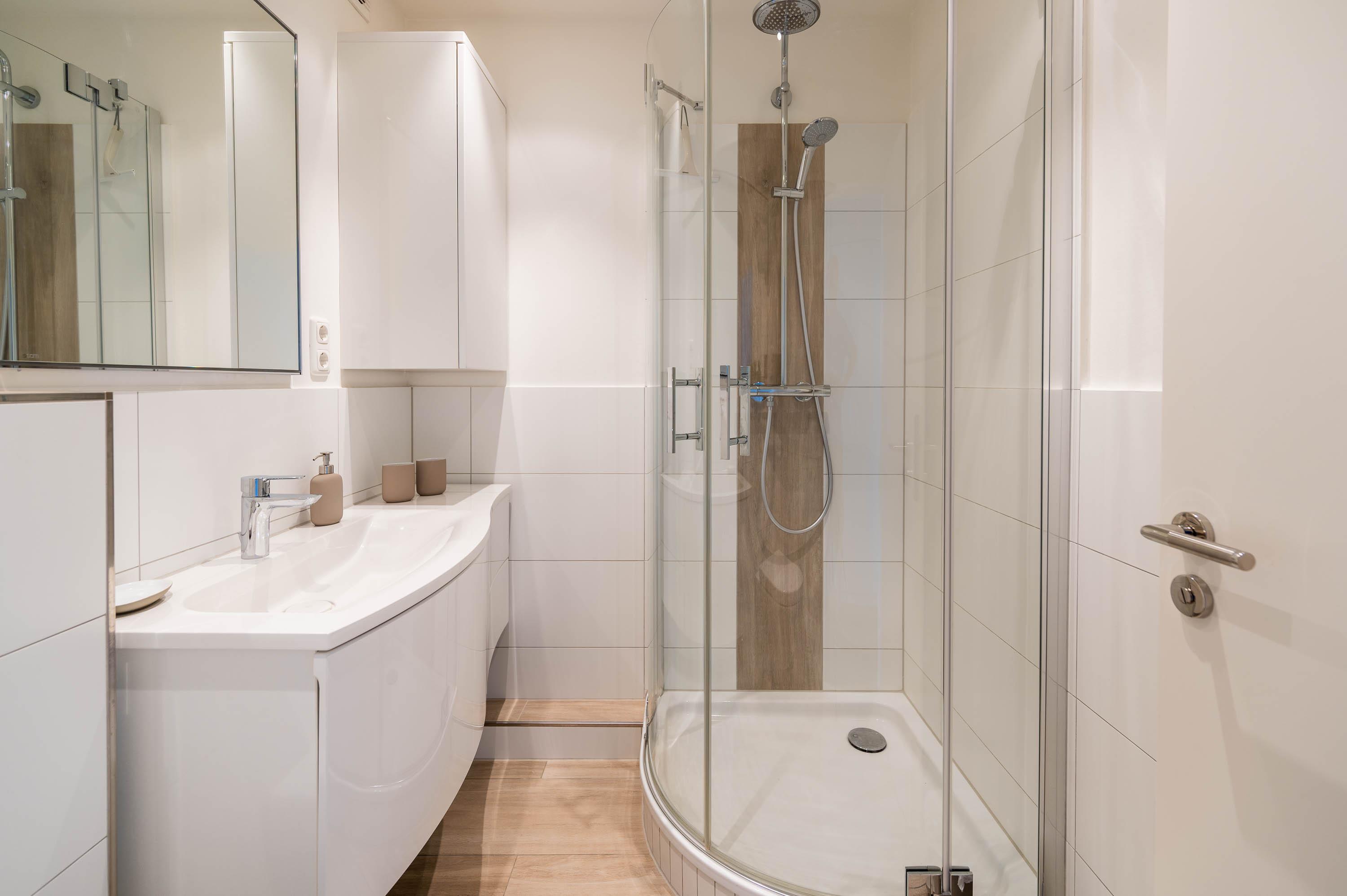 Am Eingangsbereich befindet sich eine kleine Abstellkammer, eine Garderobe und ein großer Kleiderschrank sowie das moderne Badezimmer mit Dusche, WC und genügend Stauraum. Abseits des Badezimmers wurde in der gesamten Ferienunterkunft ein Design Fußboden verlegt, der dem Apartment eine gemütliche Atmosphäre verleiht.