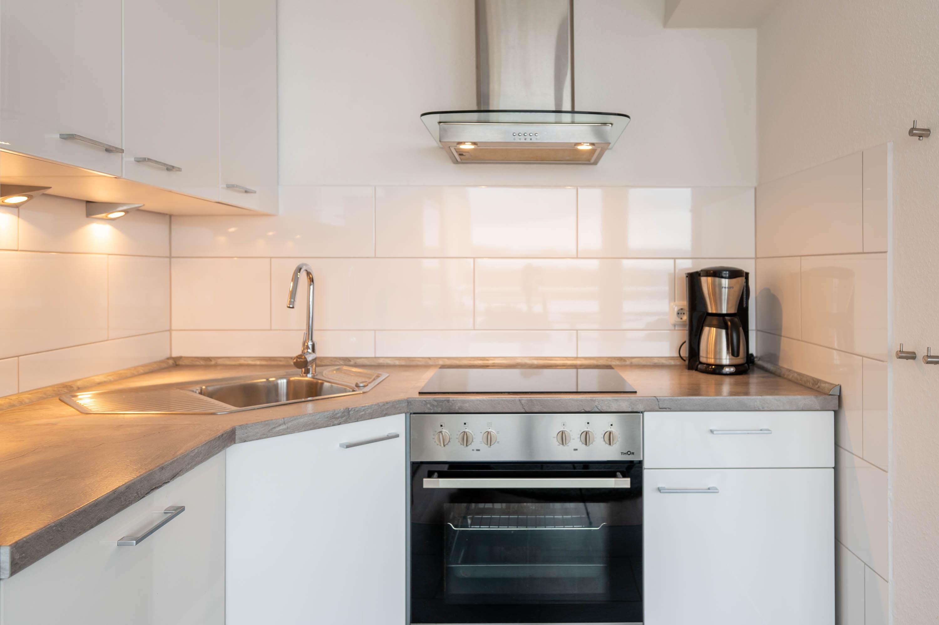 Die moderne Küche ist komplett eingerichtet, und hat alles, was man zum Kochen braucht: Es befindet sich in der Küche eine Geschirrspülmaschine, ein Backofen, ein Kühlschrank mit Gefrierfach und ein Herd. Gläser, Porzellan, Töpfe und Besteck sind für 4 Personen vorhanden. Die Ferienwohnung hat ein gemütliches Doppelbett (Liegefläche 160x200). Die Betten sind bei Ihrer Ankunft bezogen. Im Flur befindet sich ein Kleiderschrank mit Garderobe und eine kleine Abstellkammer.
