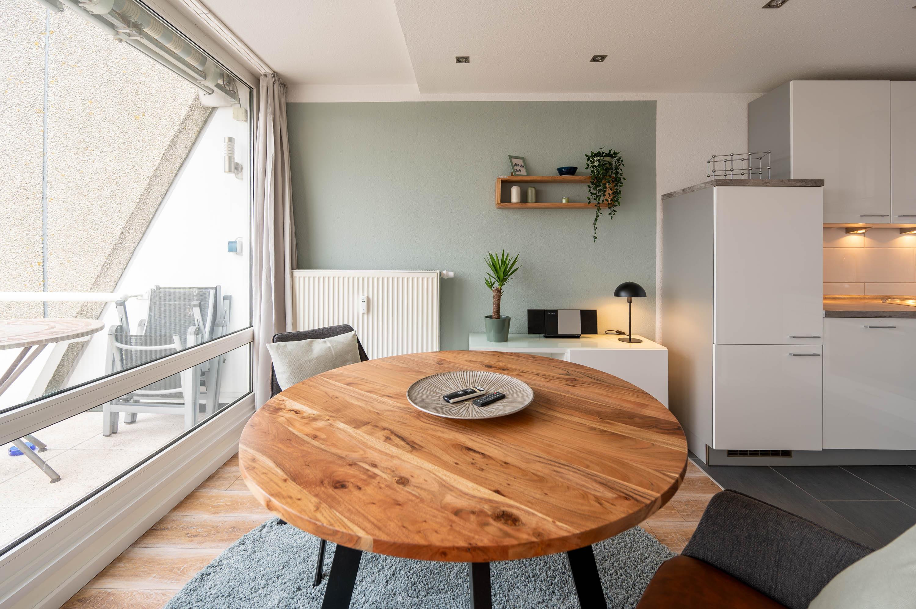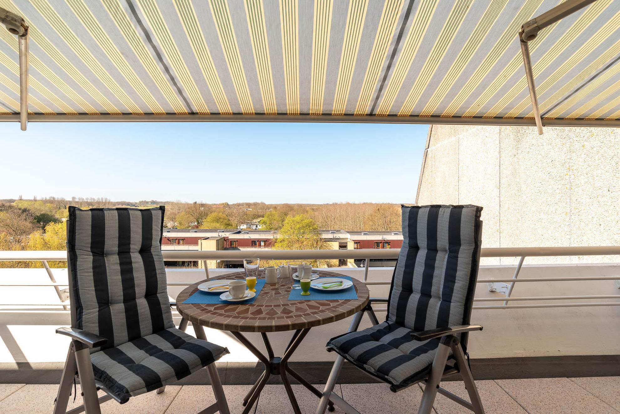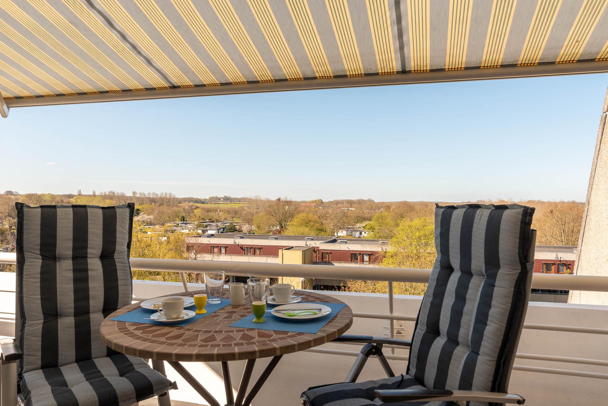Moderne Ferienwohnung mit Balkon und Blick auf Salzwiesen in Kiel-Schilksee, ideal für erholsame Tage zu zweit.