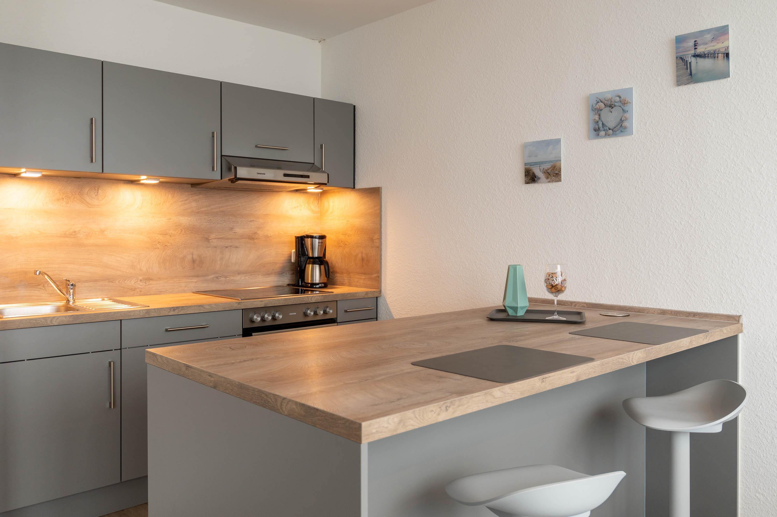Der Wohnbereich mit zwei gemütlichen Sesseln und einem Flachbild-TV bieten Raum für entspannte Fernsehabende im Apartment. Die angrenzende Küchenzeile ist mit einem Geschirrspüler, Ceran-Kochfeld und einem Kühlschrank mit Gefrierfach ausgestattet, so dass sich die Pantry-Küche für gemeinsame Kochaktionen eignet. Im Sommer lässt es sich zudem herrlich bei aufgehender Sonne auf dem Balkon frühstücken. Hierzu stehen zwei Gartenstühle und ein Tisch bereit.