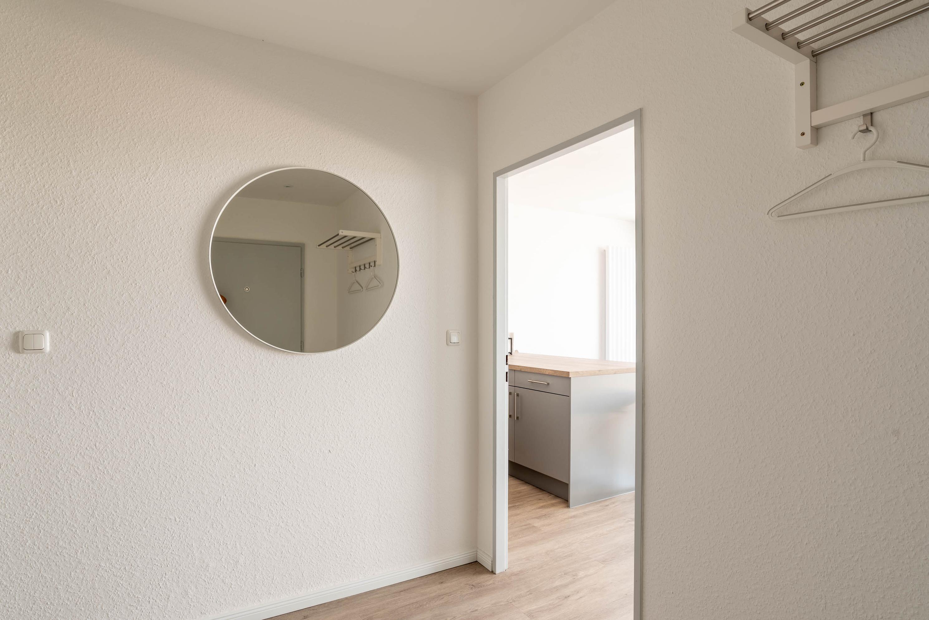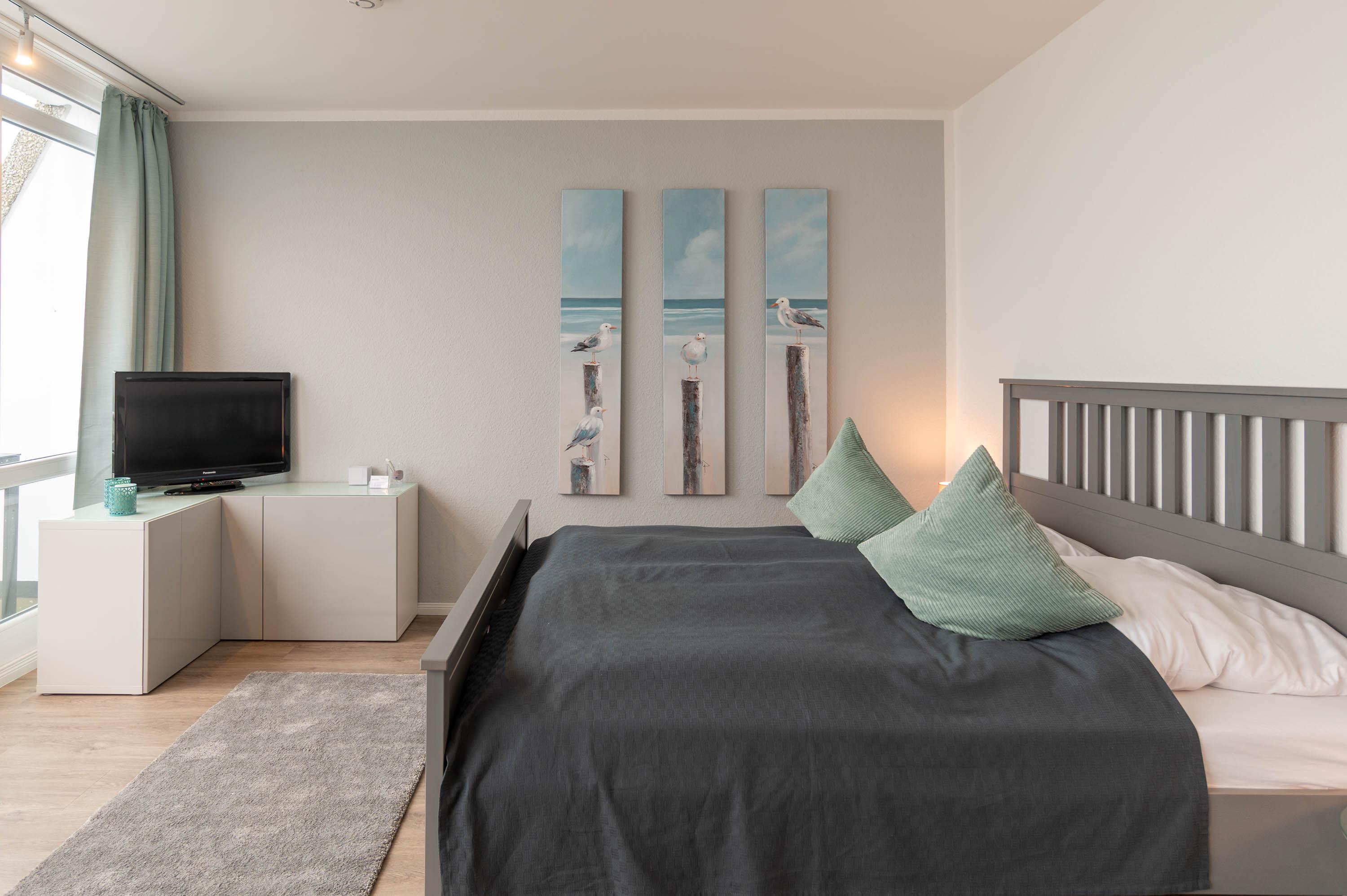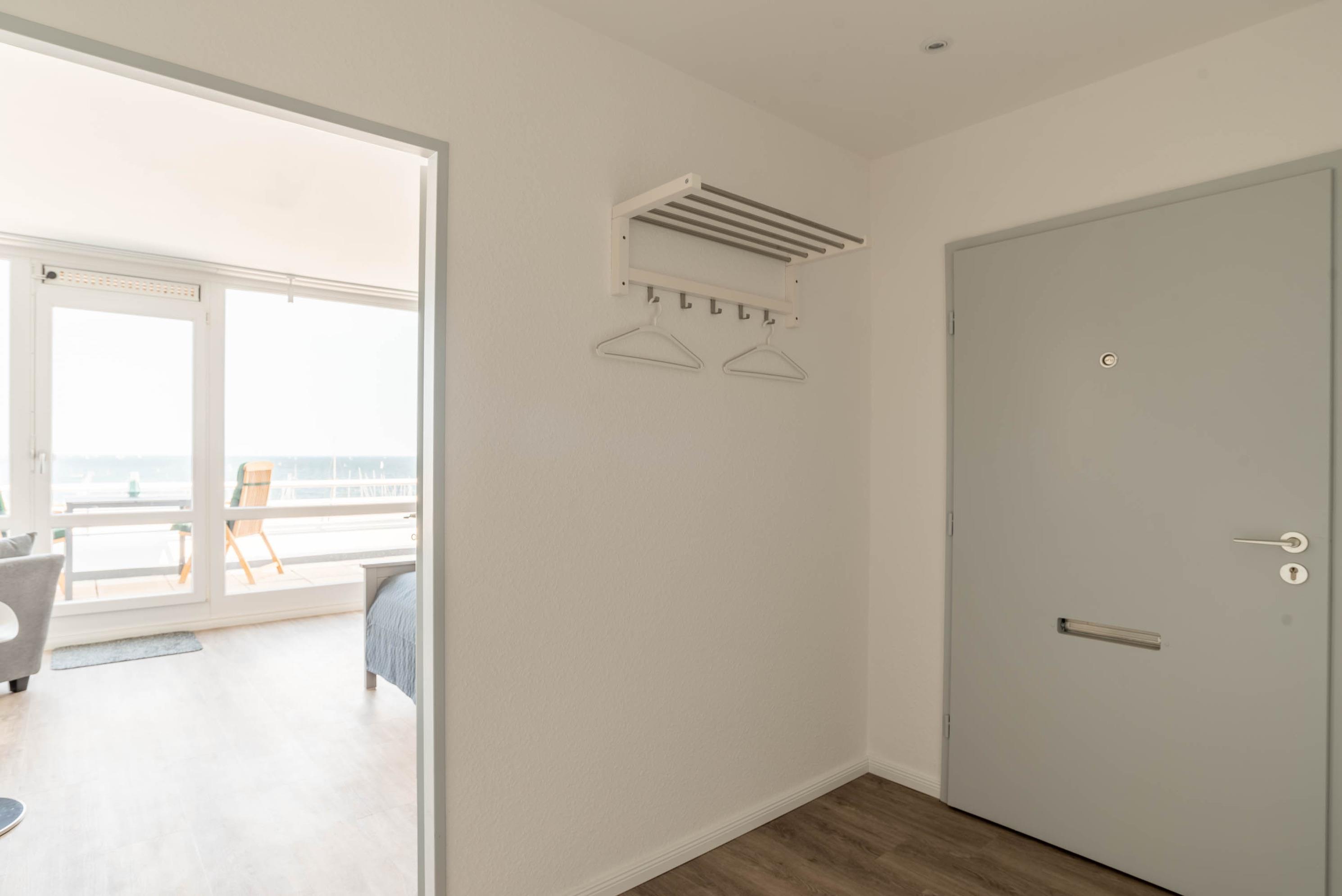 Das Appartment wurde mit viel Liebe zum Detail eingerichtet. Schon der große Eingangsbereich lädt ein sich direkt wie zu Hause zu fühlen. Ein Kleiderschrank und die Flurgarderobe bieten ausreichend Verstau- und Ablagemöglichkeiten. Es erwartet Sie vom Flur ausgehend ein helles, modernes Badezimmer mit großer Dusche. Durch den Flur gelangen Sie in das Wohn- und Schlafzimmer. Gleich am Eingang des Zimmers hat man einen atemberaubenden Blick auf den Hafen und Strand, welcher den Namen der Ferienwohnung alle Ehre macht.