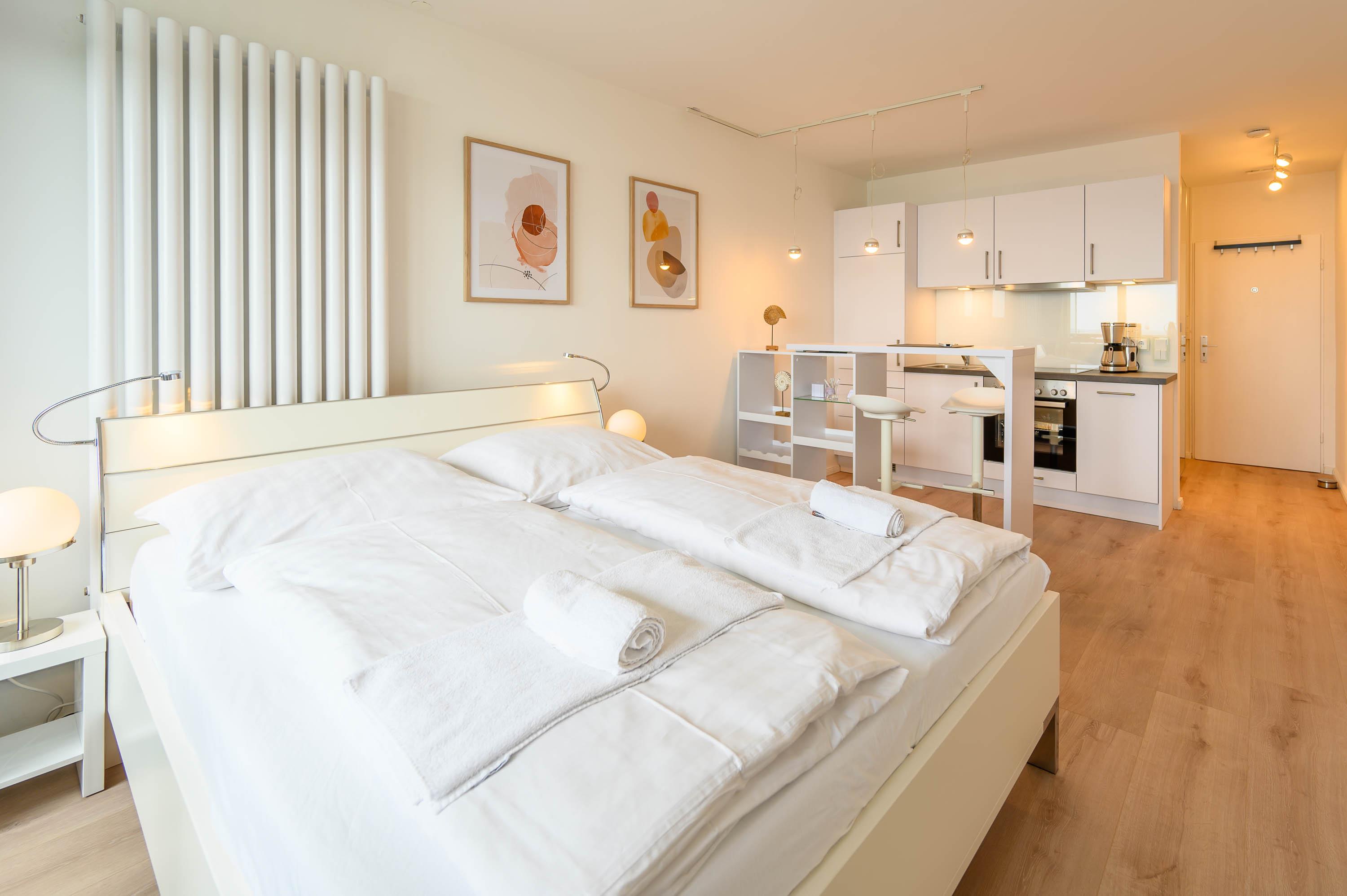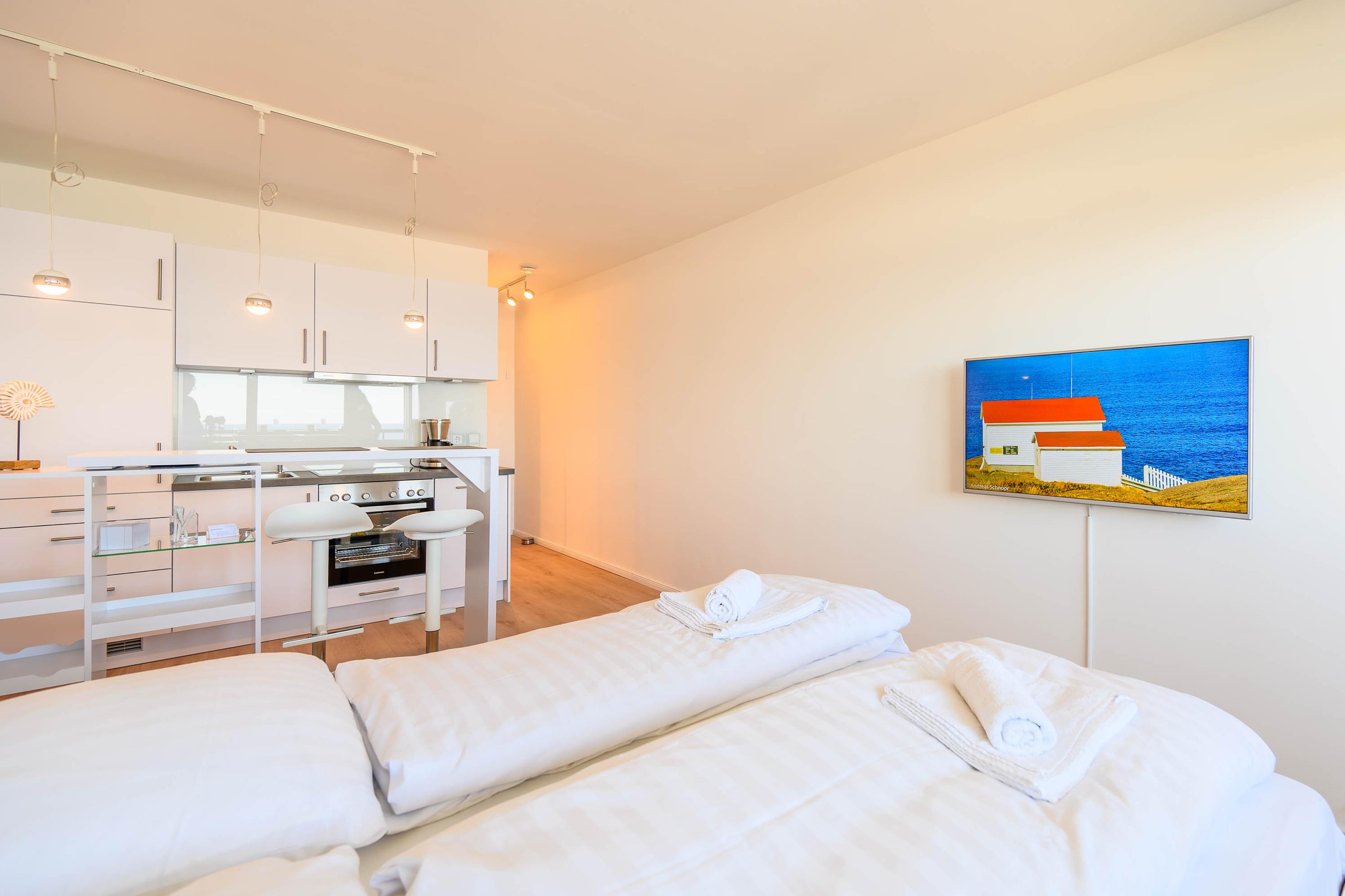 Der Wohnbereich verfügt über ein Doppelbett (160 x 200 cm). Darüber hinaus besitzt die Wohnung einen Balkon (6 m2), direkt begehbar über den Wohnbereich. Da der Balkon eine Verglasung hat, kann man den Balkon bei jedem Wetter nutzen. Unser Tipp: Frühstücken Sie hier morgens bei Sonnenschein und planen Sie Ihren Tag mit dem wunderbaren Blick auf die Schilkseer Bucht.