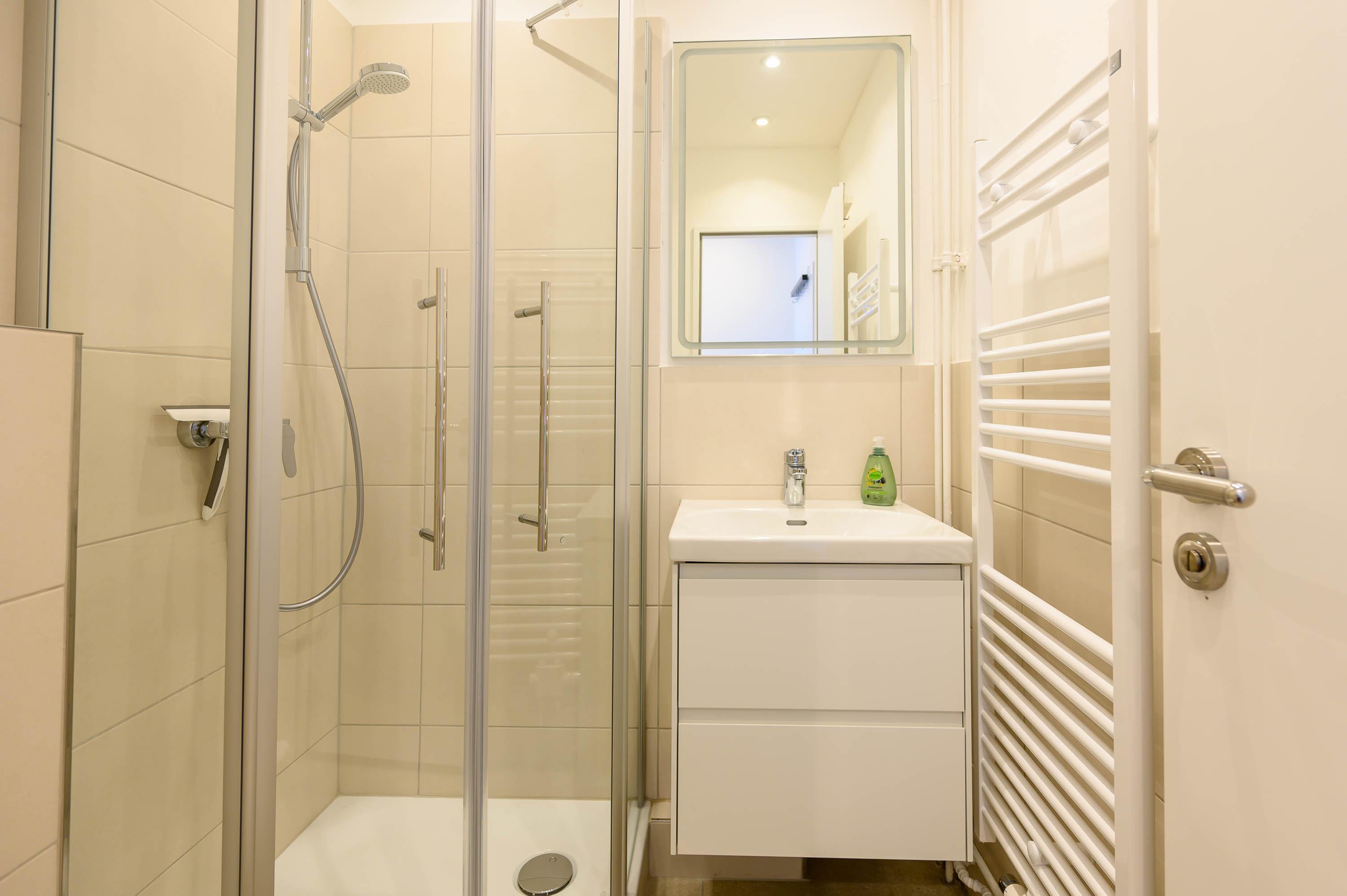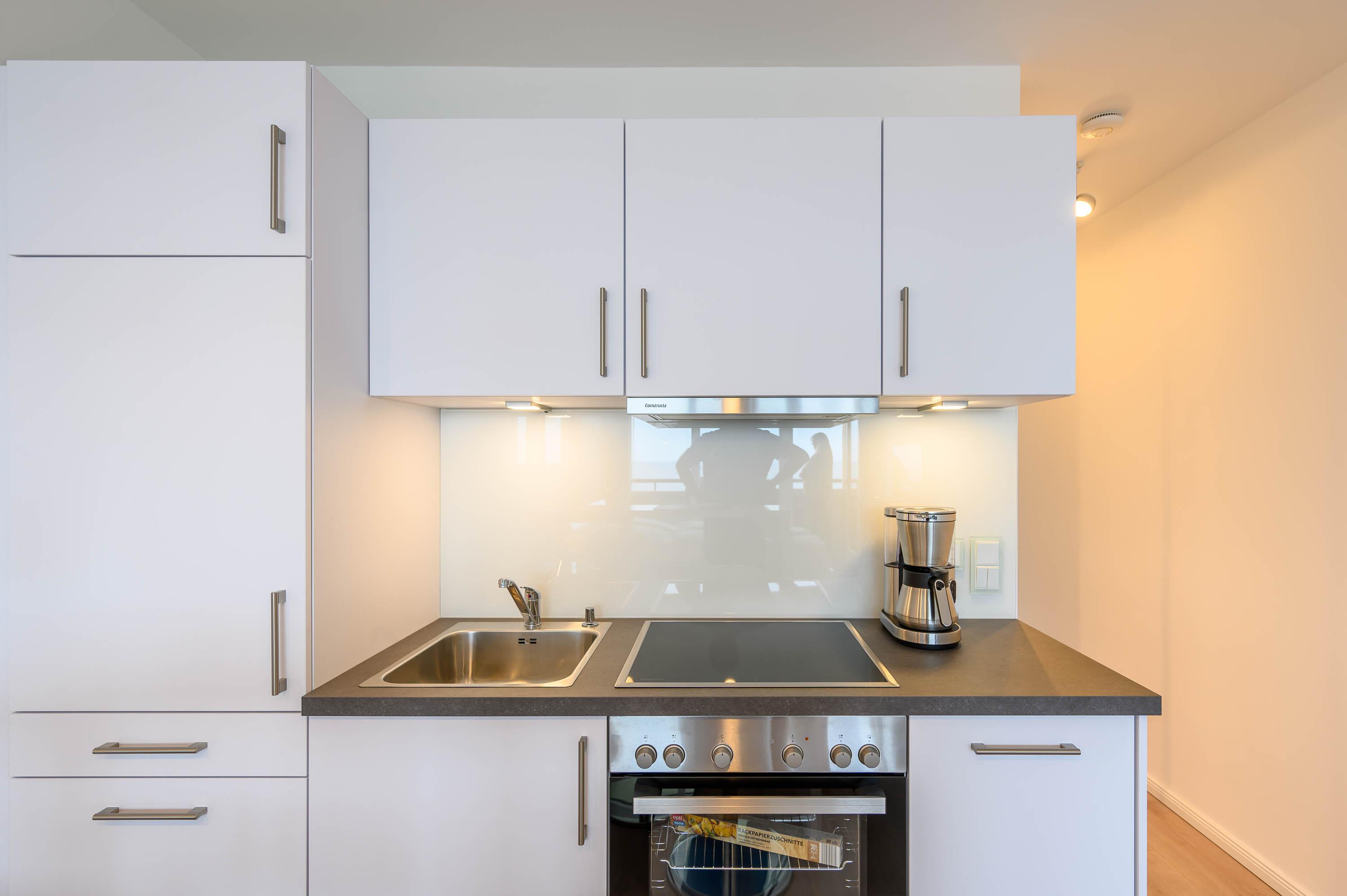 In der zum Wohn- und Essbereich angrenzenden Küchenzeile, ausgestattet für den täglichen Bedarf, stehen ein Kühlschrank als auch ein Ceranfeld für Sie zur Verfügung. Das innenliegende Badezimmer besticht durch seine sandfarbene, helle Optik. Neben einem WC ist auch ein Waschbecken vorhanden, dessen Unterschrank mit zwei Schubladen ausreichend Stauraum bietet. Die Dusche sorgt für einen bequemen Zugang und die Trennwände für uneingeschränktes Duschvergnügen.