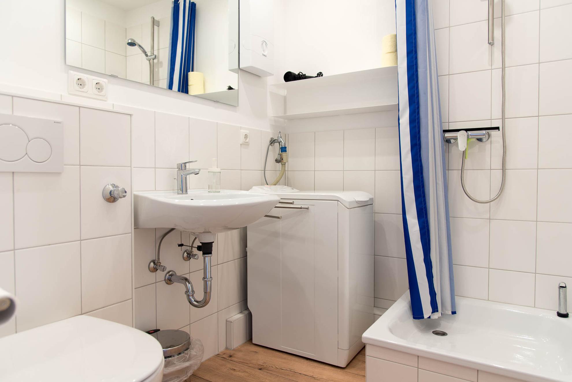 Das moderne Badezimmer ist vom Flur aus zu erreichen und ist auch mit Holzfußboden ausgelegt. Neben einer Dusche, einem WC, Waschbecken und einem großen Spiegel verfügt das Badezimmer zusätzlich über eine Waschmaschine.