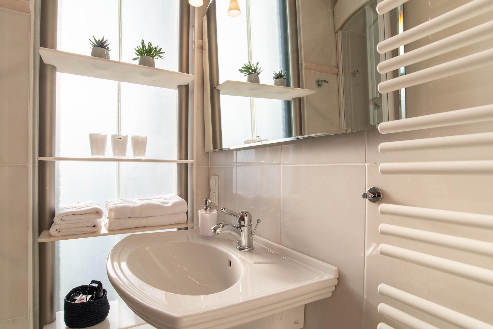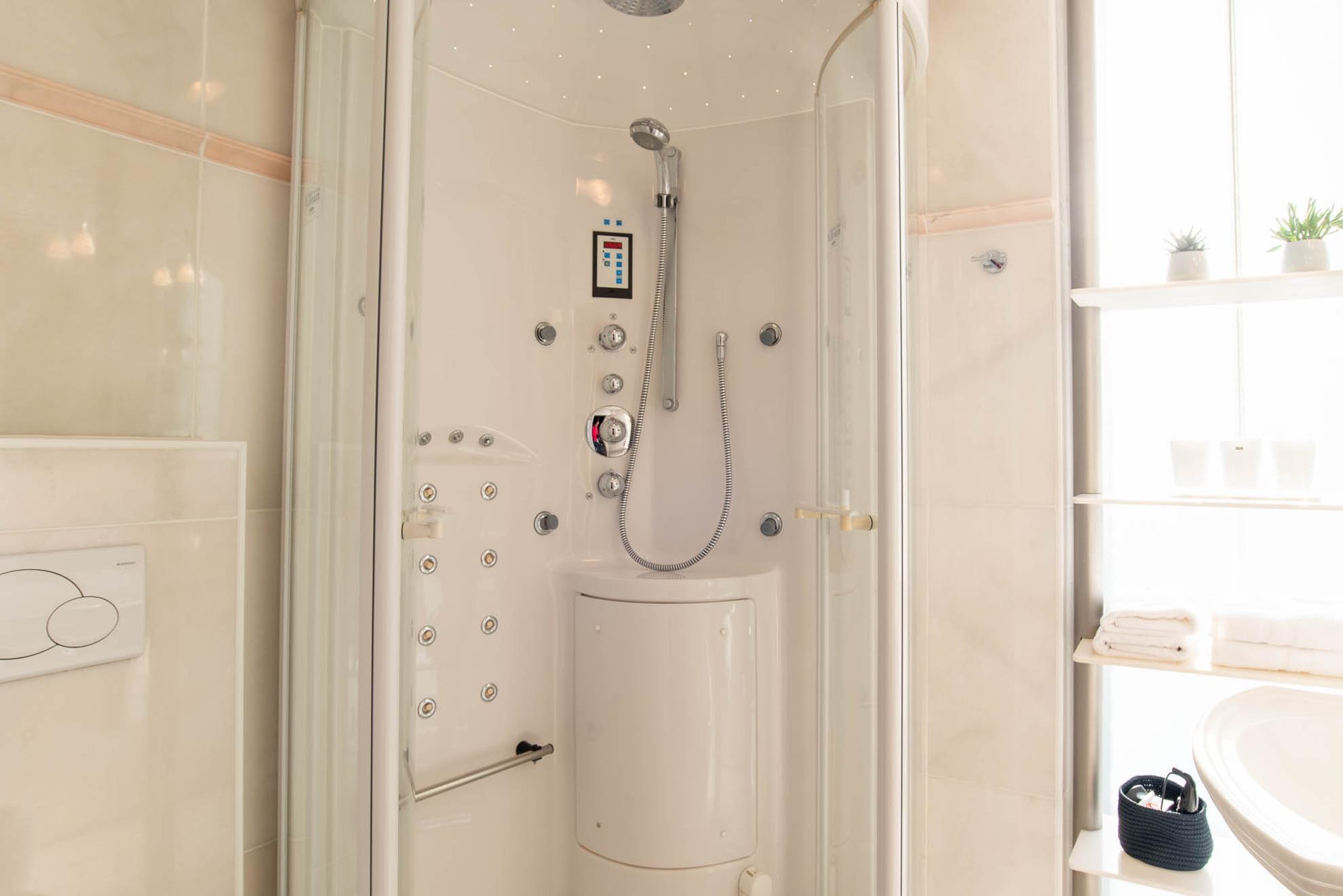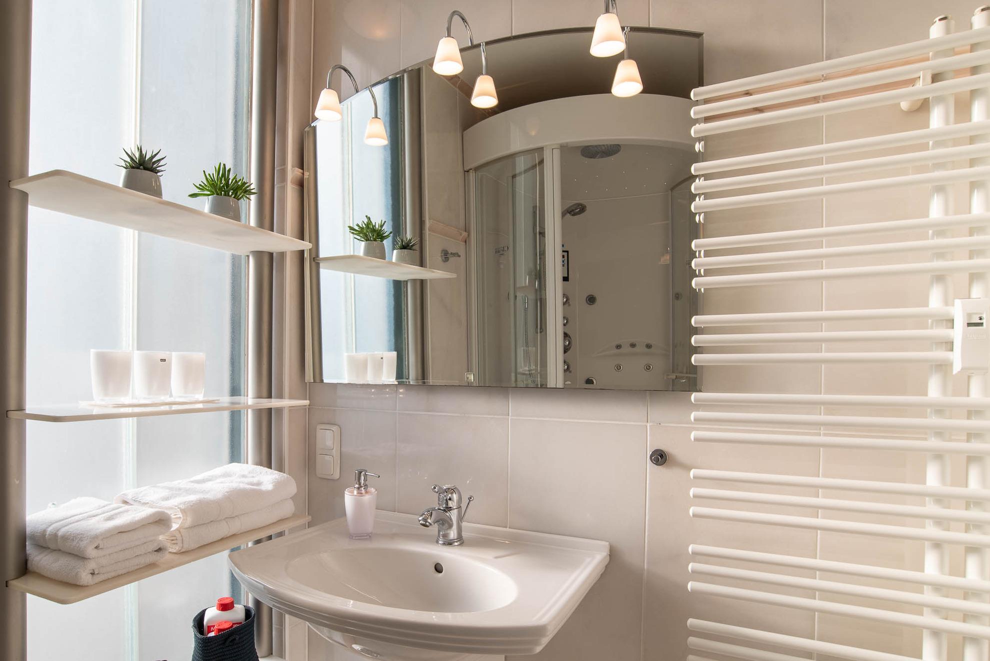 Das Badezimmer besticht neben einem Waschbecken und einem WC durch eine Handtuchheizung und einer Dampfregendusche.