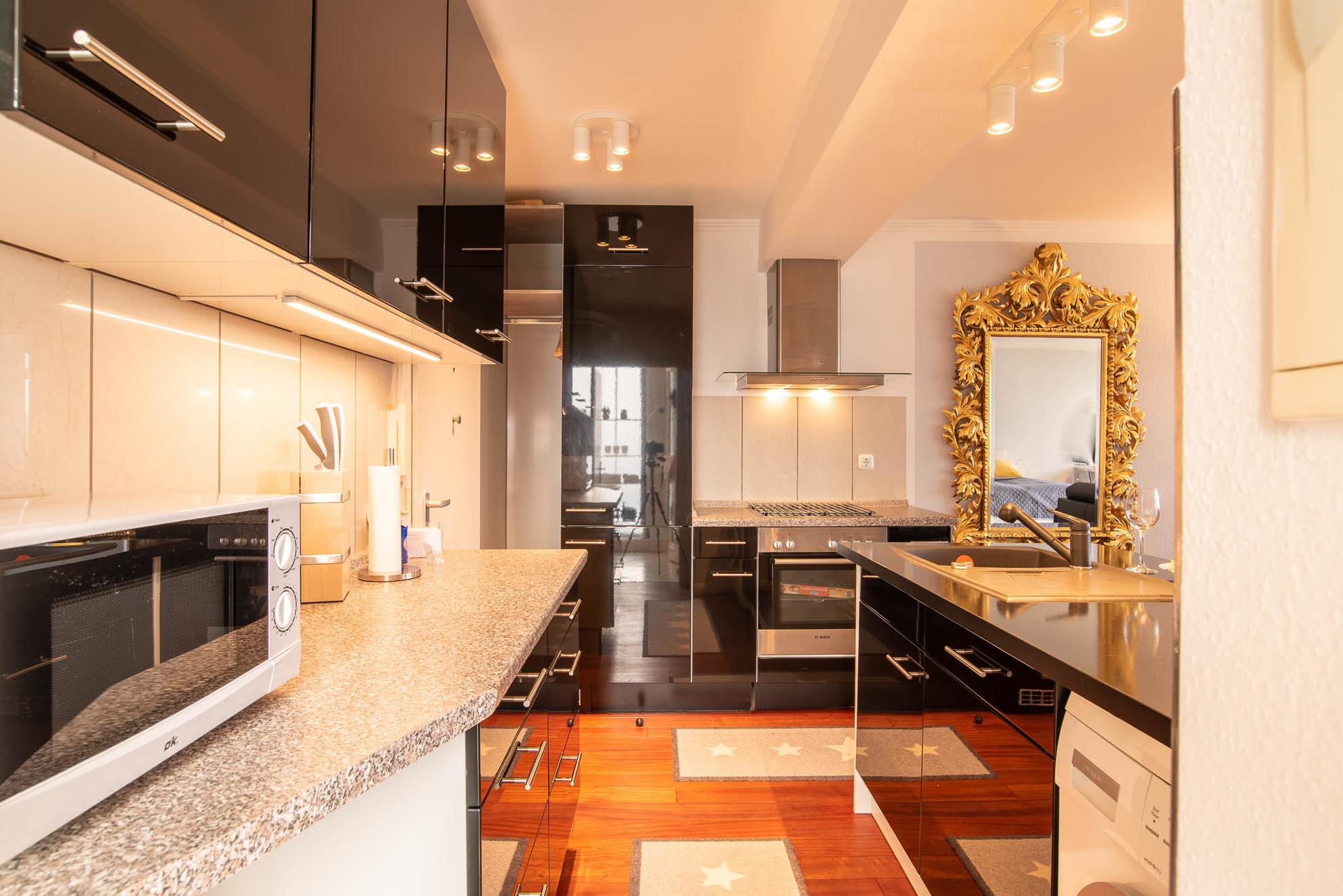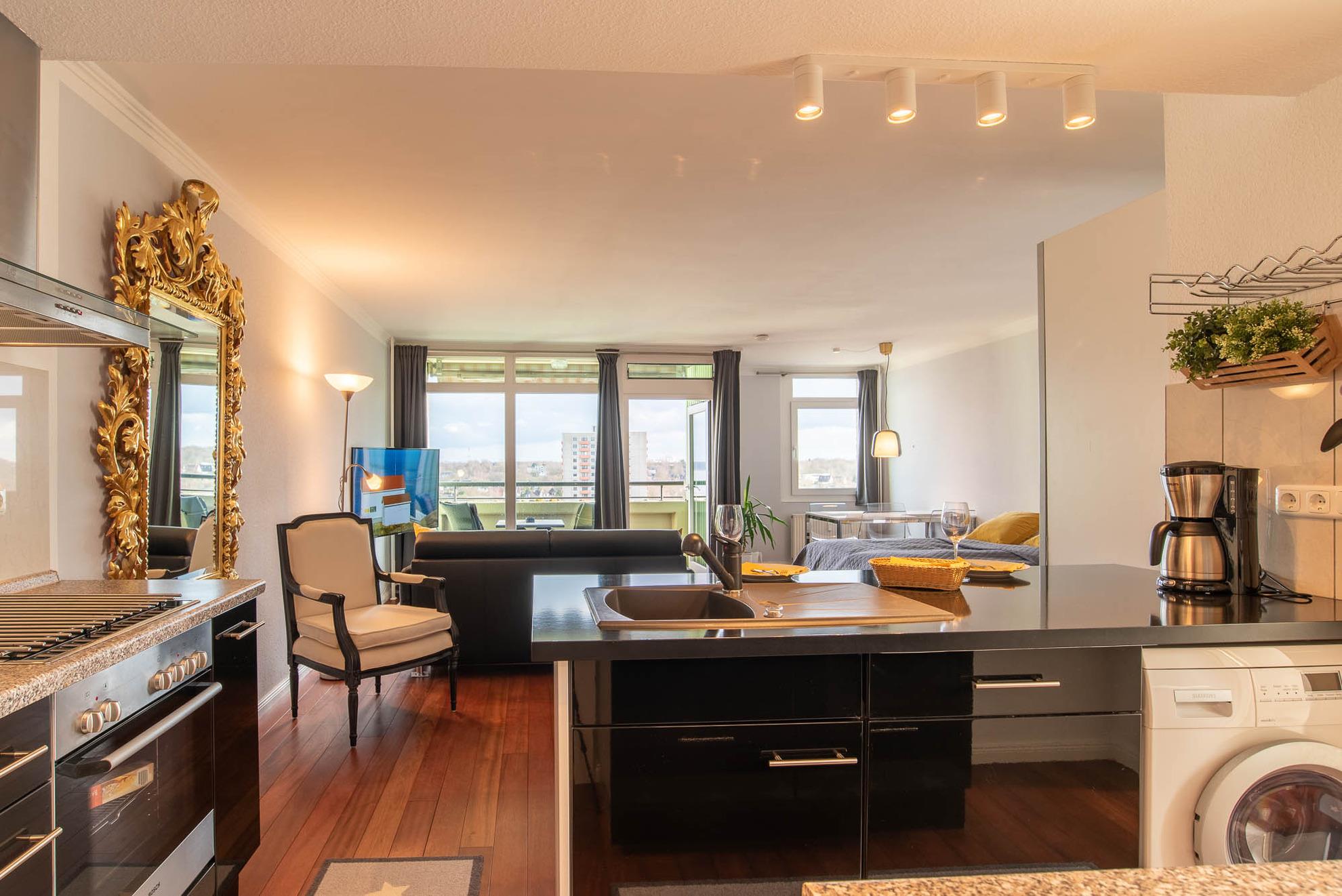 Beim Betreten dieser Wohnung erleben Sie direkt den Charme einer Loftwohnung: Im Eingangsbereich befindet sich eine moderne Hochglanzküche. Im chicen schwarz glänzt diese Küchenlandschaft nicht nur durch ihr Äußeres. Neben der funktionalen Grundausstattung, wie einem großen Kühlschrank mit Gefrierfach, einer Geschirrspülmaschine, einer Mikrowelle und einer Waschmaschine, verfügt diese geräumige, offene Küche über eine Kochinsel mit Barhockern. Hier können Sie gemütliche Kochabende in toller Atmosphäre stattfinden lassen. Aber auch ein Esstisch mit 4 Stühlen steht Ihnen zur Verfügung. Dieser befindet sich im kleinen Erker der Ferienwohnung.
