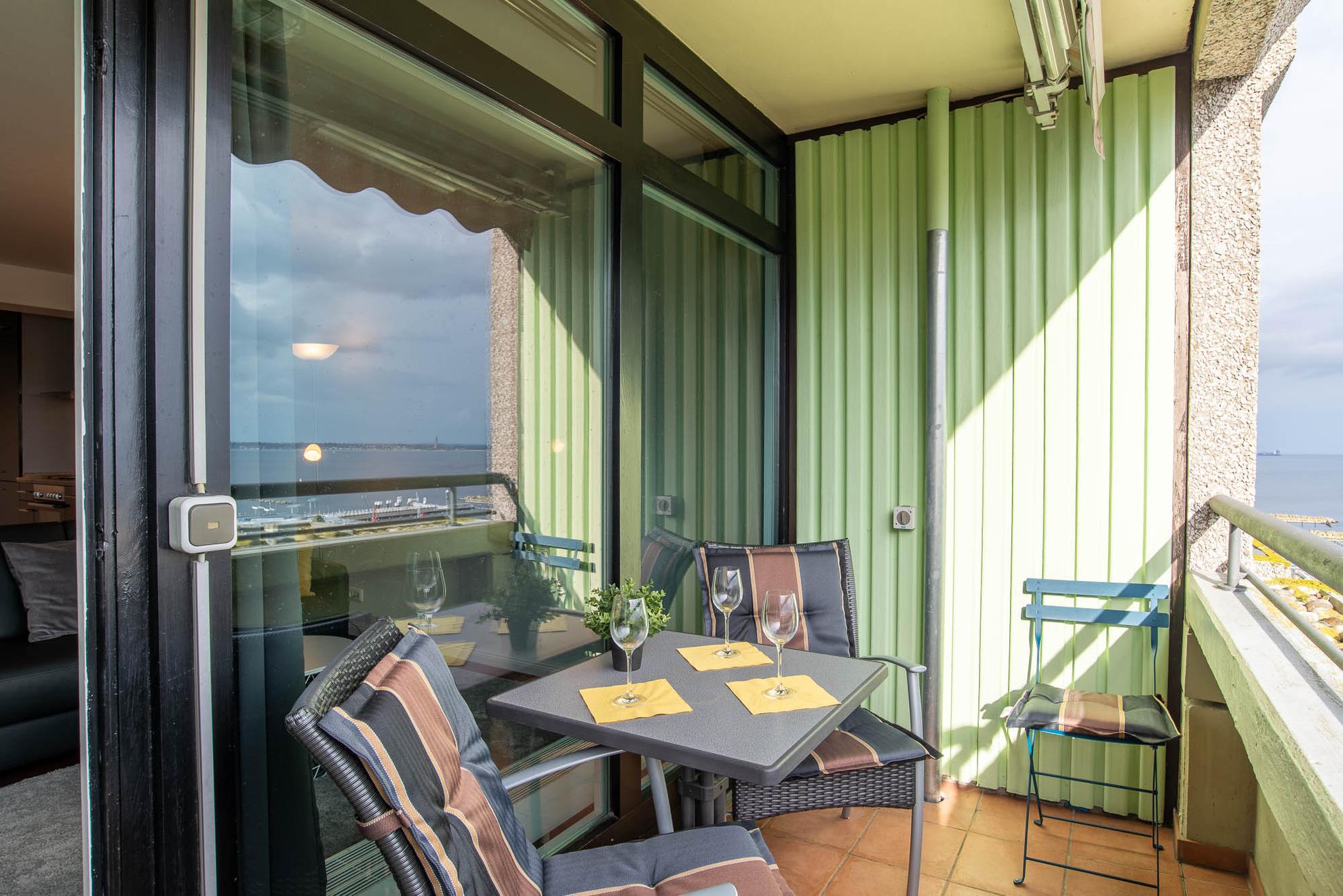 Vom angrenzenden Balkon der Ferienwohnung aus haben Sie einen großartigen Rundumblick über den Hafen und die Kieler Förde. Lassen Sie Ihren Blick schweifen vom Meer zu Ihrer Linken bis in die Natur mit den Salzwiesen zu Ihrer Rechten. 2 Gartenstühle sowie ein Tisch sind vorhanden.