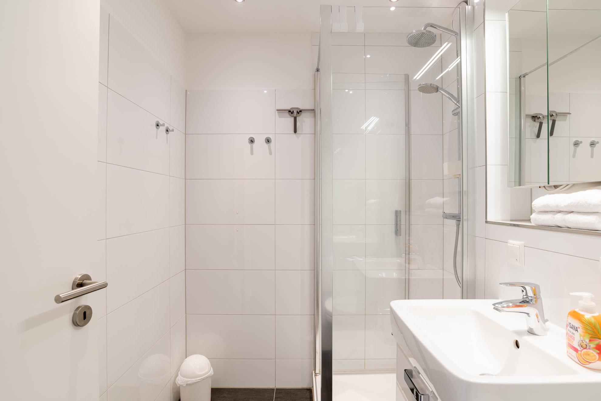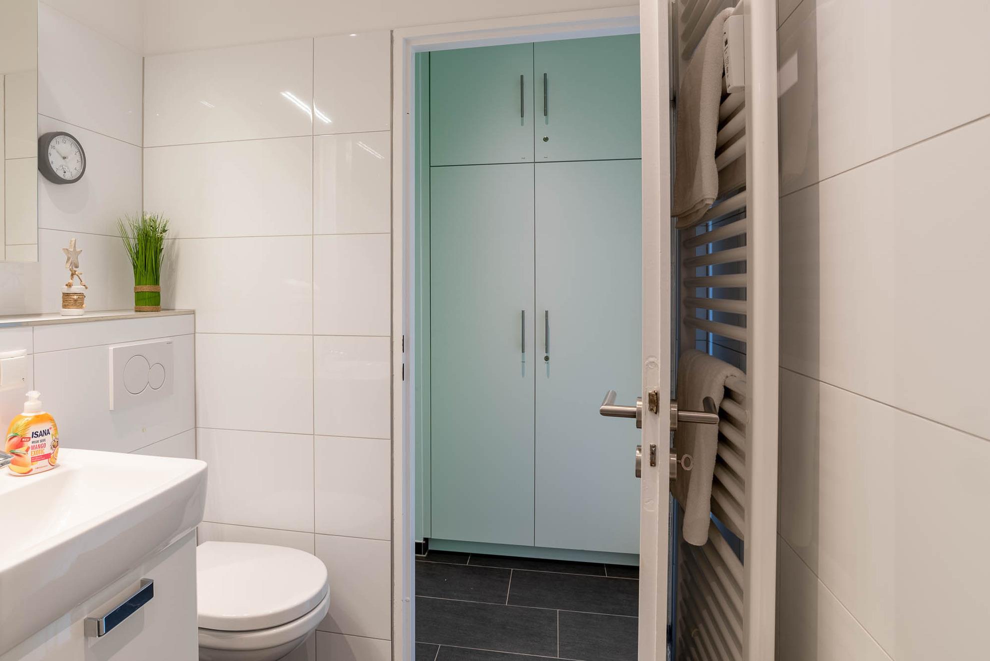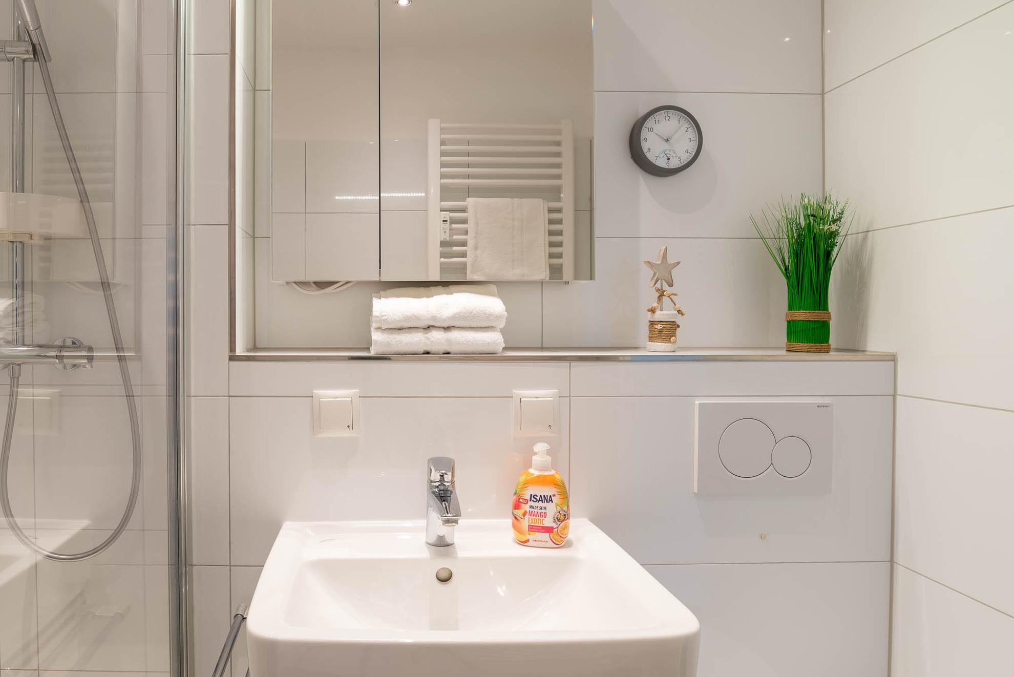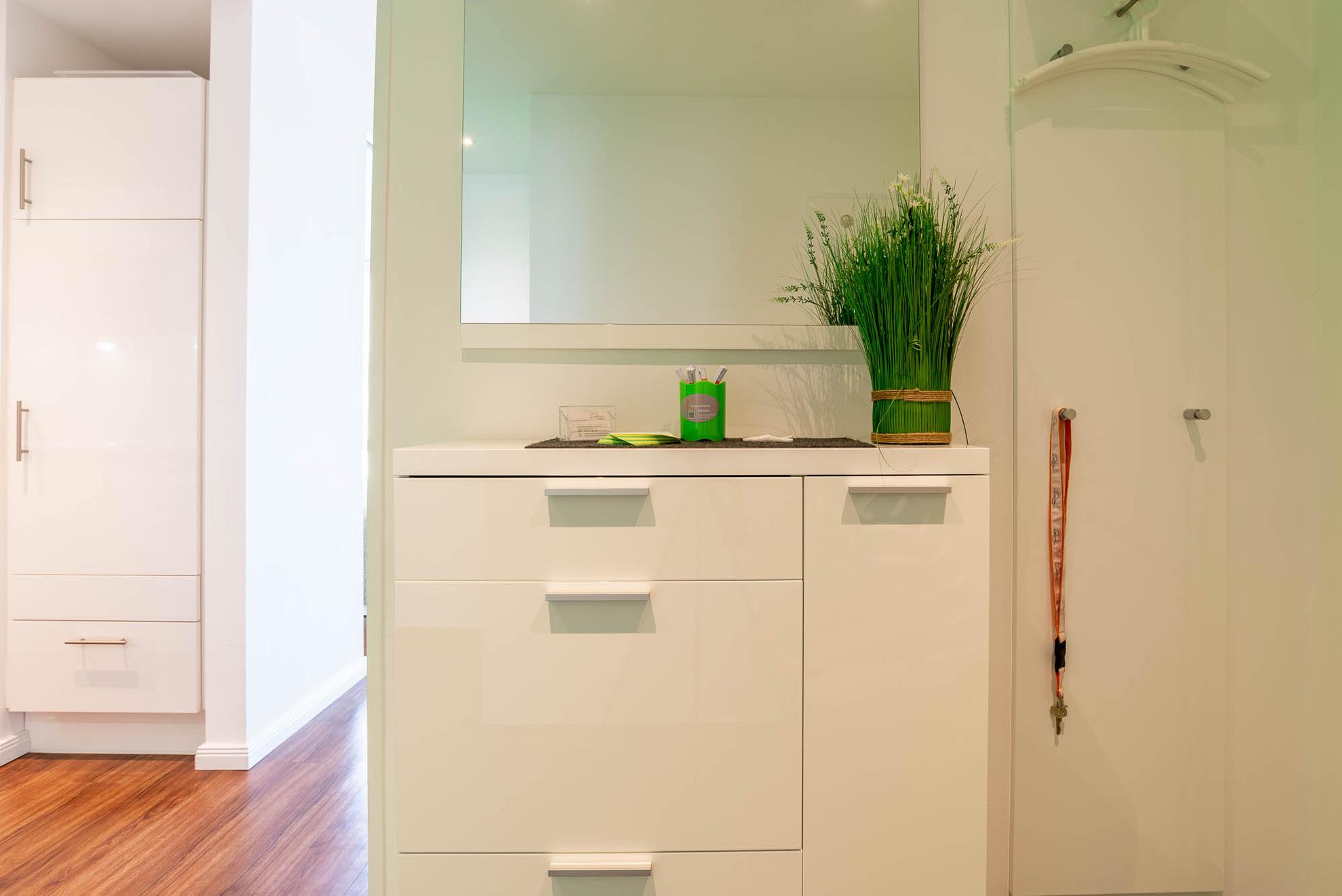 Bei der Ankunft im Apartment bietet der große Flur genügend Platz, um sich wohlzufühlen. Wiederkehrende grüne Farbakzente finden sich im Flur und gesamten Wohnbereich wieder. Vom Flur aus gelangen Sie in das moderne Badezimmer. Es bietet über genügend Ablagemöglichkeiten, sowie eine Handtuchheizung. Als weiteres Highlight befindet sich in der Dusche eine Regenwalddusche.