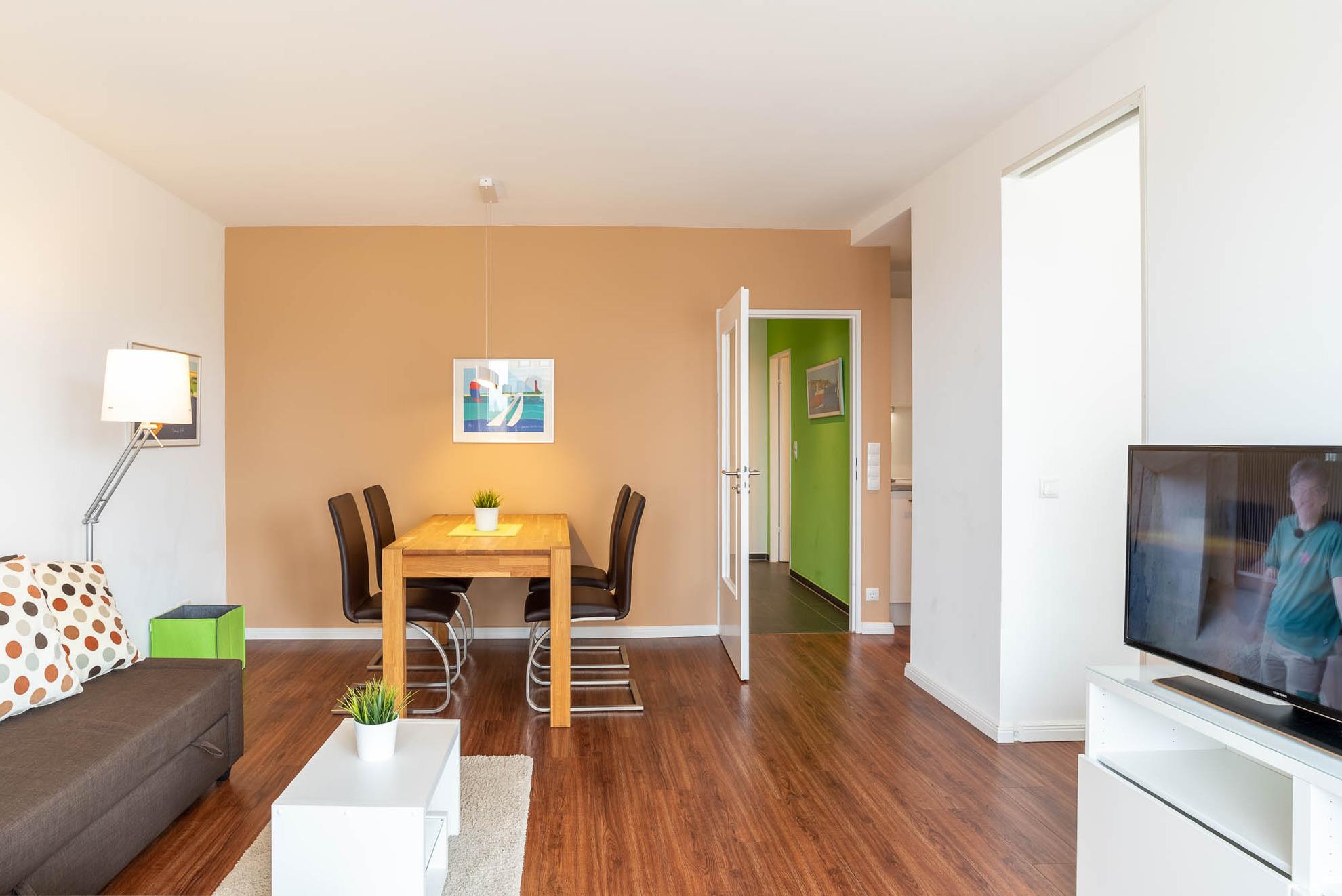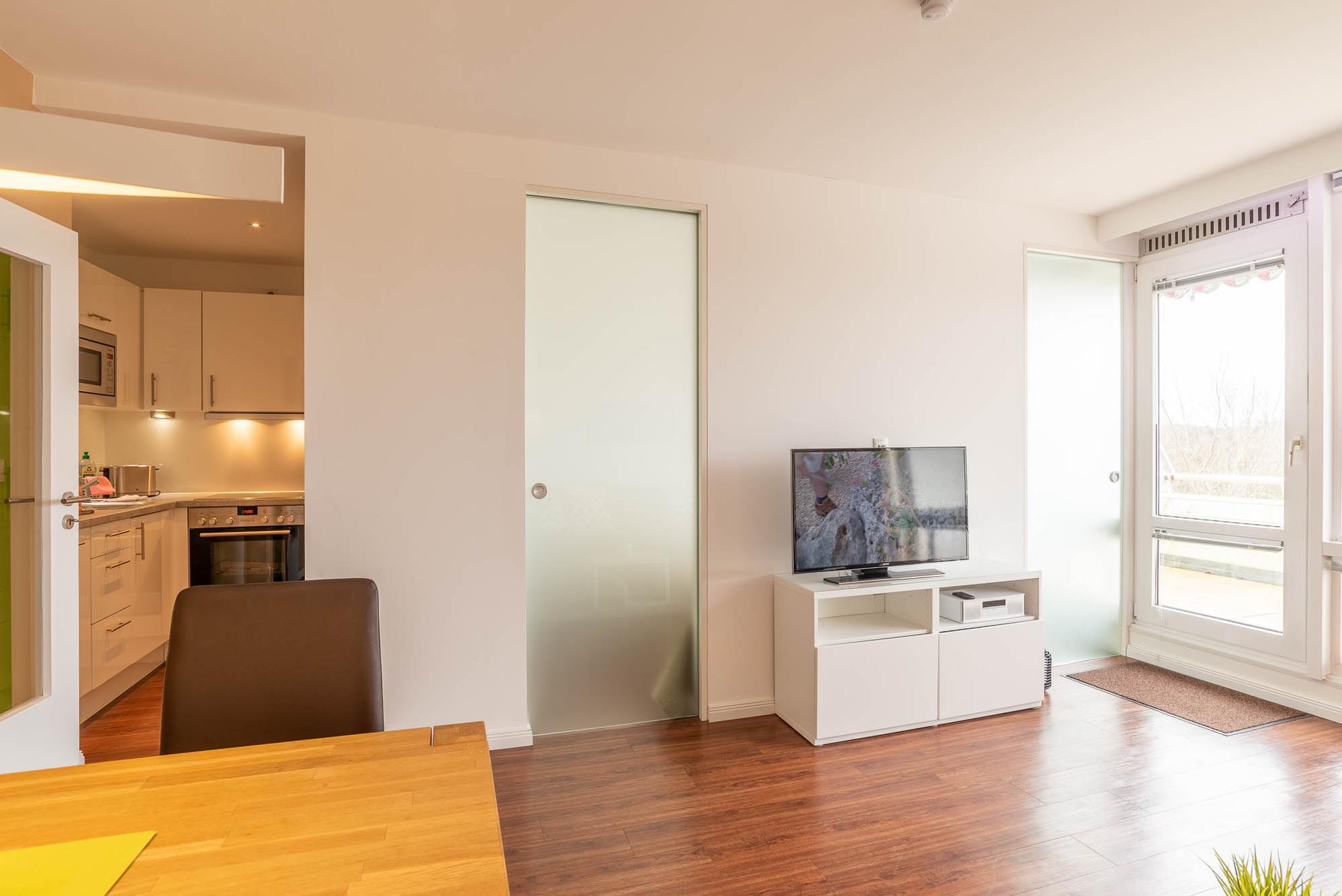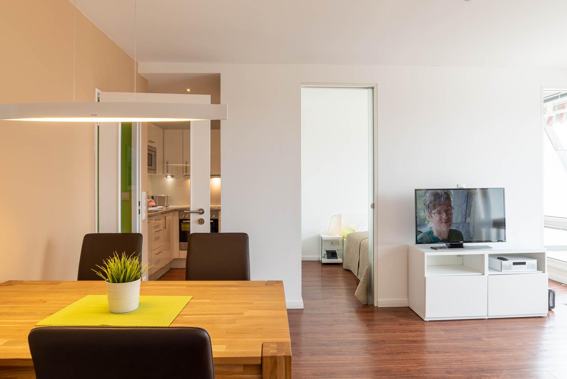 Der helle Wohn-Essbereich ist mit einer gemütlichen Couch eingerichtet. Der an der Wand angebrachte Flat-TV ermöglicht entspannte Film- und Fernsehabende in der Wohnung zu verbringen. Kostenloses WLAN und ein Bluetooth-Radio finden Sie ebenfalls in diesem Apartment vor. Das durch zwei Milchglas Schiebetüren vom Wohnbereich abgetrennte Schlafzimmer lässt sich selbstverständlich, wie auch der Rest des Apartments, durch angebrachte Gardinen und Jalousien abdunkeln. Auch im Schlafzimmer ist vor dem Doppelbett (160x200) ein Flachbildschirm für Sie angebracht. Ein Einbauschrank mit genügend Stauflächen ist ebenfalls vorhanden.