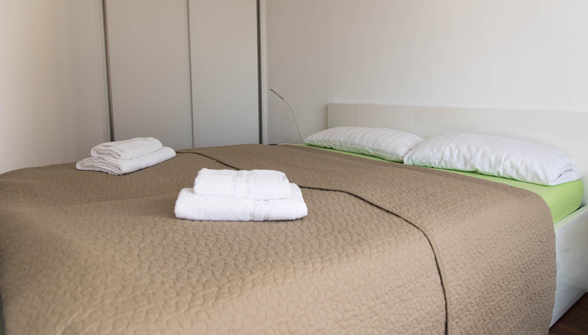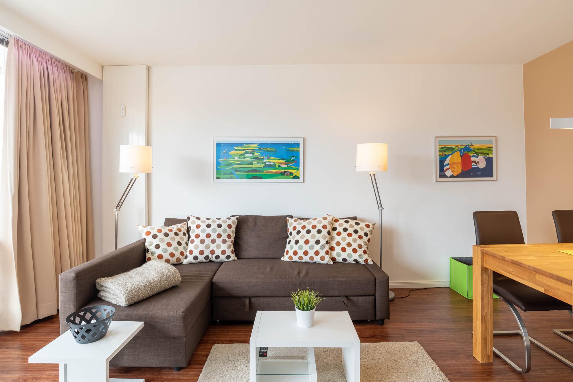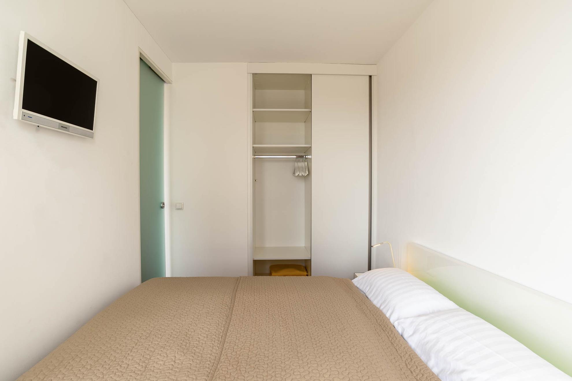 Der helle Wohn-Essbereich ist mit einer gemütlichen Couch eingerichtet. Der an der Wand angebrachte Flat-TV ermöglicht entspannte Film- und Fernsehabende in der Wohnung zu verbringen. Kostenloses WLAN und ein Bluetooth-Radio finden Sie ebenfalls in diesem Apartment vor. Das durch zwei Milchglas Schiebetüren vom Wohnbereich abgetrennte Schlafzimmer lässt sich selbstverständlich, wie auch der Rest des Apartments, durch angebrachte Gardinen und Jalousien abdunkeln. Auch im Schlafzimmer ist vor dem Doppelbett (160x200) ein Flachbildschirm für Sie angebracht. Ein Einbauschrank mit genügend Stauflächen ist ebenfalls vorhanden.