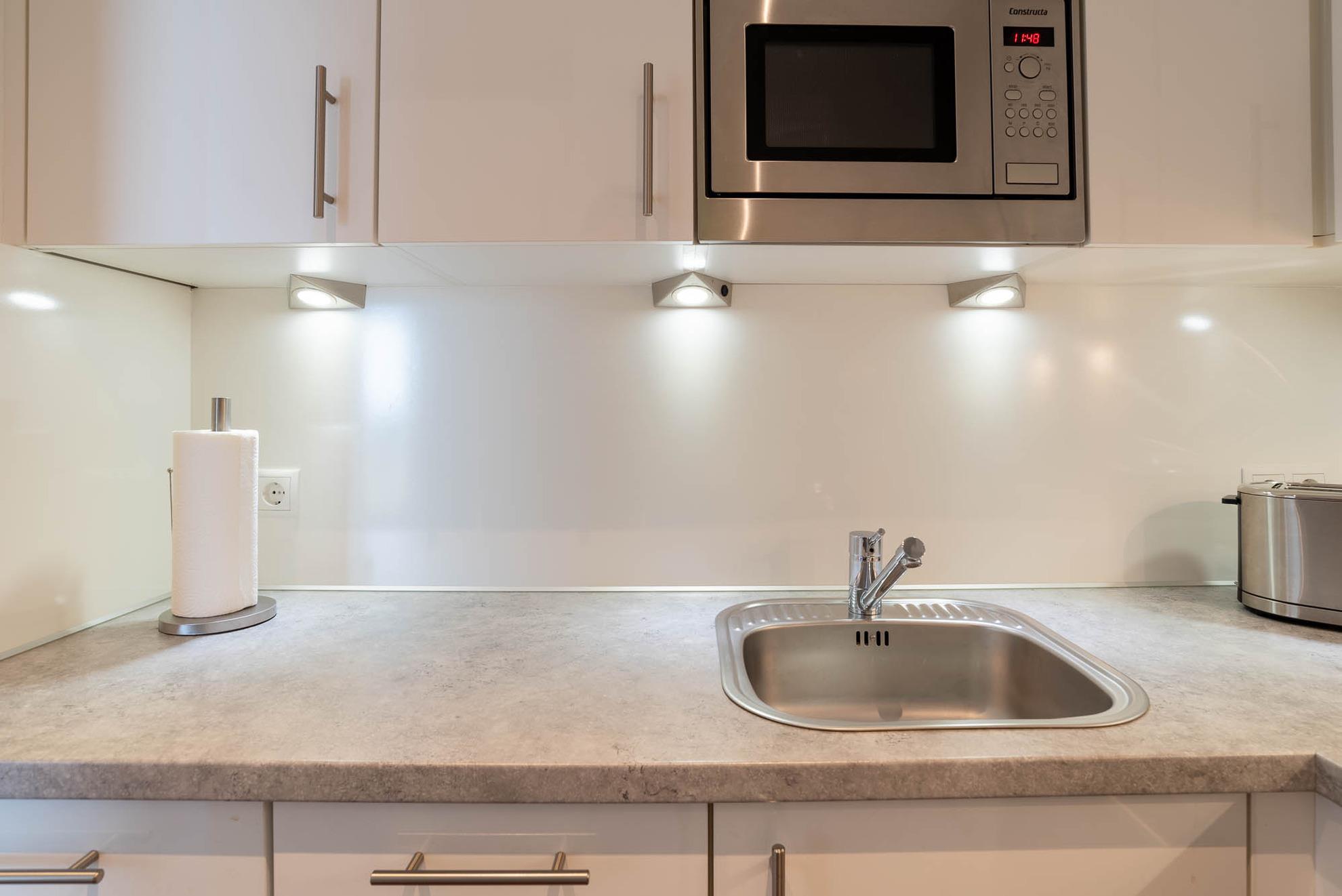 Gegenüber vom großen Esstisch befindet sich die offene Küche. Mit ihrer umfangreichen Ausstattung wie Kaffeemaschine, Toaster und Wasserkocher werden beim Kochen keine Wünsche offengelassen. Neben einem Gefrierfach und einem Backofen enthält die Einbauküche auch noch eine Geschirrspülmaschine.