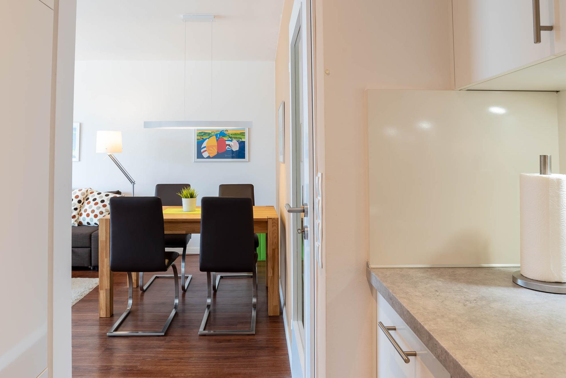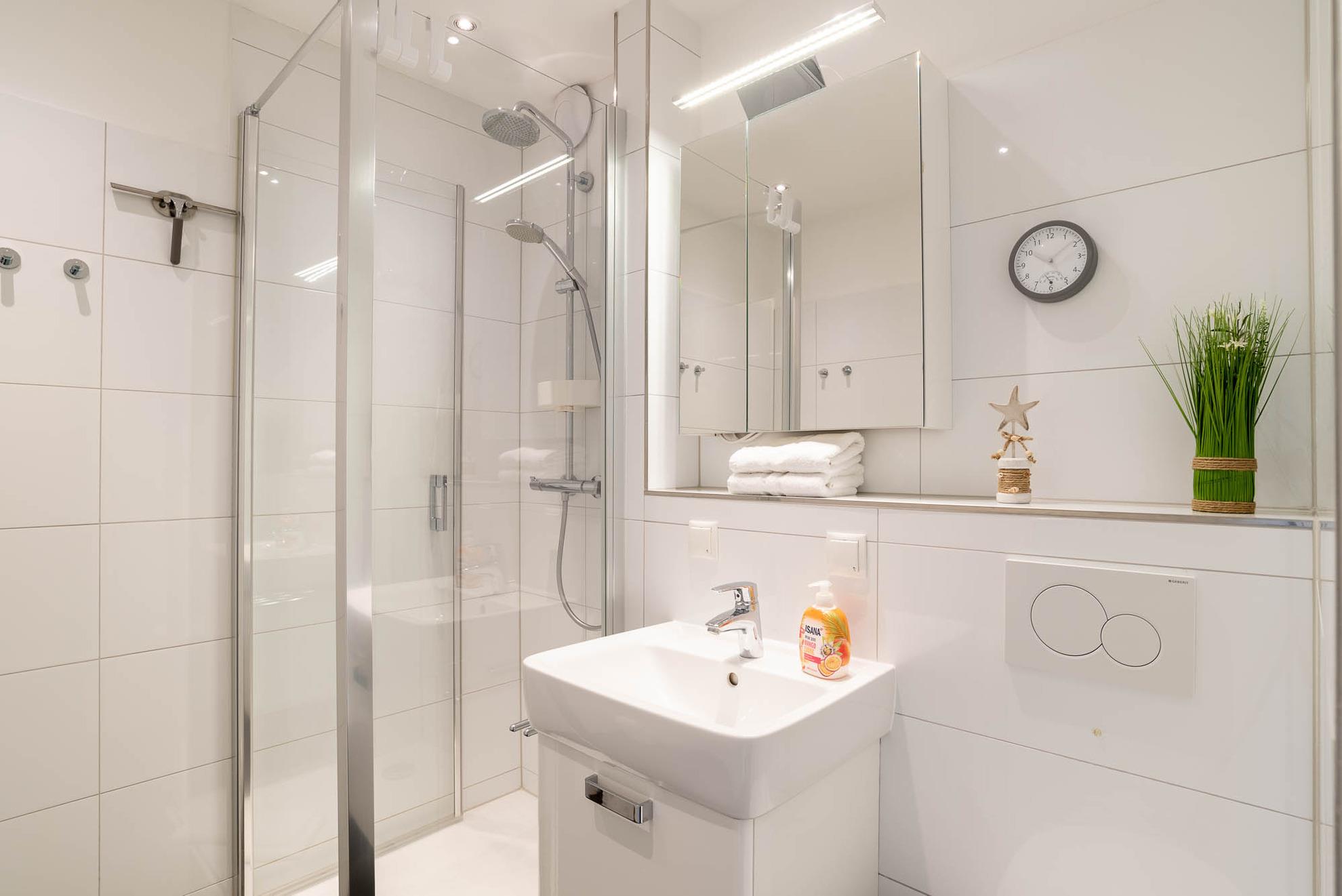 Moderne Ferienwohnung mit Balkon und Regenwalddusche in Kiel-Schilksee, ideal für entspannte Urlaubstage zu zweit.