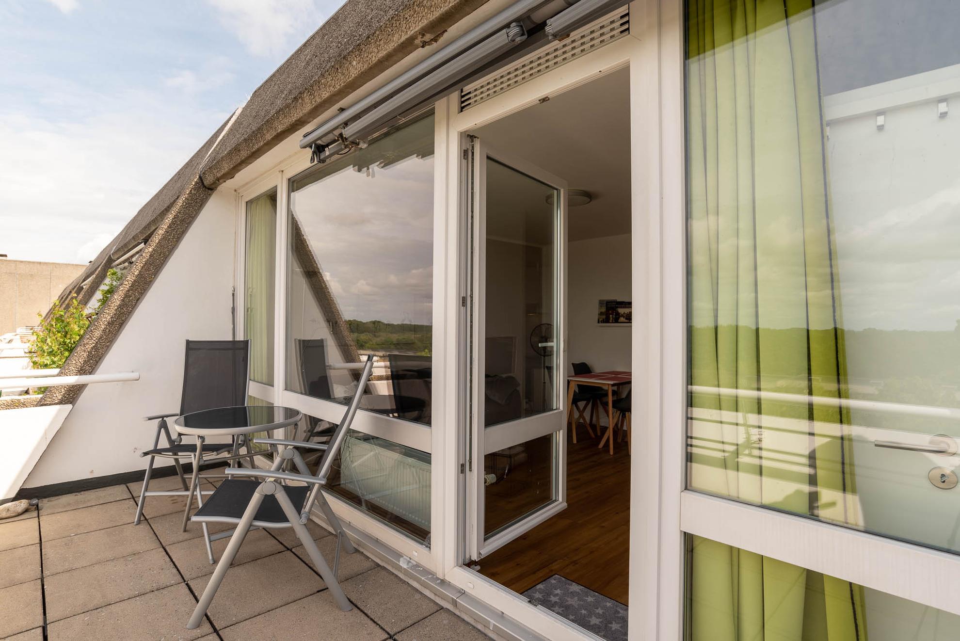 Zu dieser Wohnung gehört ein 9 qm großer Balkon mit Hochlehner-Stühlen und ein Tisch. Der freie Blick zu den Salzwiesen ist ruhig und Sie können den ganzen Tag die Sonne genießen (Süd-West-Lage).