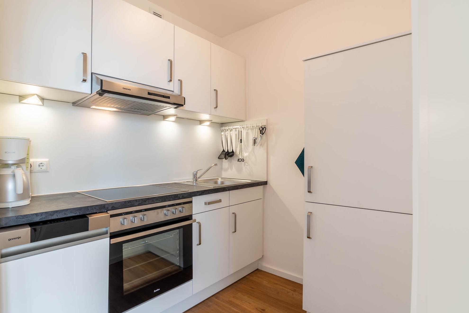In der 3.Etage (kein Fahrstuhl) in dem terrassenförmig angelegtem Olympiazentrum liegt diese 2020 komplett renovierte 1,5 Zimmer Nichtraucher-Ferienwohnung. Sie bietet Platz für bis zu drei Personen. Im hellen Wohnbereich mit angrenzender Küchenzeile befinden sich eine Couch mit einem kleinen Tisch. Die Couch ist dann auch die Schlafgelegenheit für die 3. Person. Ferner finden Sie den Essbereich mit vier Stühlen und einem Tisch. Im Wohnbereich gibt es natürlich einen Flachbild-Fernseher. Im separaten Schlafzimmer befindet sich ein Doppelbett (160x200). Die gesamte Wohnung lässt sich mit Gardinen verdunkeln.