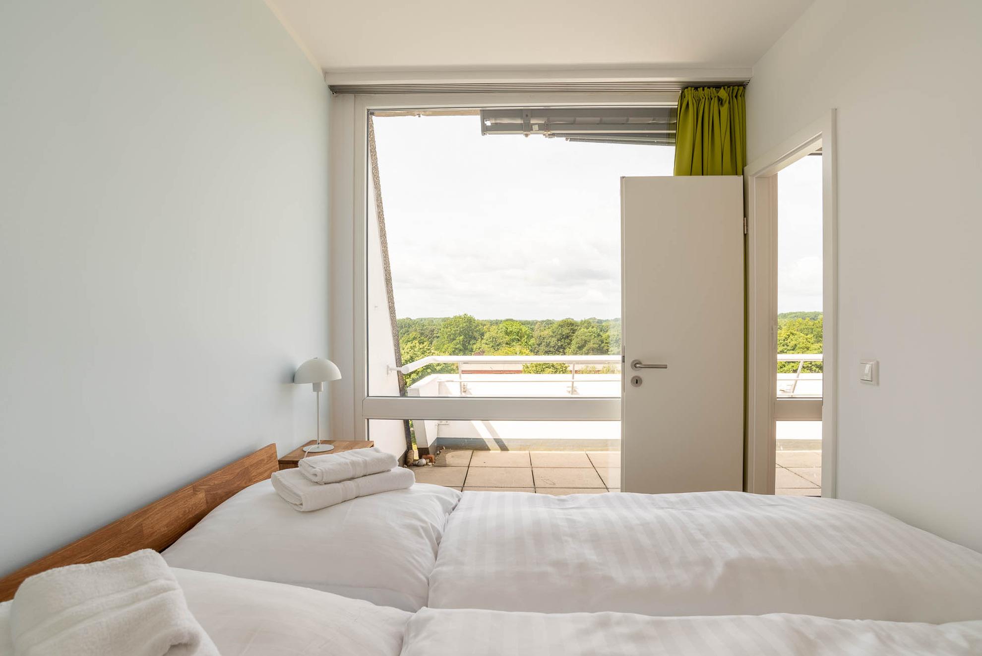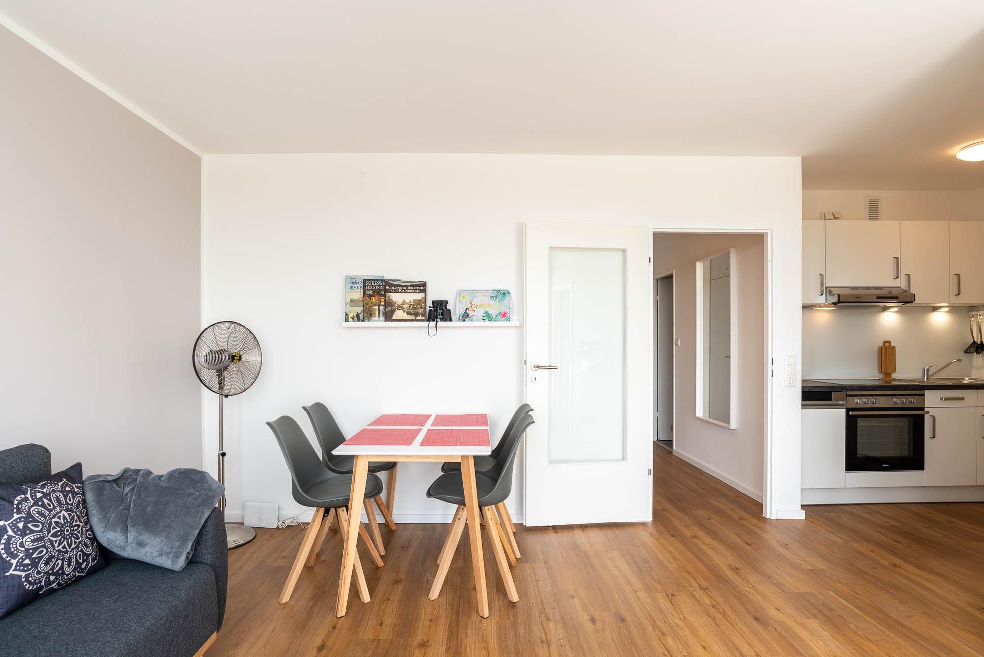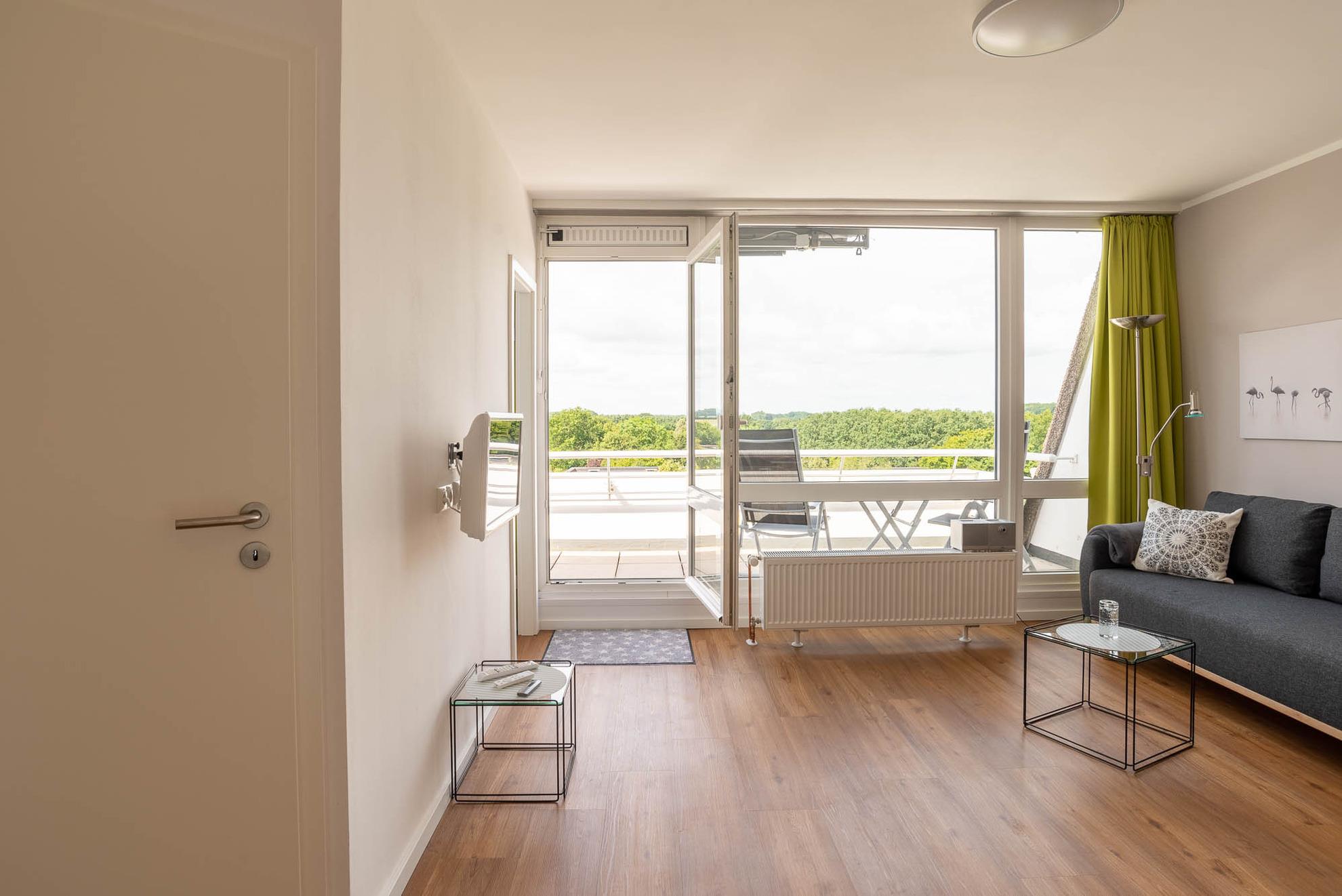 Moderne Ferienwohnung mit Balkon und freiem Blick auf Salzwiesen in Kiel-Schilksee, ideal für bis zu drei Personen.
