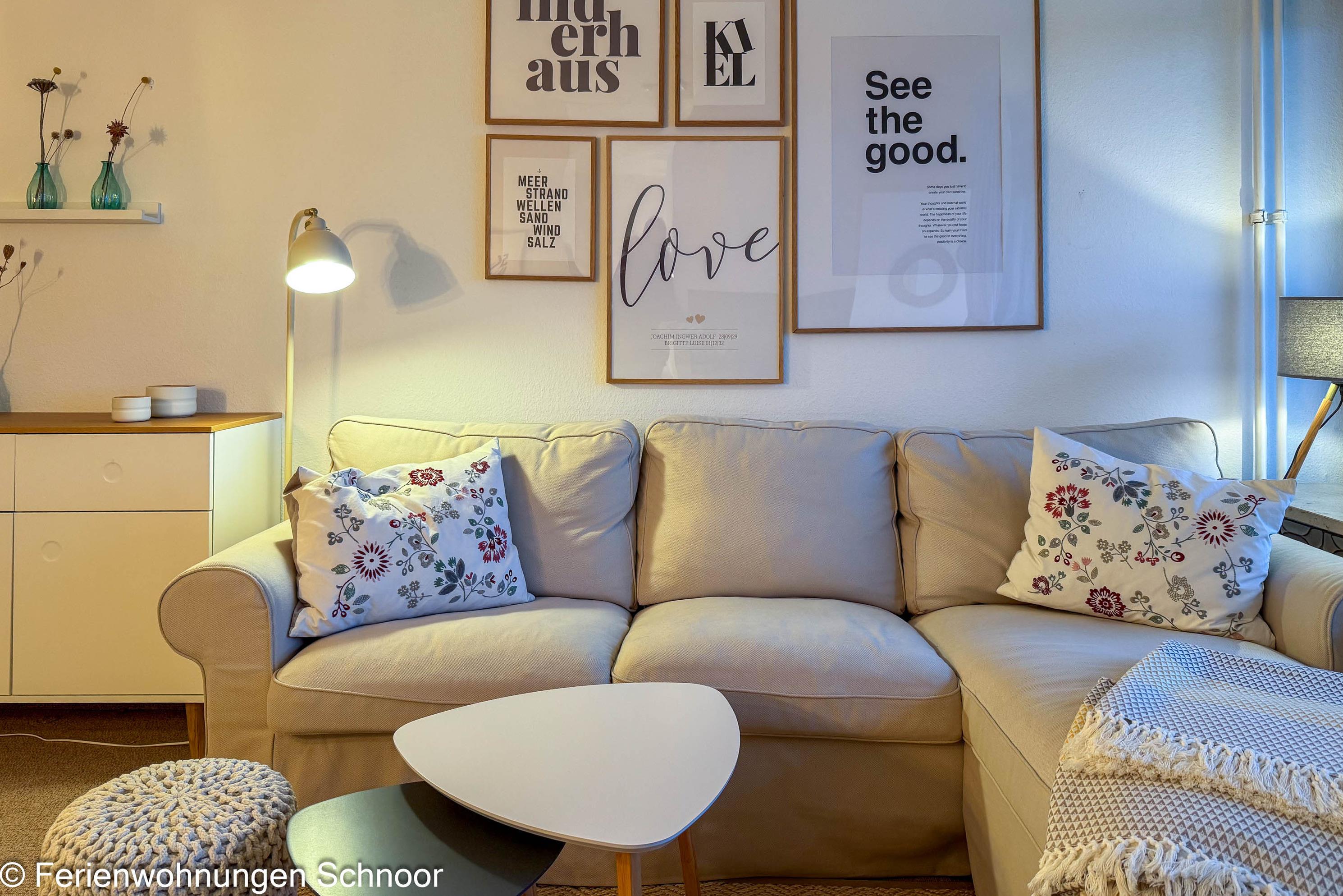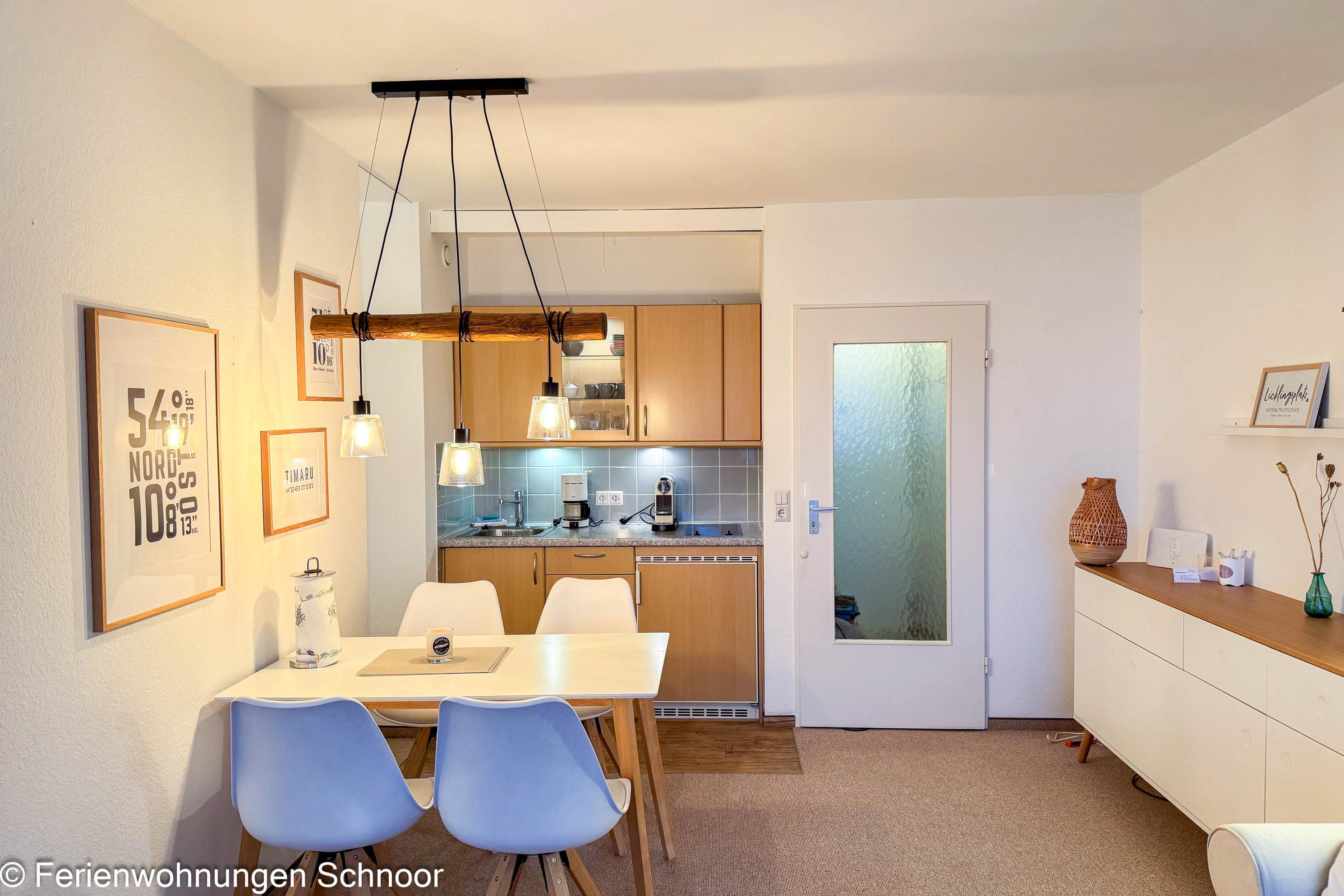Diese 47qm große, 2-Zimmer Ferienwohnung mit seitlichem Meerblick bietet Platz für bis zu 4 Personen und befindet sich im 7. Stock des Olympia Hotel Schilksee. Die Wohnung wurde liebevoll eingerichtet. Sie ist bequem mit dem Fahrstuhl erreichbar. Der offene Wohn- und Essbereich ist lichtdurchflutet und verfügt über eine kuschelige Couch, einen LCD-Fernseher und einen Esstisch für vier Personen. Durch Gardinen kann der Raum abgedunkelt werden. Die angrenzende Küche ist mit einem Cerankochfeld, und einem Kühlschrank mit Gefrierfach ausgestattet. Auch eine Kaffeemaschine, eine Nespresso Kapselmaschine, ein Toaster und ein Wasserkocher sind vorhanden.