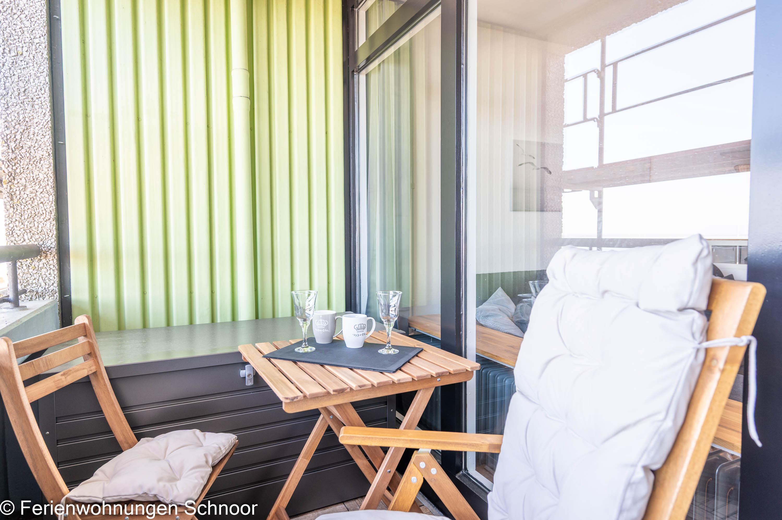 Der Wohnbereich verfügt über ein Schlafsofa (160 x 200 cm). Darüber hinaus besitzt die Wohnung einen Balkon (6 m2), direkt begehbar über den Wohnbereich. Unser Tipp: Frühstücken Sie hier morgens bei Sonnenschein und planen Sie Ihren Tag mit dem wunderbaren Blick auf die Schilkseer Bucht.