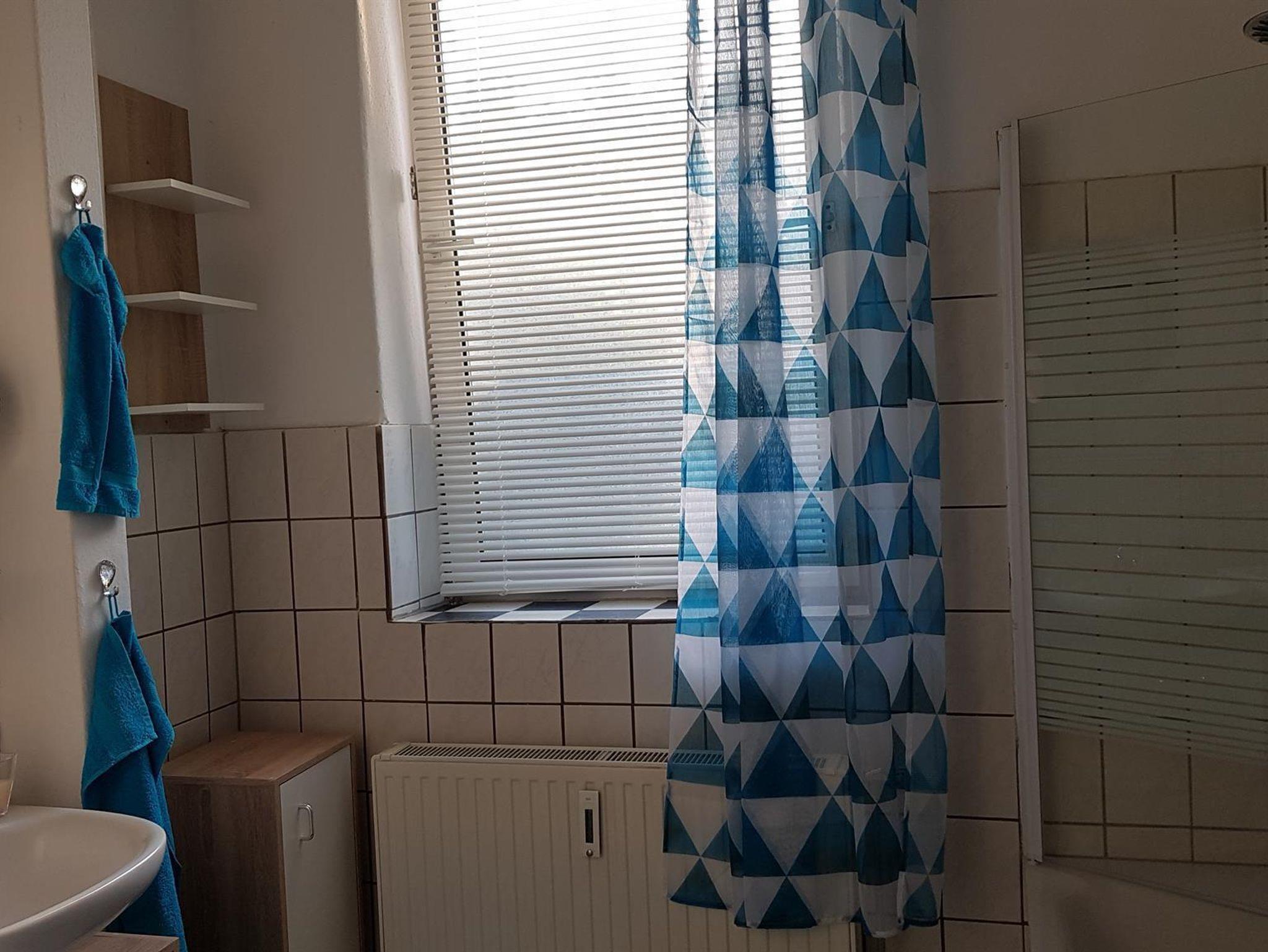 Das Badezimmer ist mit einer Badewanne ausgestattet, die durch die Duschwand auch als Dusche genutzt werden kann.