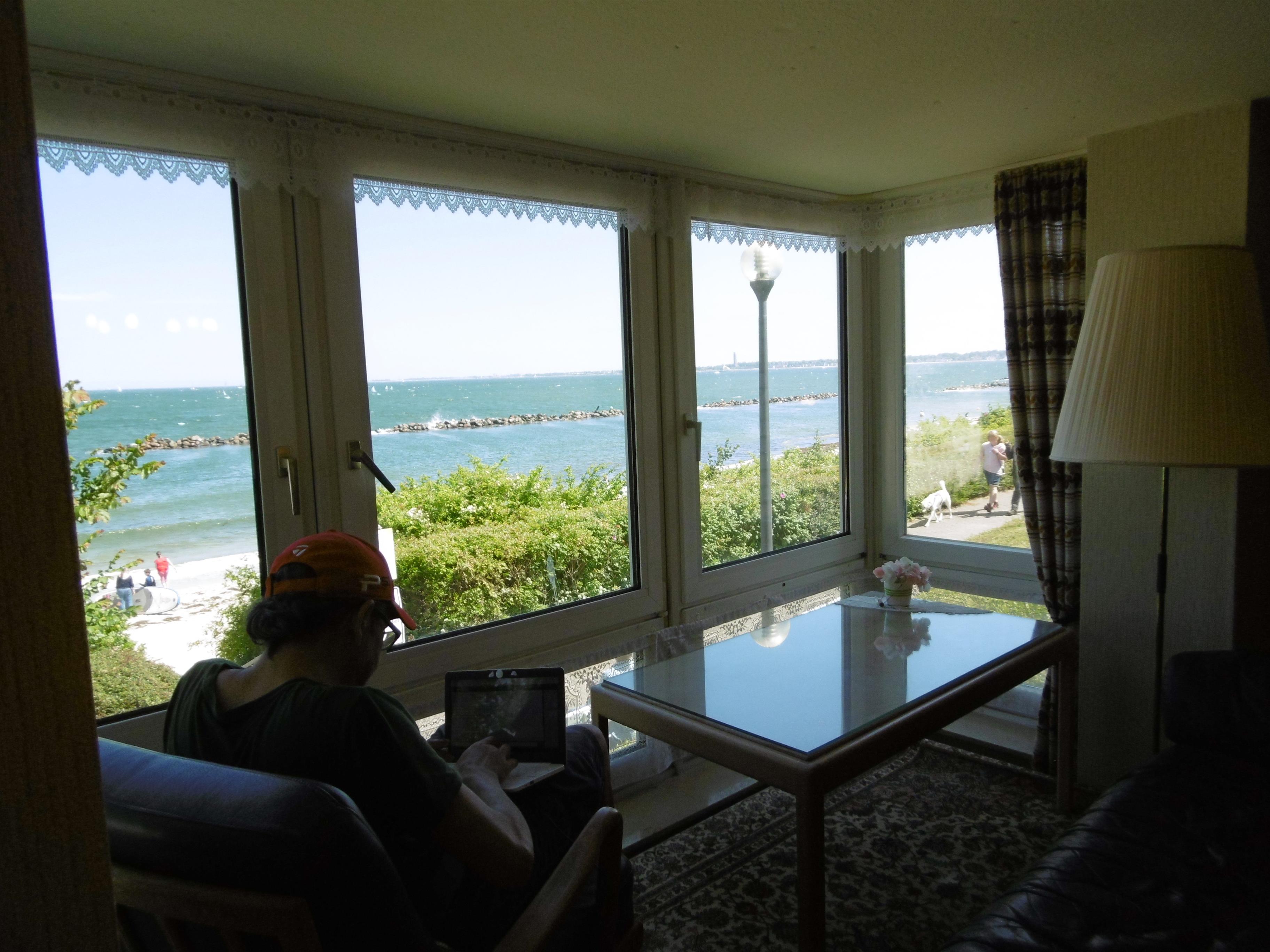 im Erkerfenster mit 180 °-Blick auf die Kieler Bucht (mit Leuchtturm) und Olympia-Segelhafen.
