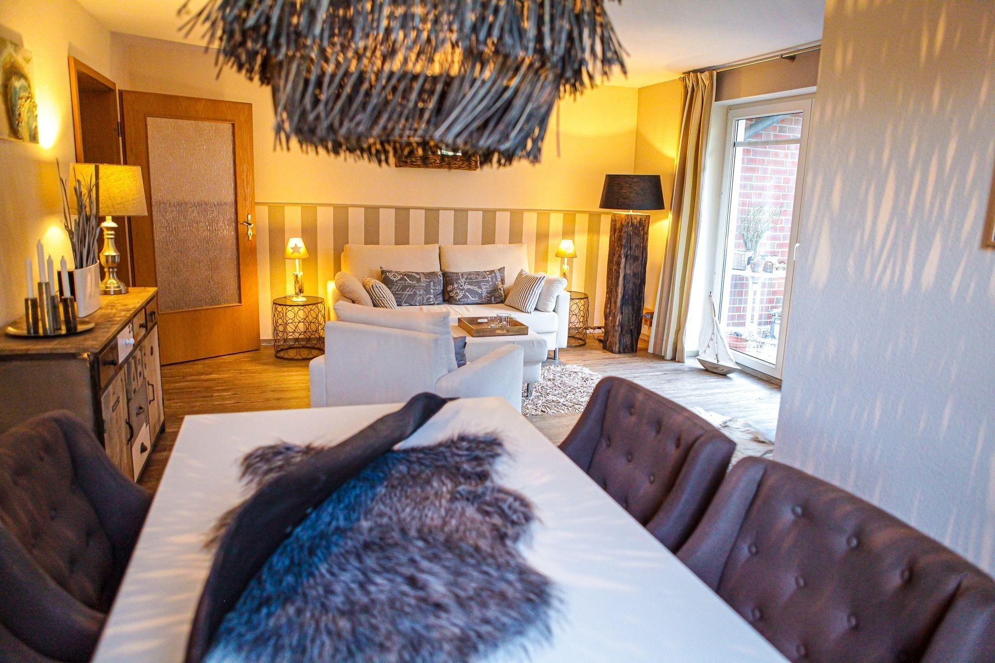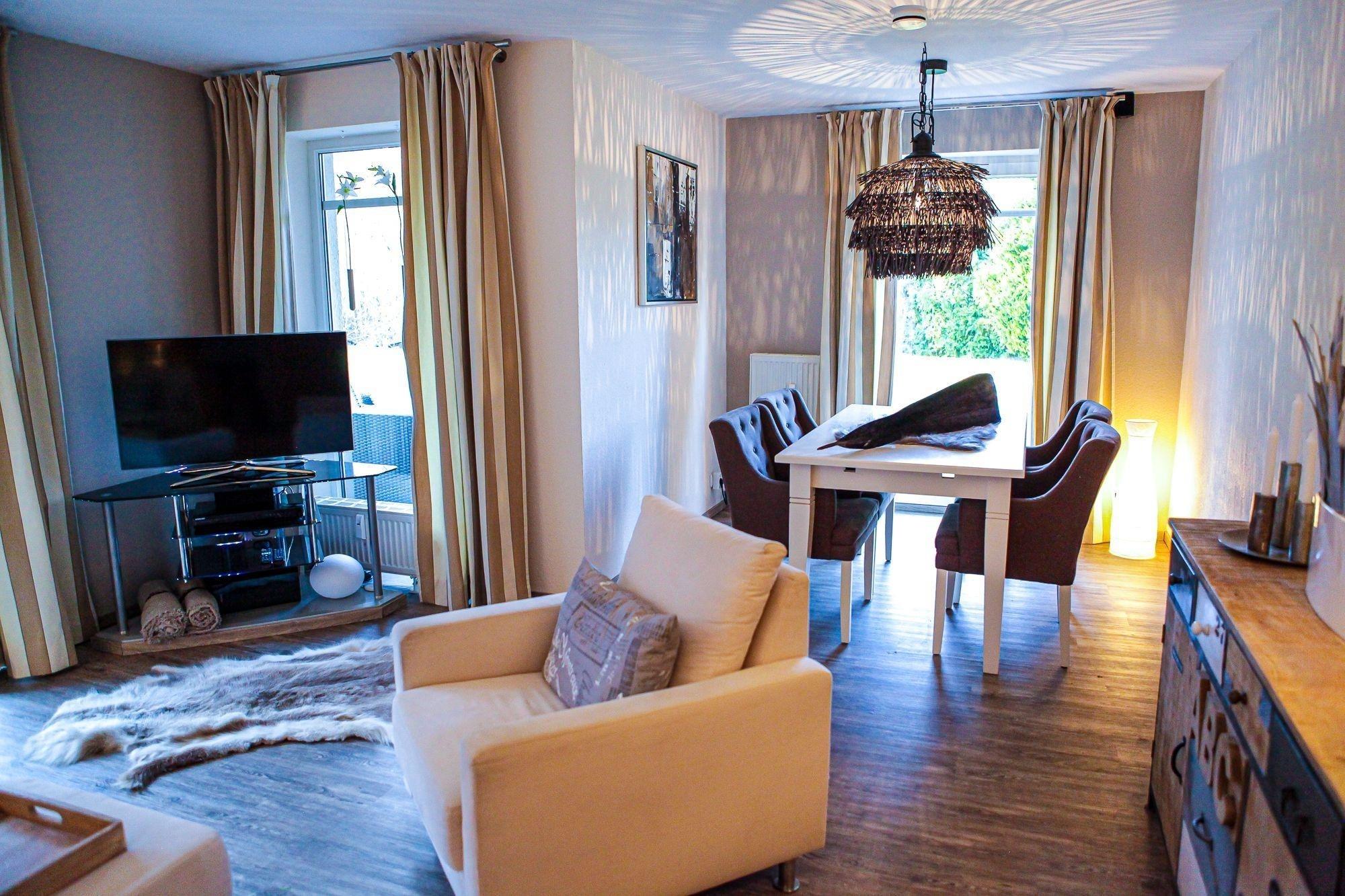 Die liebevoll eingerichtete Ferienwohnung ist 65 qm groß. Die Wohnung ist hell und gehoben komplett ausgestattet. Das Wohnzimmer mit Essbereich sowie das Schlafzimmer verfügen über bodentiefe Fenster und Türen. Ruhige Lage in zweiter Reihe mit Terrasse.