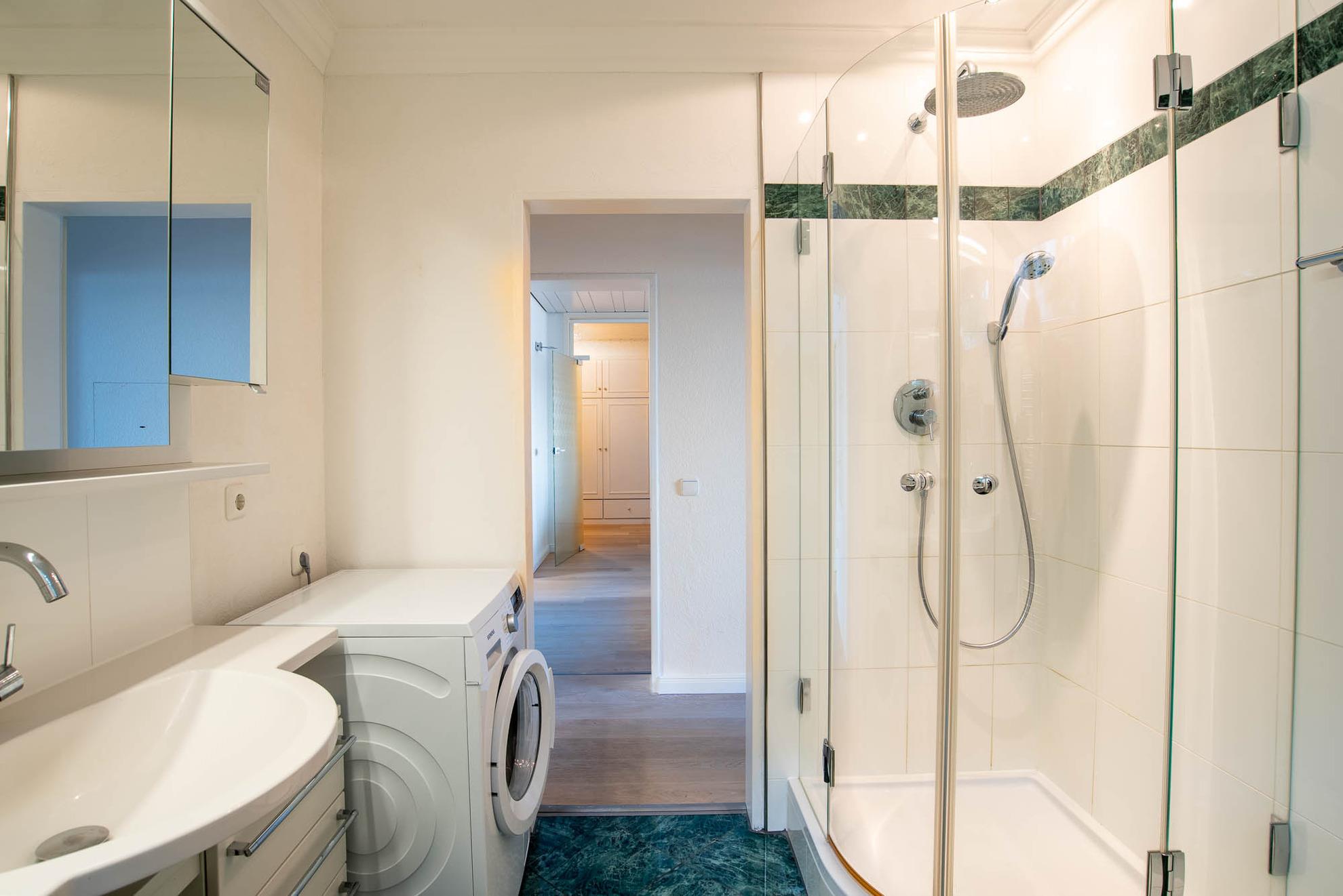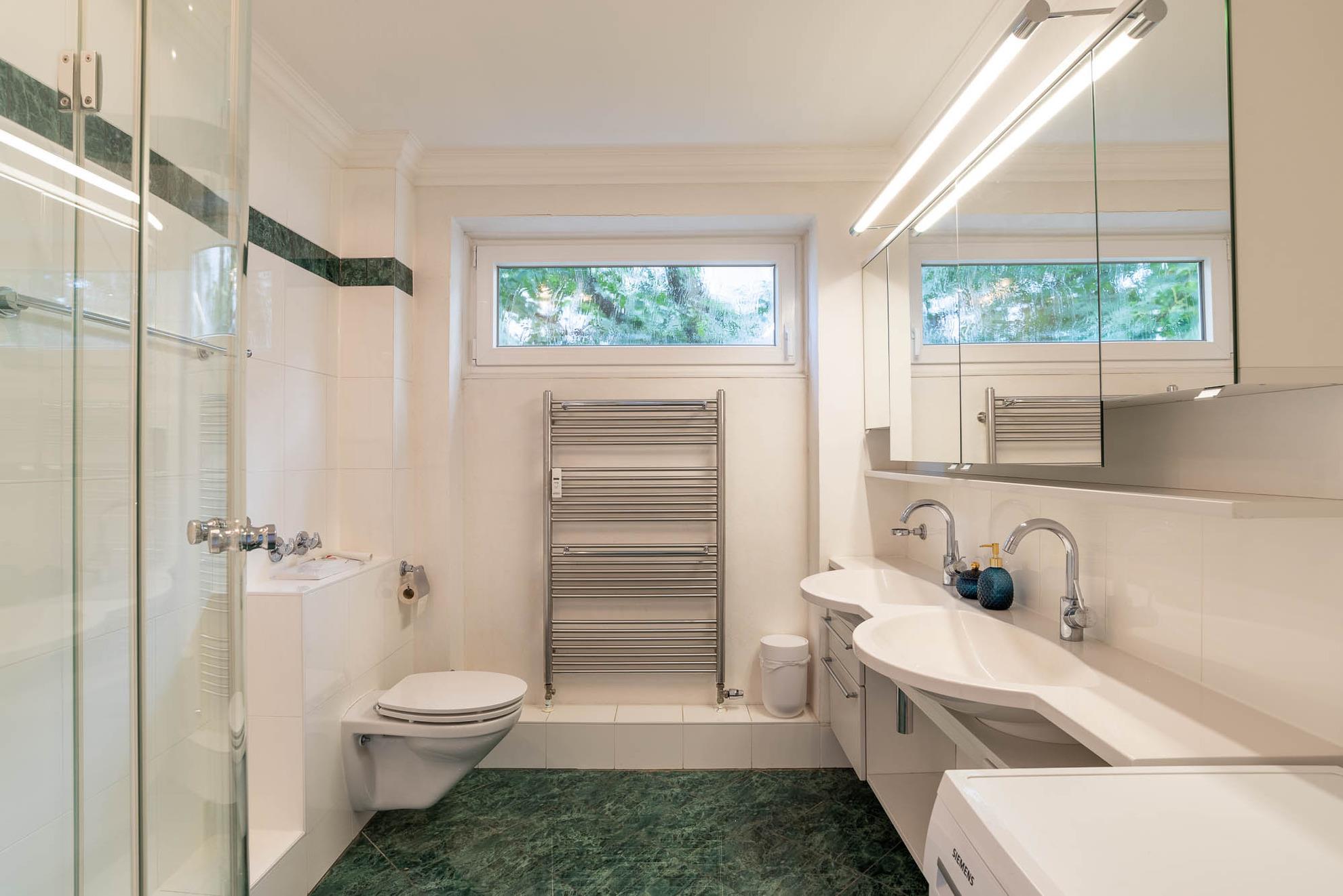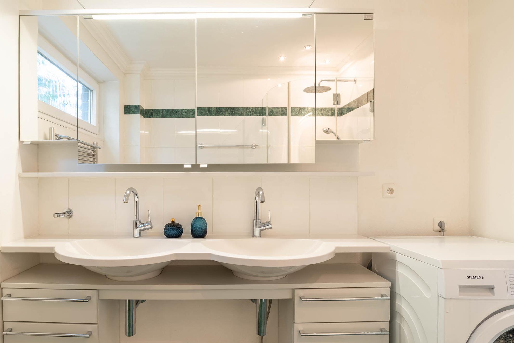 Das Badezimmer ist mit einer Waschmaschine und zwei Waschbecken ausgestattet. Es bietet zusätzlich genügend Ablage und Staufläche für Ihren Aufenthalt. Neben einem Heizungs-Handtuchhalter steht eine Eckdusche zur Verfügung.