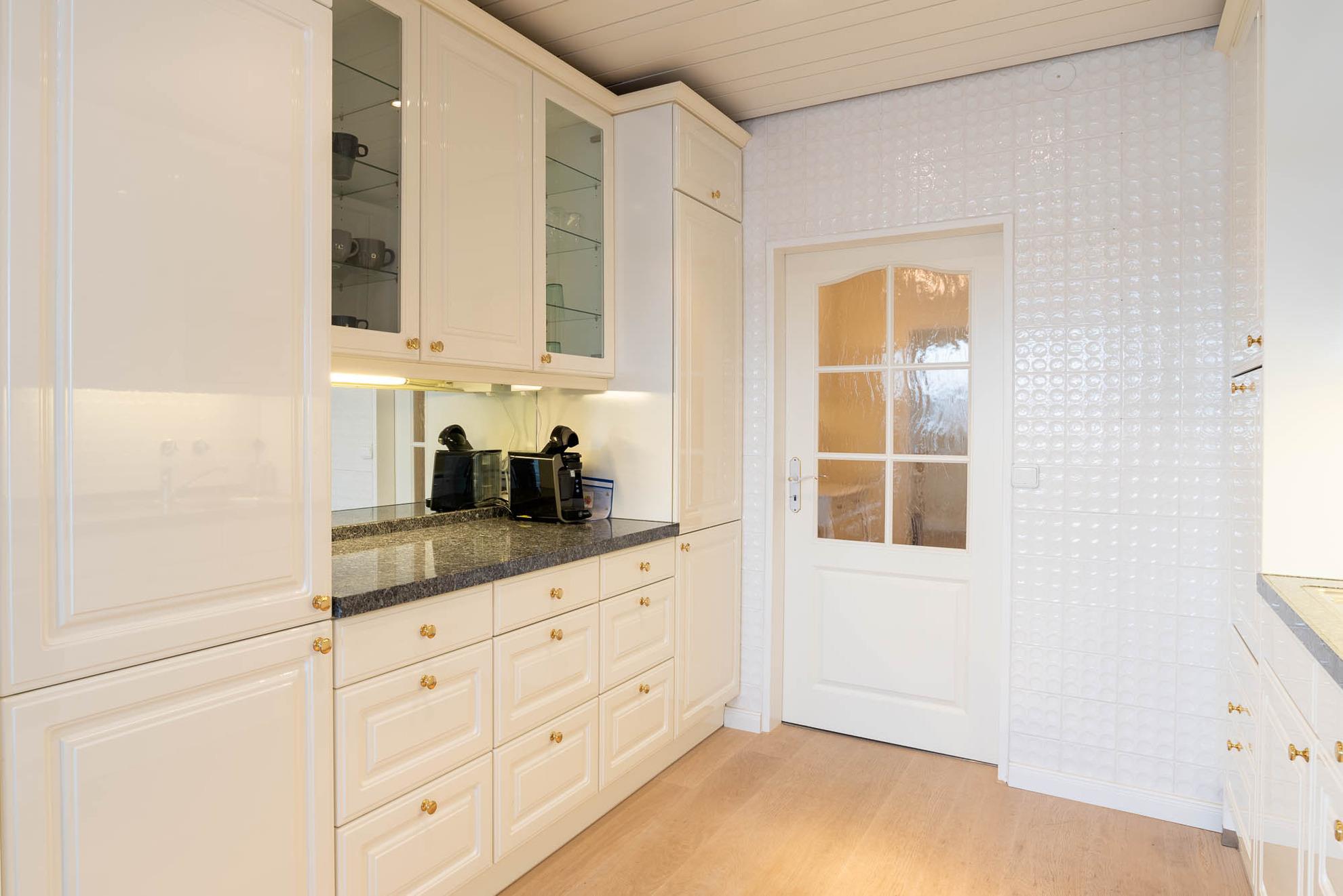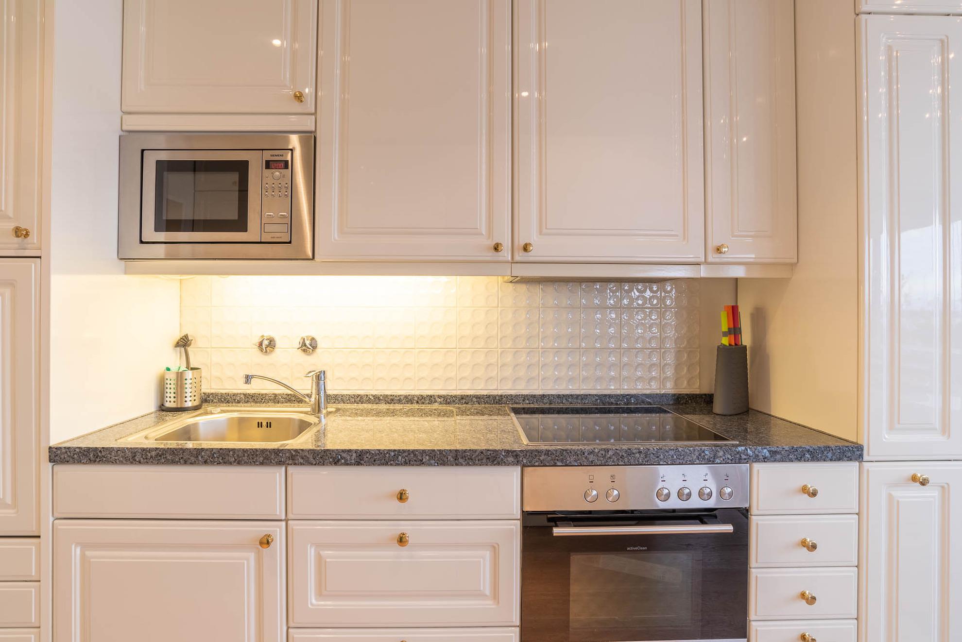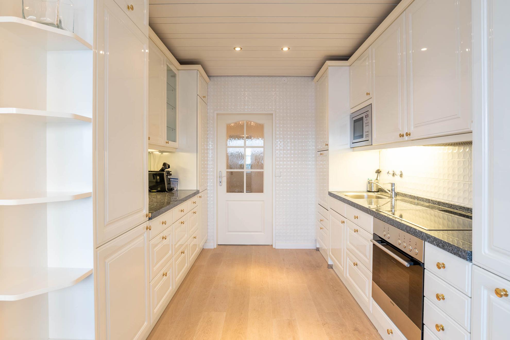 Die Küche im Landhausstil ist mit allen nötigen Haushaltsgeräten ausgestattet, damit Sie während Ihres Aufenthalts kochen und backen können. Neben einem großen Kühlschrank und Gefrierfach befindet sich eine Filterkaffeemaschine, eine Tassimo Kapselmaschine, ein Wasserkocher und ein Toaster in der Küche.