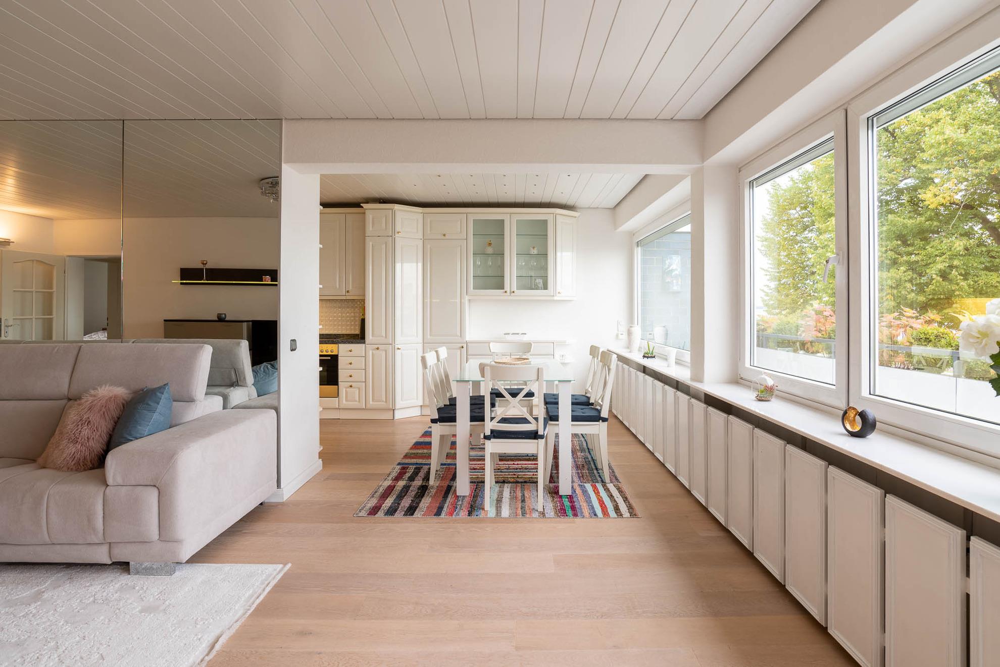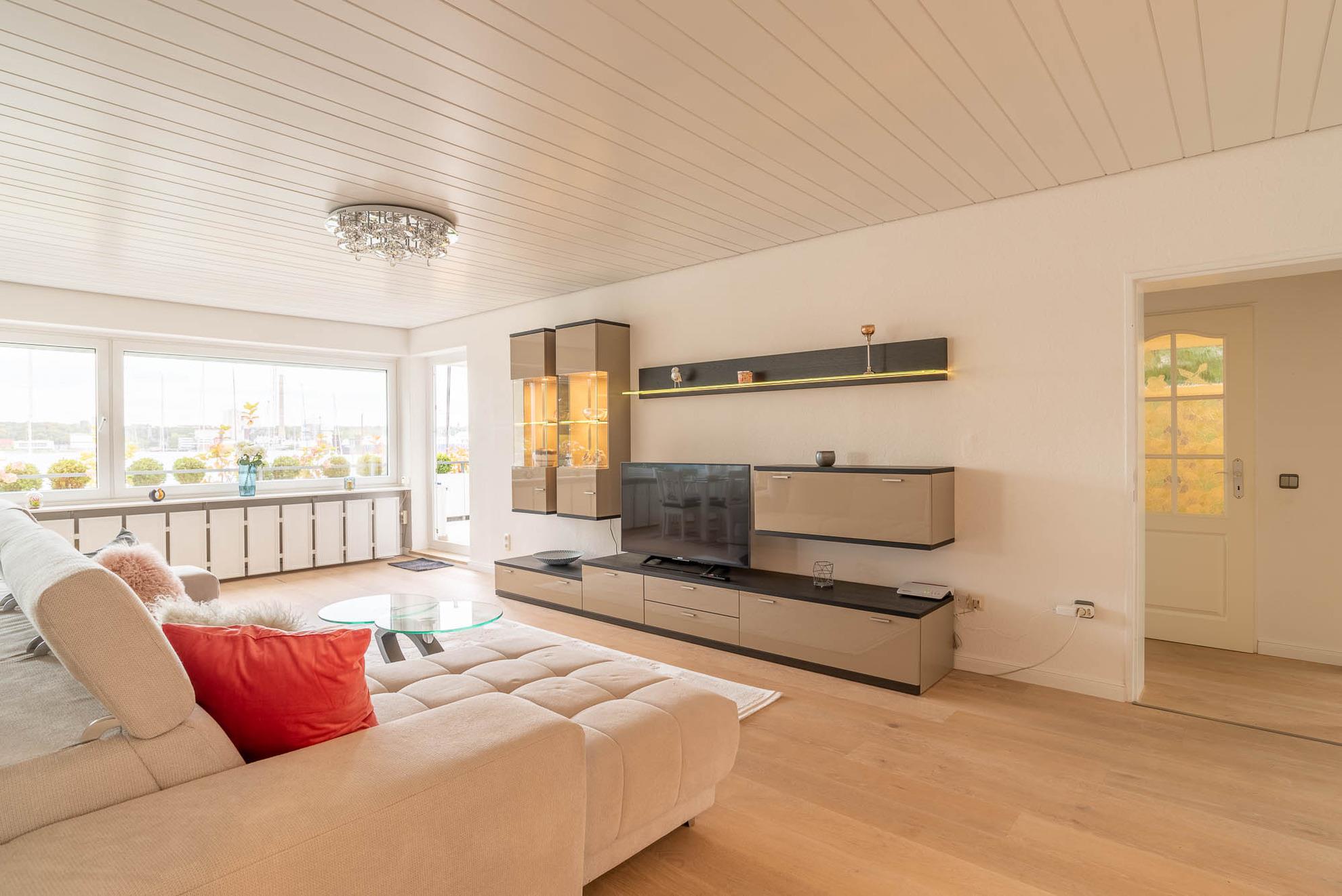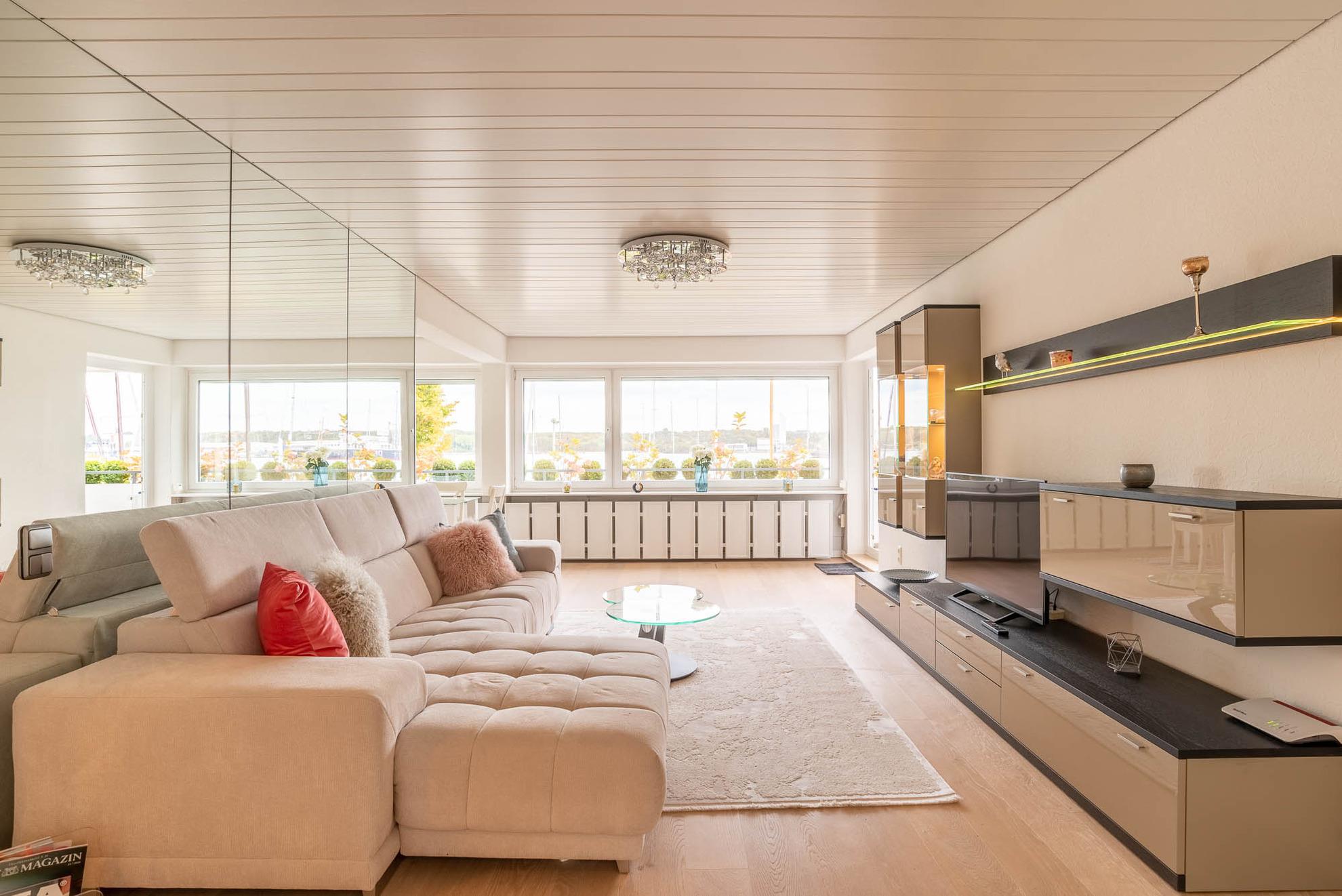 Neben einer großen Couchlandschaft und einem Lowboard mit Flachbildfernseher befindet sich als Highlight im Wohnzimmer eine Spiegelwand hinter dem Sofa. Der Esstisch mit sechs Stühlen steht direkt an der Fensterfront mit Blick zur Kieler Förde, beziehungsweise dem Yachthafen Düsternbrook