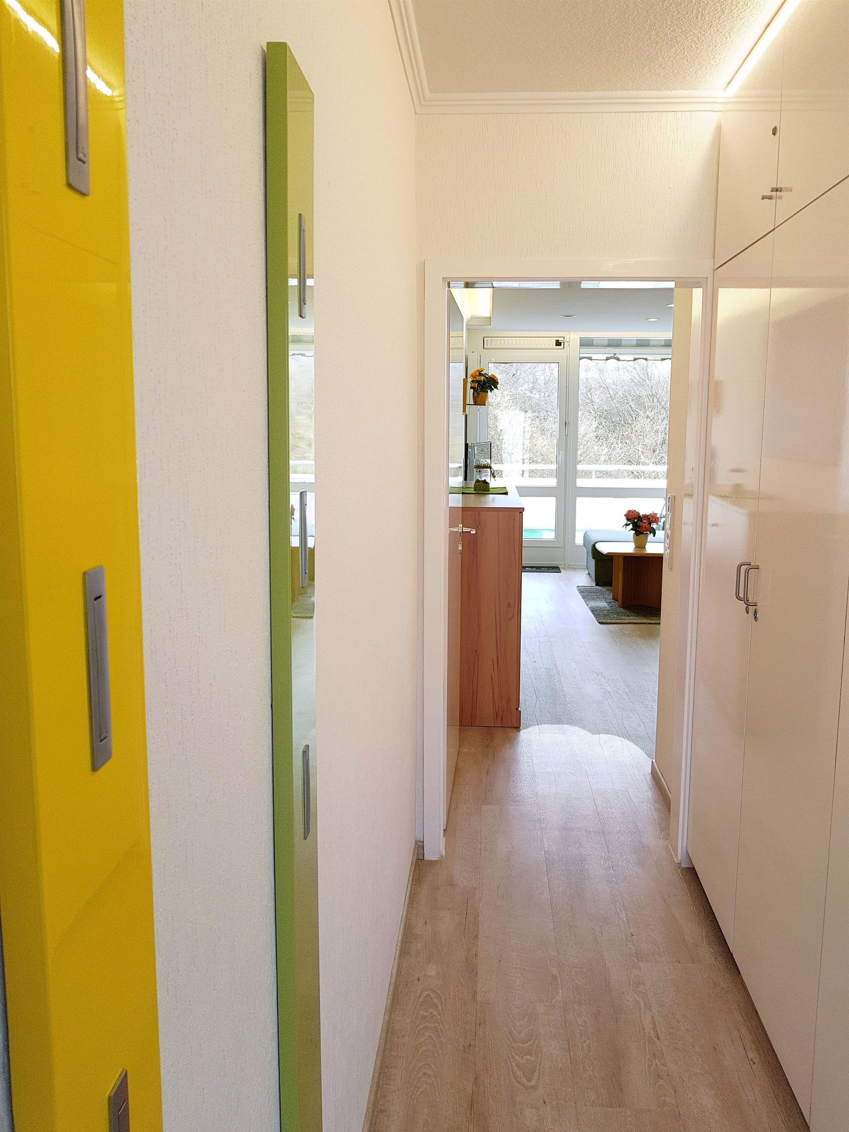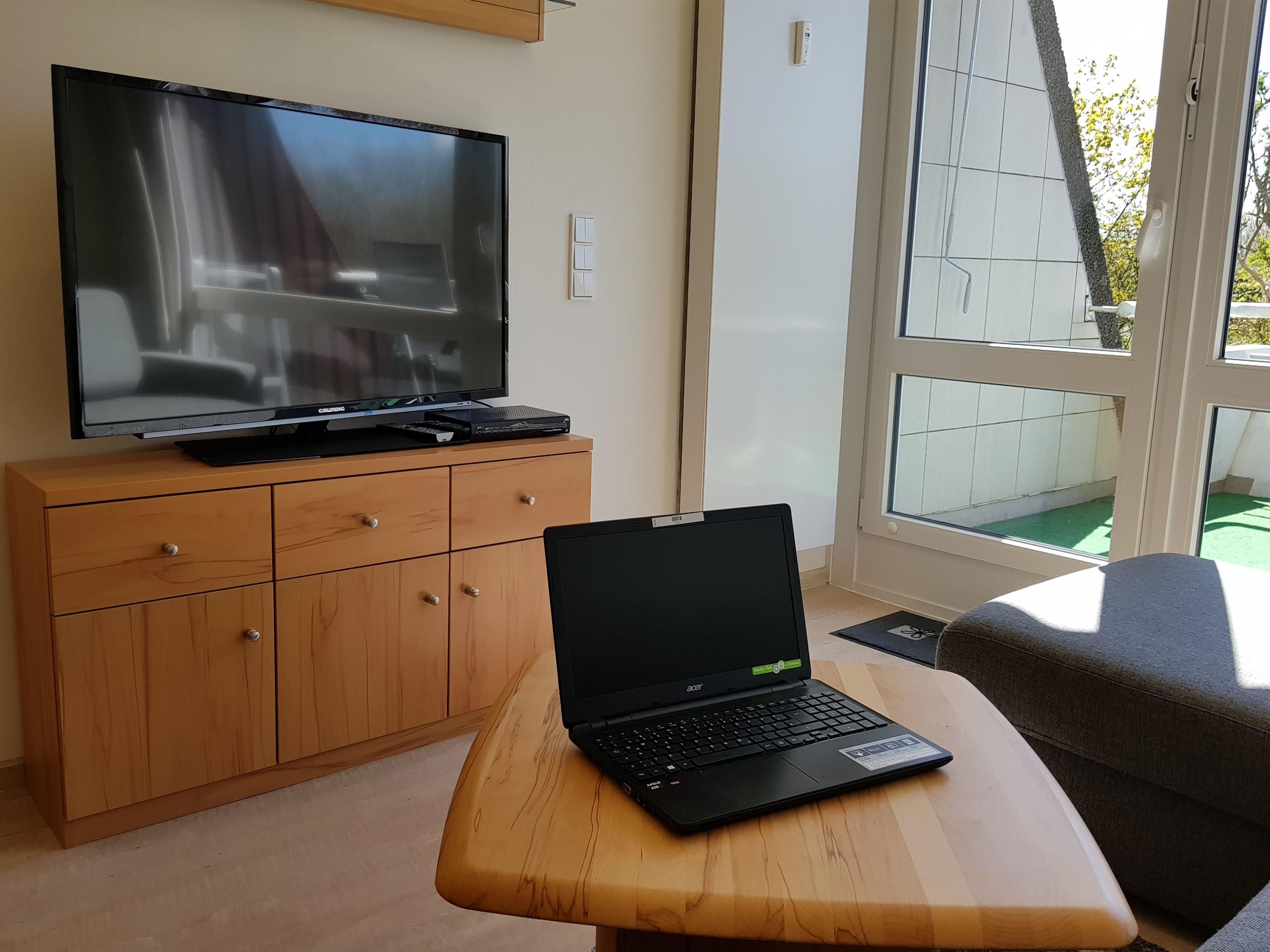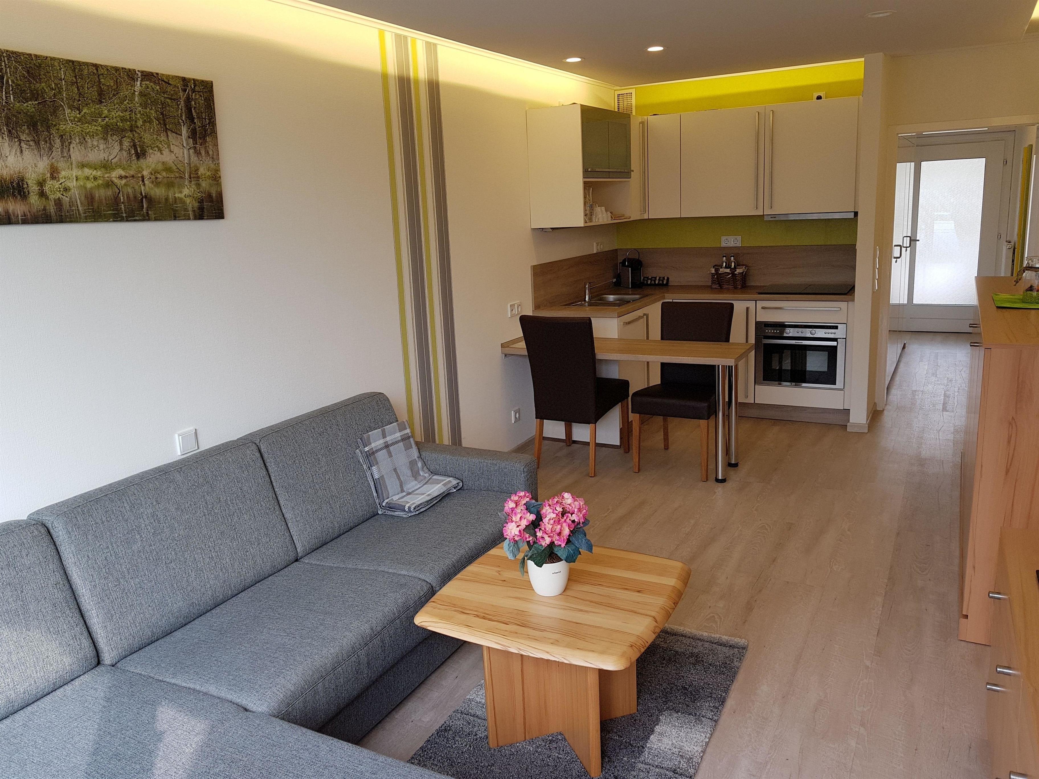 Das helle Apartment wurde mit einem Vinylboden versehen und erstreckt sich über ein Zimmer mit offener Küche nebst vorgelagerten Südwest-Balkon, sowie einem Duschbad auf ca. 35 qm. Die Wohnung ist komplett ausgestattet und verfügt über eine hochwertige Schlafcouch mit Lattenrost und neuer Matratze, Backofen mit integrierter Mikrowelle, Geschirrspüler, Waschmaschine, Trockner, WLAN Radio, Internet ( 100 MBit/s) , 50" LED-TV.