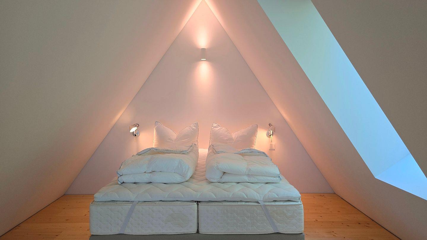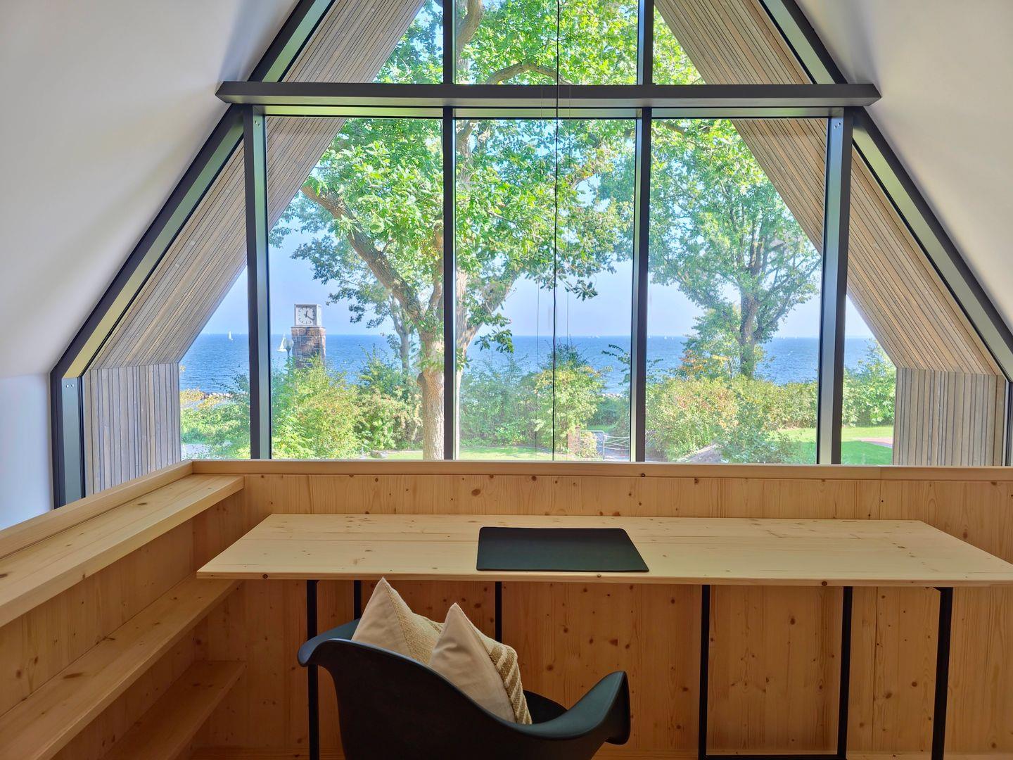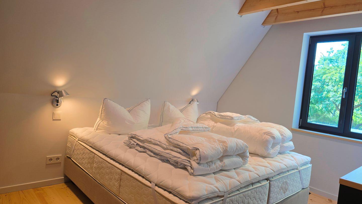 Neben 2 separaten Schlafzimmern, gibt es ein zusätzliches Doppelbett in der offenen Galerie – Meerblick inklusive. Der „Masterbedroom“ ist neben dem Hauptbadezimmer im 1. OG angesiedelt. Mit Blick auf die Ostsee zu arbeiten ist ebenfalls möglich, dazu wurde ein eigens angefertigter Schreibtisch in die Empore integriert.