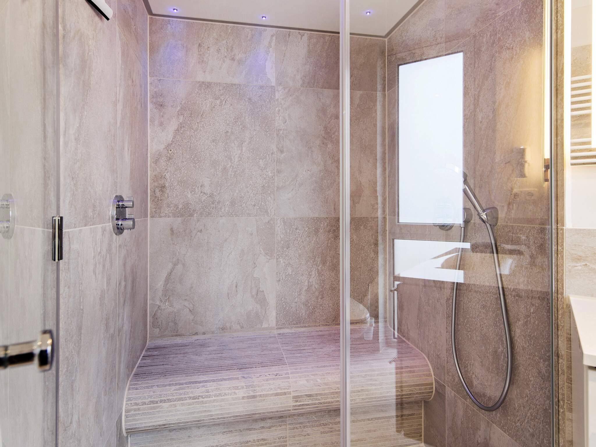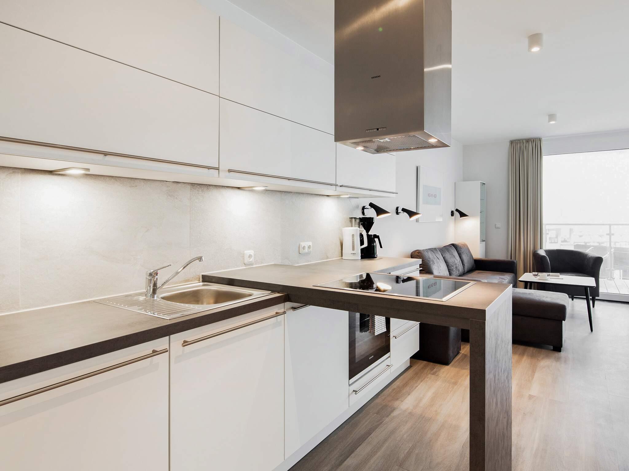 Das Innere des Apartments ist auf Komfort und Entspannung ausgelegt. Der offene Küchen-Wohnbereich schafft einen warmen, einladenden Raum zum Kochen, Essen und Entspannen, während der Bioethanol-Kamin abends für eine gemütliche Atmosphäre sorgt. Ein Fernseher mit Blu-Ray-Player und Bluetooth-Soundbar sorgt dafür, dass Unterhaltung immer griffbereit ist. Das Badezimmer ist eine kleine Oase für sich und verfügt über eine Regendusche mit Dampfbadfunktion und Fußbodenheizung. Zwei Schlafzimmer, jeweils mit einem Doppelbett und einem Flachbildfernseher, bieten am Ende des Tages einen erholsamen Rückzugsort.