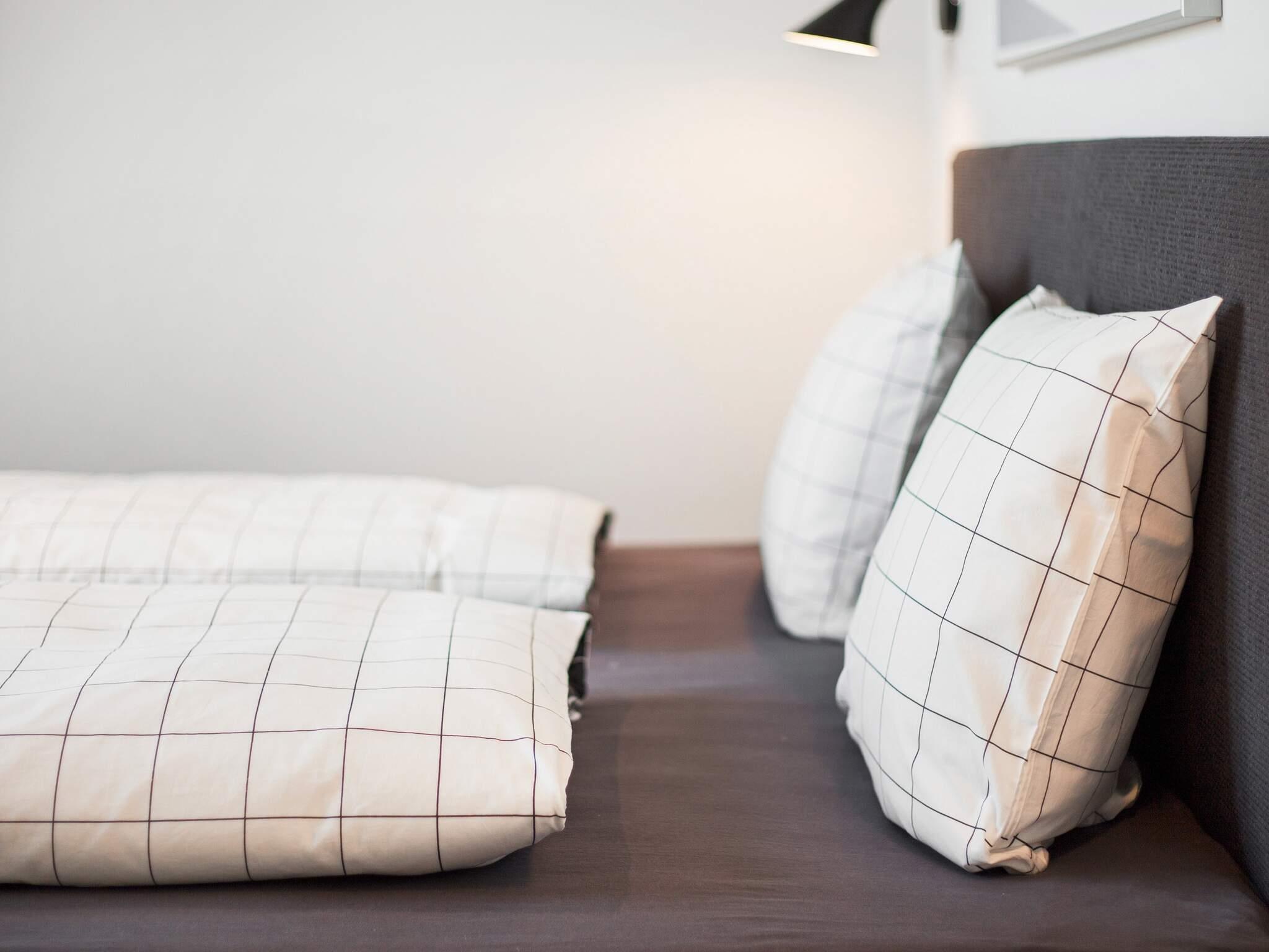 Kissen und Bettdecke haben Standardmaße, das Spannbetttuch hat die Maße 180x200.