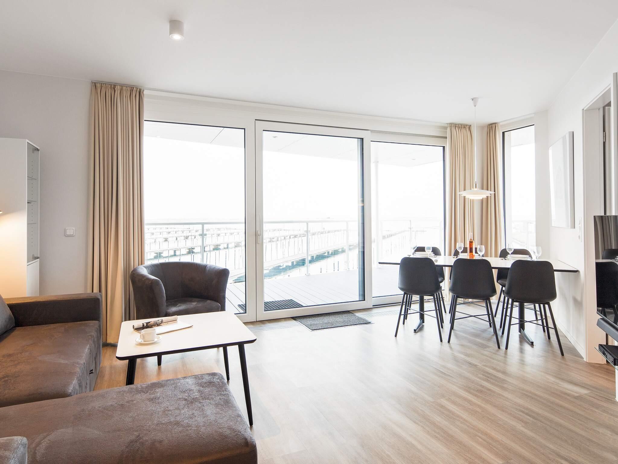 Modernes und komfortables Apartment mit Blick auf die Ostsee und den Yachthafen. Genießen Sie von morgens bis abends den wunderschönen Panoramablick auf die Ostsee. Das modern und komfortabel eingerichtete Apartment besteht aus einem offenen Wohnküchenbereich mit Essbereich und Ausgang zum großen Balkon/Terrasse. Darüber hinaus gibt es ein Badezimmer mit Regendusche mit Dampfbadfunktion und Fußbodenheizung. Ein Fernseher mit Blu-Ray-Player und eine Soundbar mit Bluetooth-Anbindung sorgen für Unterhaltung und ein Bioethanol-Kamin für gemütliche Wärme. Die beiden Schlafzimmer sind jeweils mit einem Doppelbett und einem Flachbildfernseher ausgestattet.