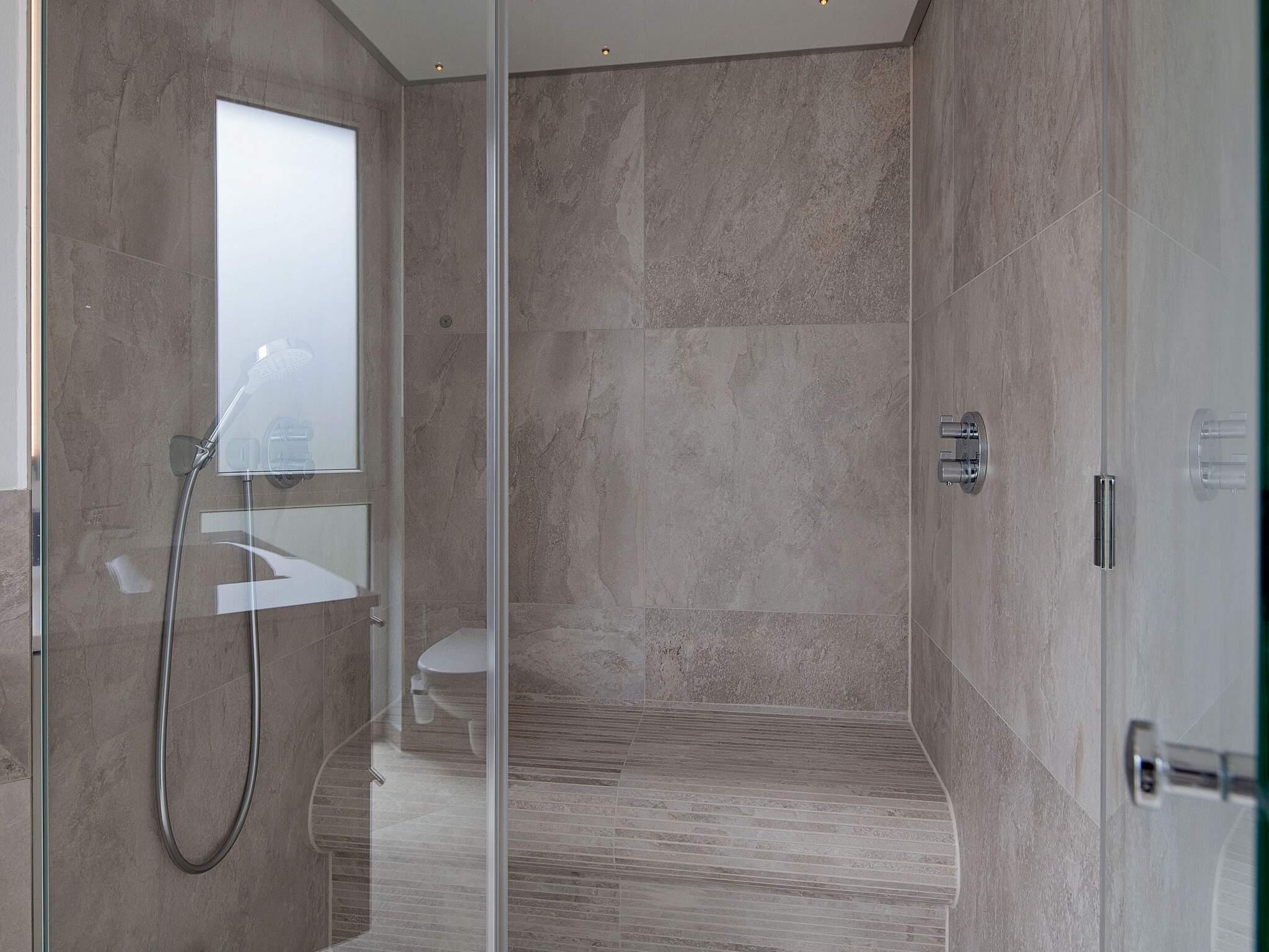 Bad: WC, Waschb., Dusche, Dampfkabine, Fußbodenheiz.