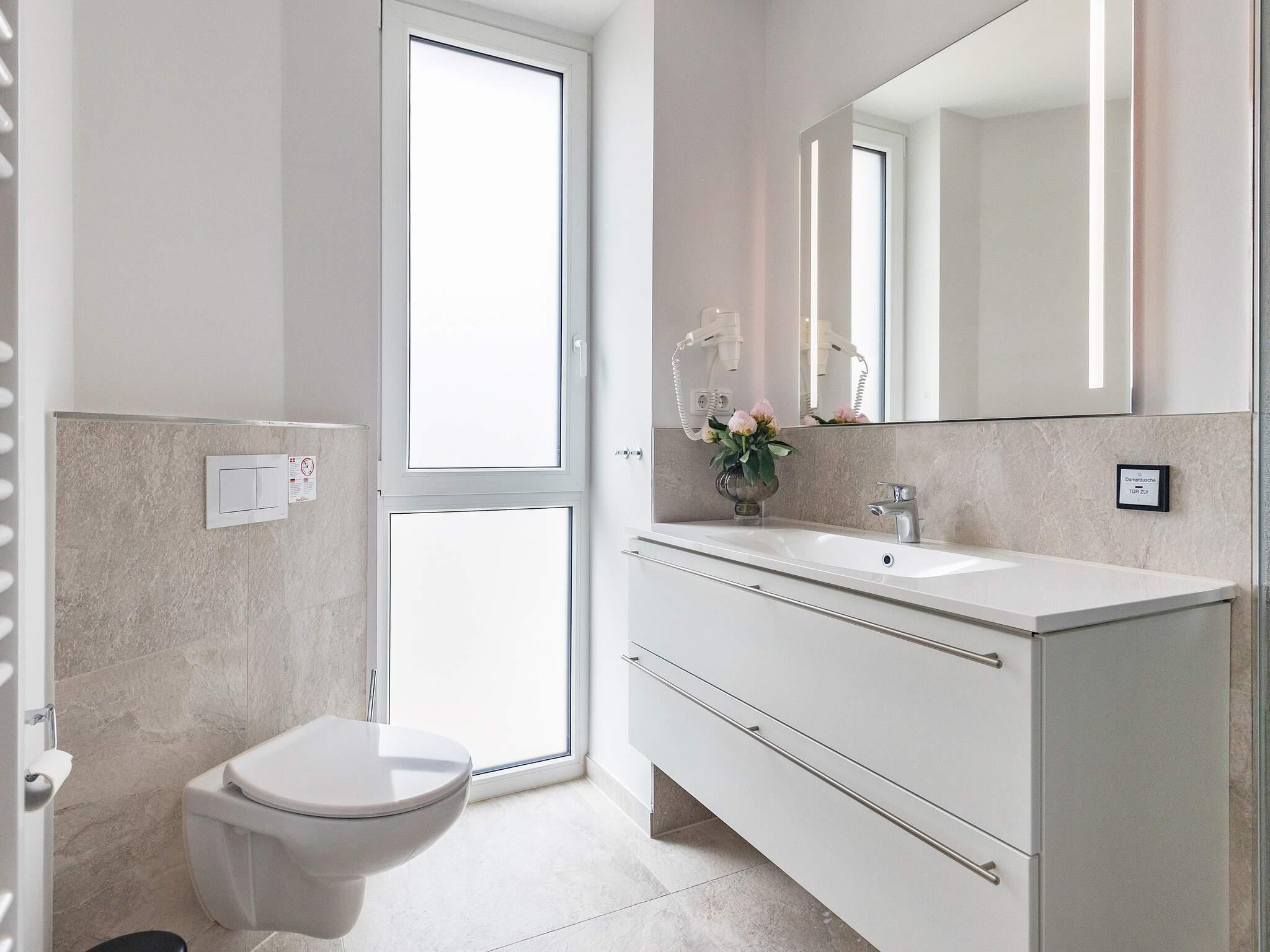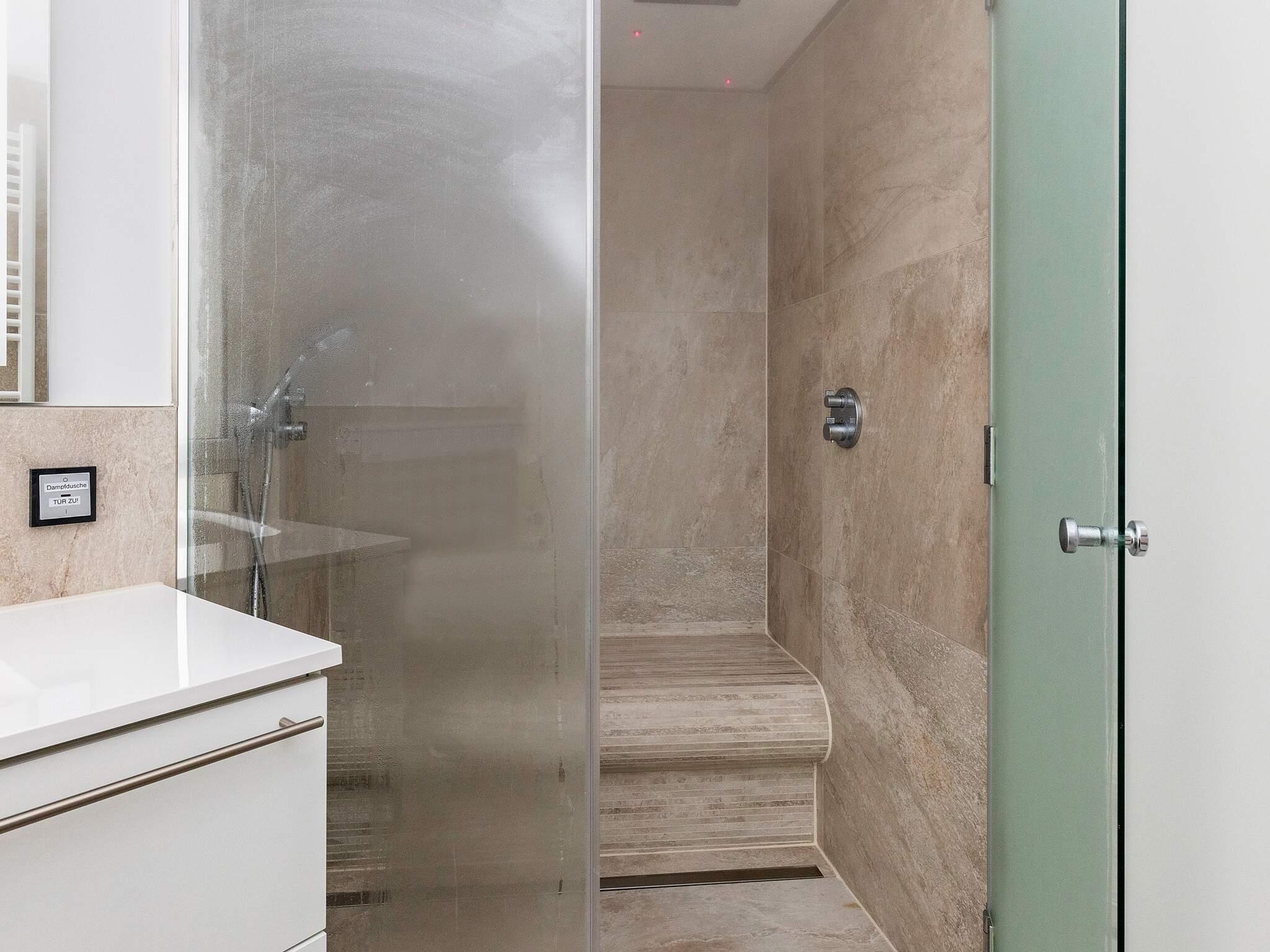Bad: WC, Waschb., Dusche, Dampfkabine, Fußbodenheiz.