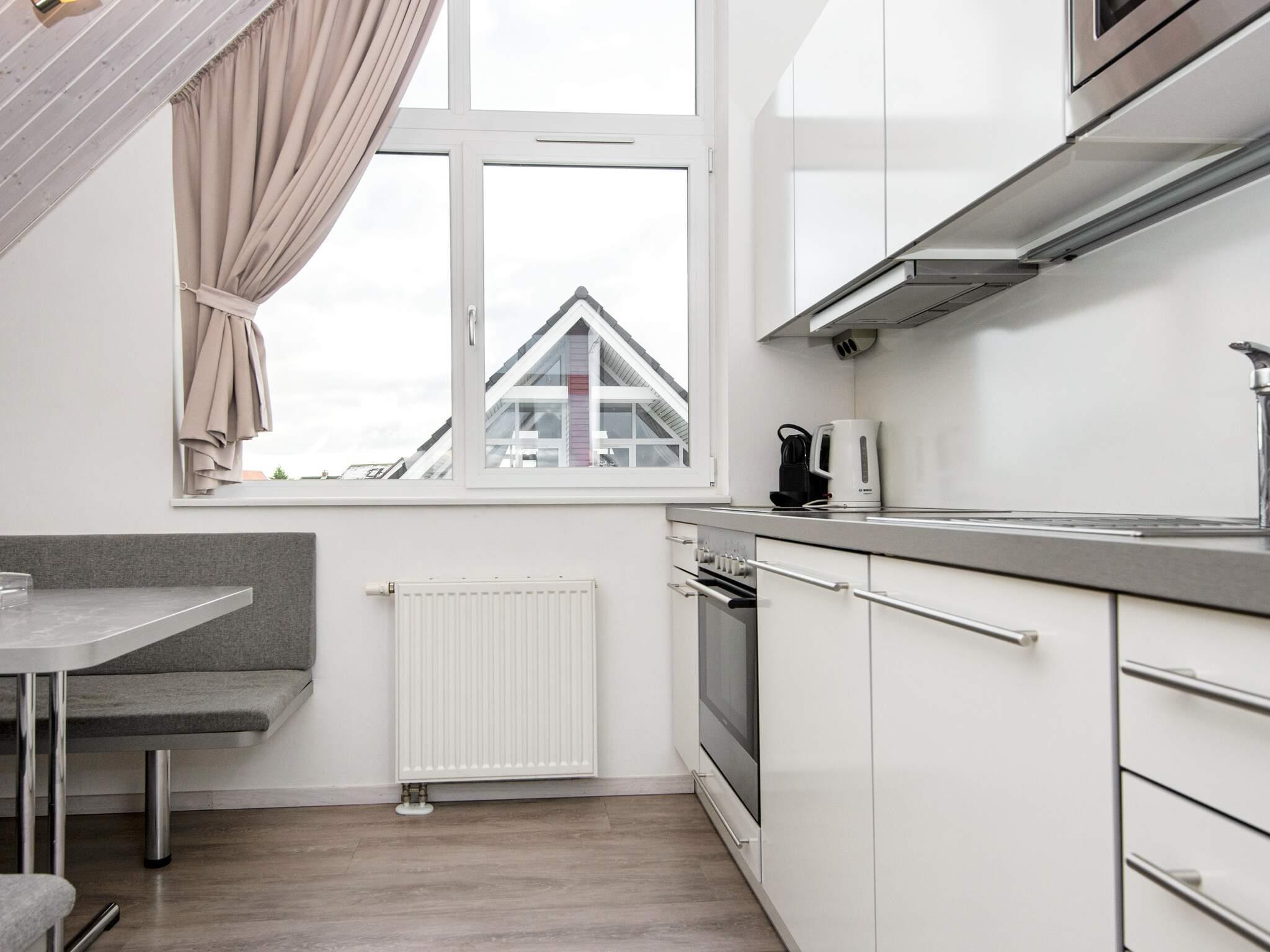 Der kombinierte Küchen-/Aufenthaltsbereich befindet sich im 1. Stock, von wo aus Sie einen herrlichen Blick auf das Meer und die Umgebung haben. Hier erwartet Sie auch eine Loggia, wo Sie laue Sommerabende und den Panoramablick auf den Deich und den dahinter liegenden Strand genießen können. Nutzen Sie das Fernglas, um den Schiffsverkehr und die herrliche Natur zu beobachten.