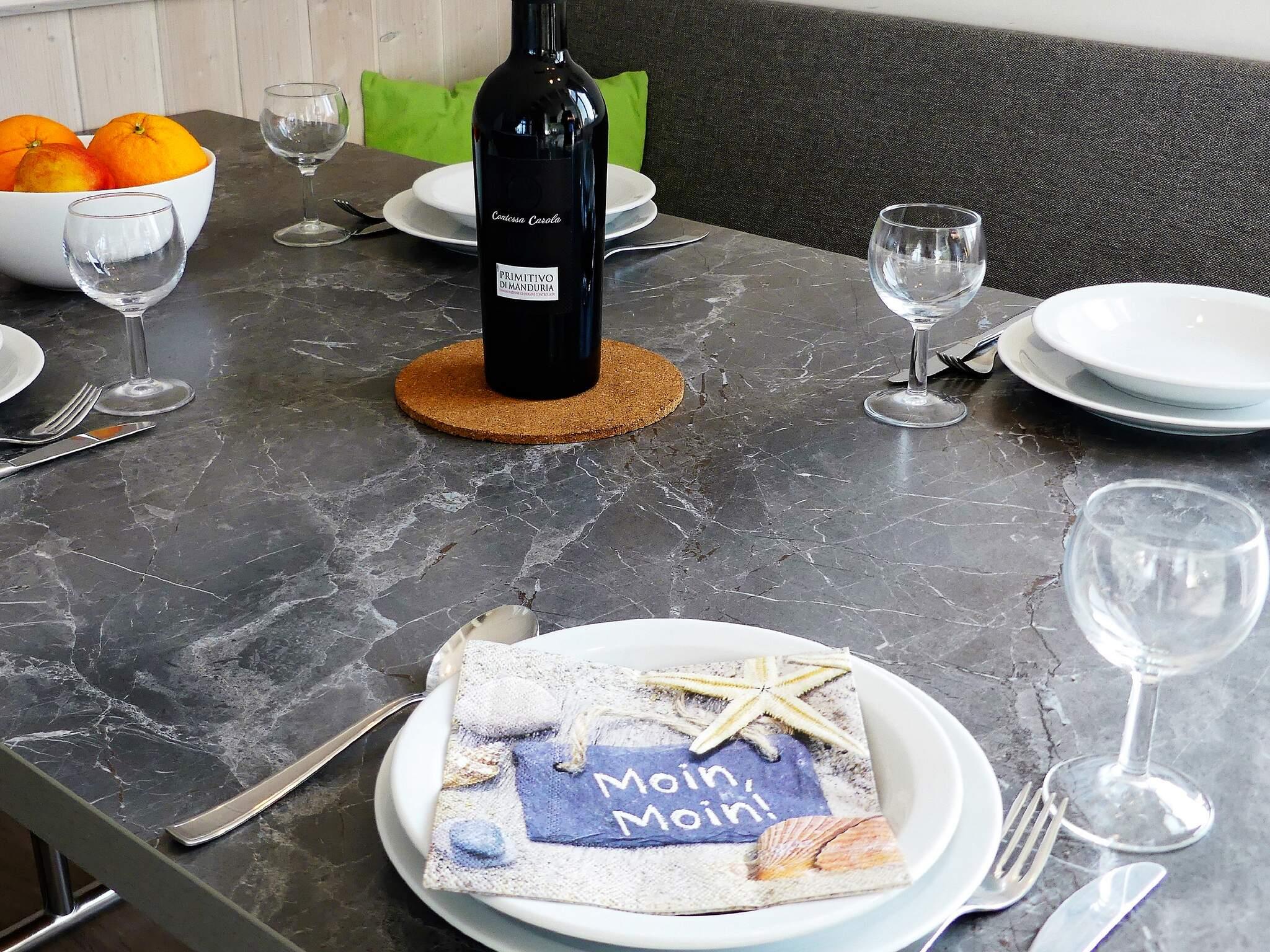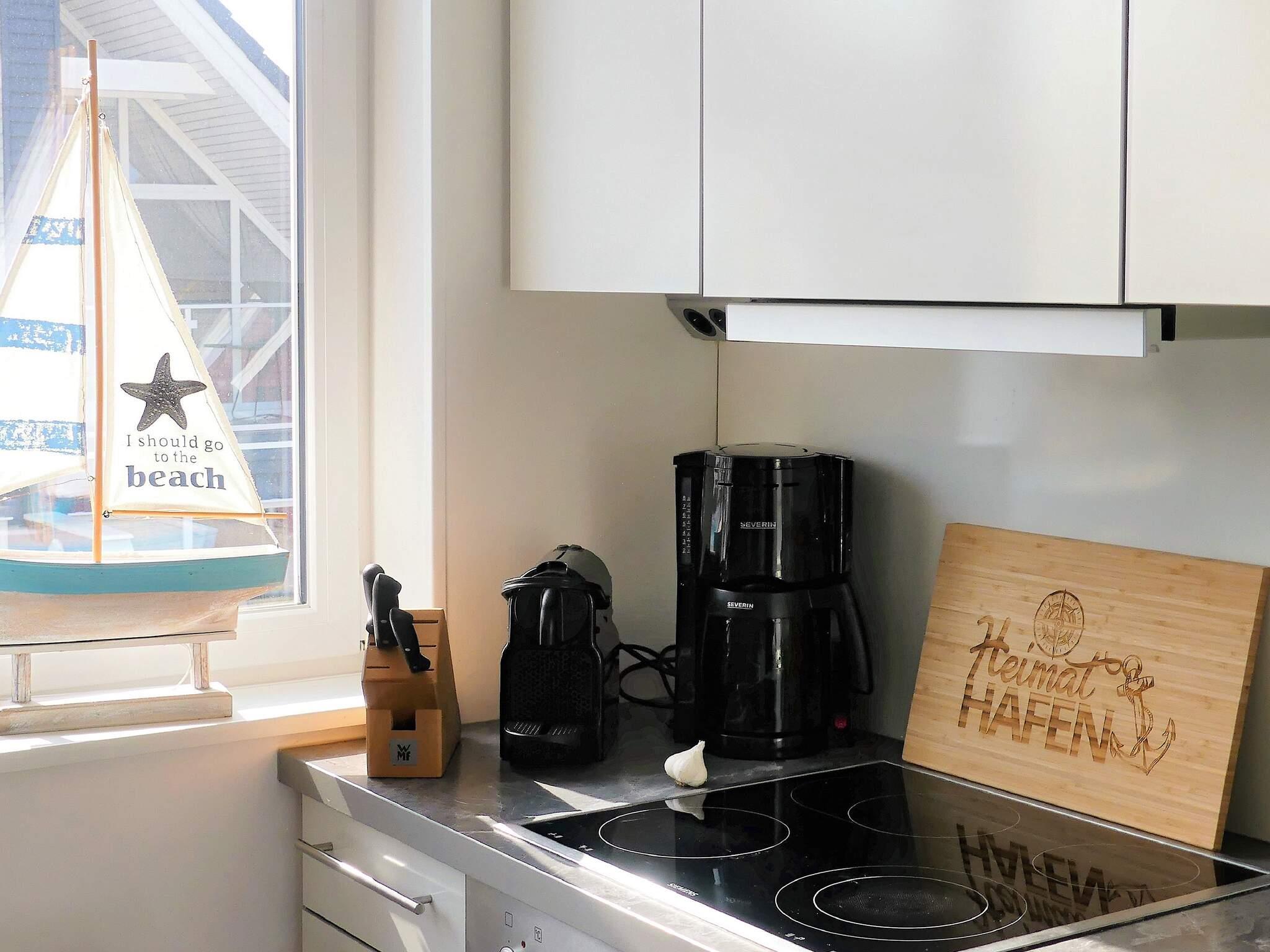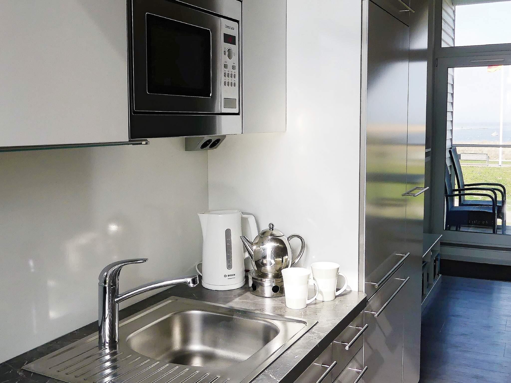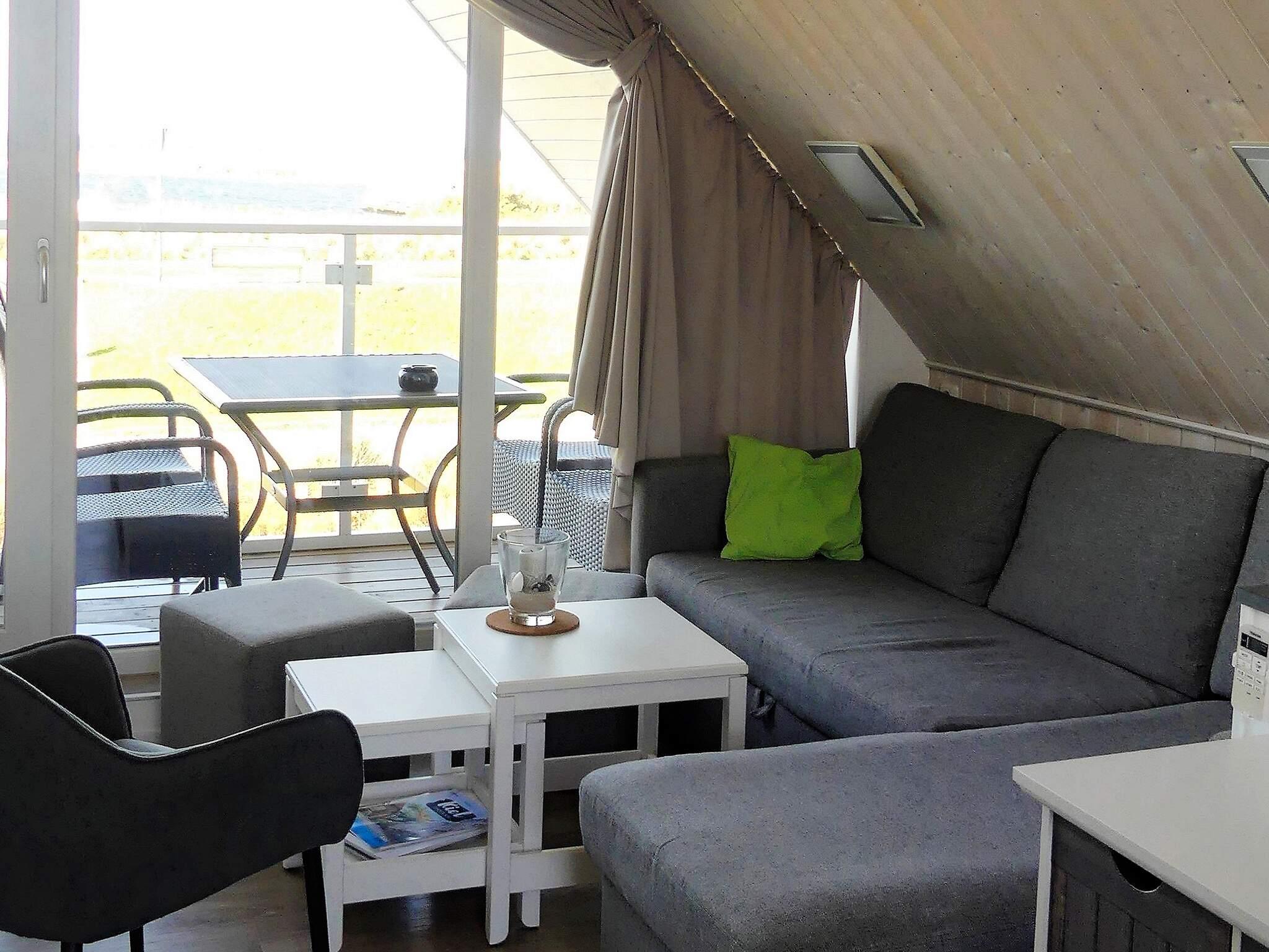 Der kombinierte Küchen-/Aufenthaltsbereich befindet sich im 1. Stock, von wo aus Sie einen herrlichen Blick auf das Meer und die Umgebung haben. Von hier aus gelangen Sie auch auf die überdachte Loggia, wo Sie laue Sommerabende und den Panoramablick auf den Deich und den dahinter liegenden Strand genießen können. Nutzen Sie das Fernglas, um den Schiffsverkehr und die herrliche Natur zu betrachten.