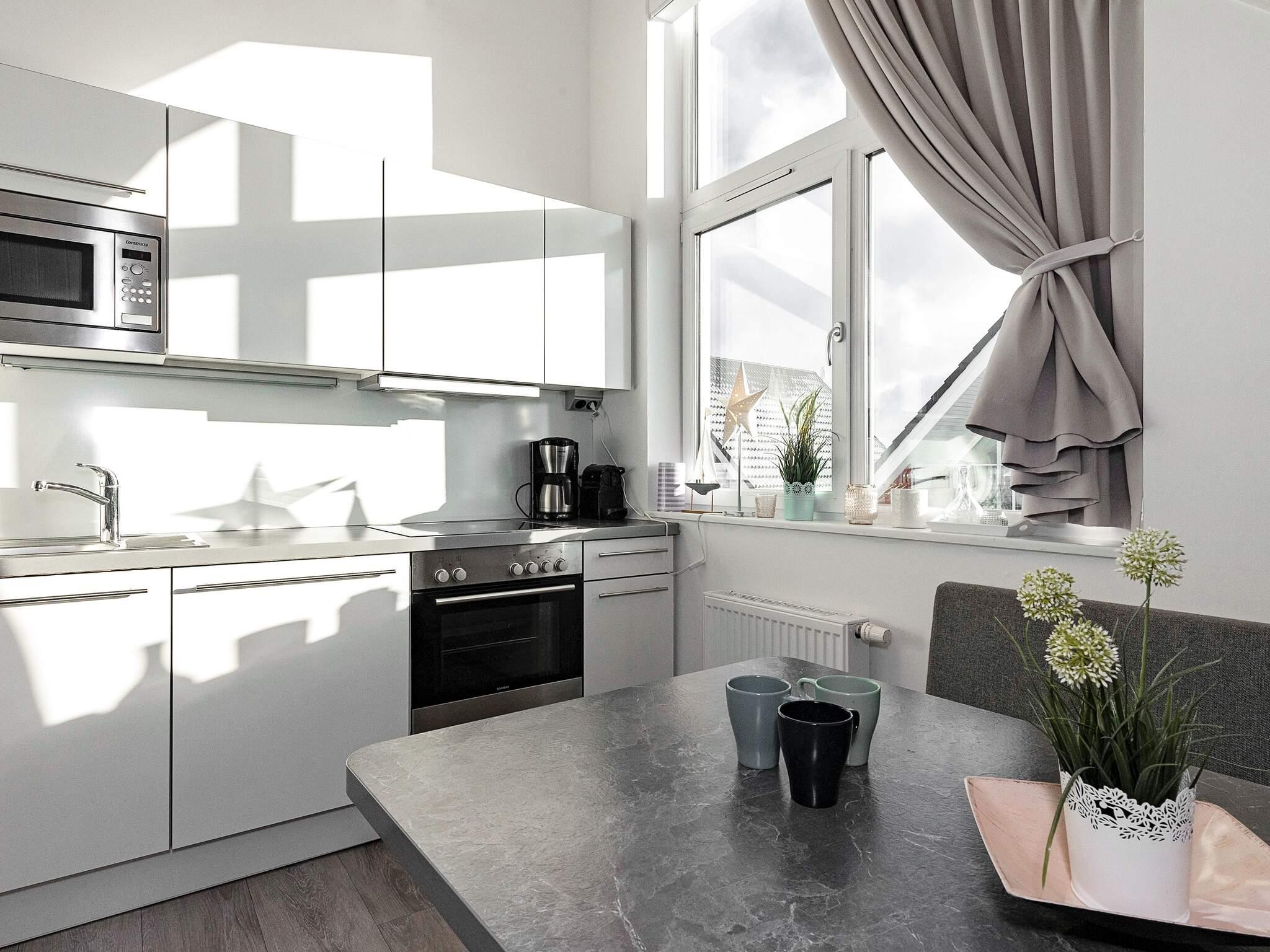 Küche: E-Herd, Kühlschr. m. Gefrierfach, Mikrow., Abzugsh., Kaffeem., Spülm.
