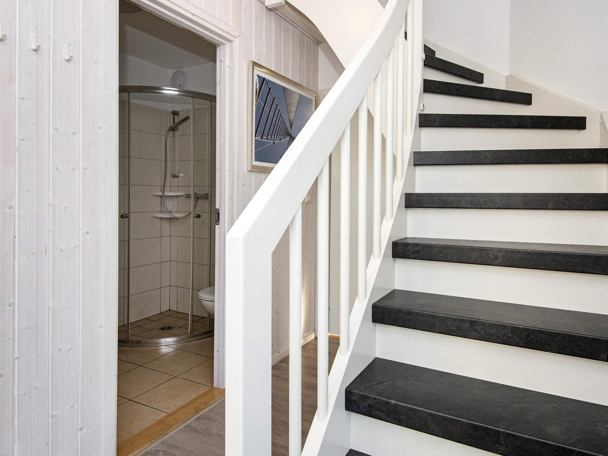 Im Erdgeschoss gibt es zwei Schlafzimmer und ein Bad mit Dusche, Fußbodenheizung und Sauna. Sowohl vom Flur als auch von den Schlafzimmern gelangen Sie auf die Terrasse. Eine Treppe führt in die obere Etage, in der sich der Küchen-/Aufenthaltsbereich befindet, von dem aus Sie einen herrlichen Blick auf die Umgebung haben. Noch schöner ist der Blick von der Loggia, auf der Sie geschützt im Freien sitzen können. Nutzen Sie das Fernglas, um den Schiffsverkehr zu beobachten.