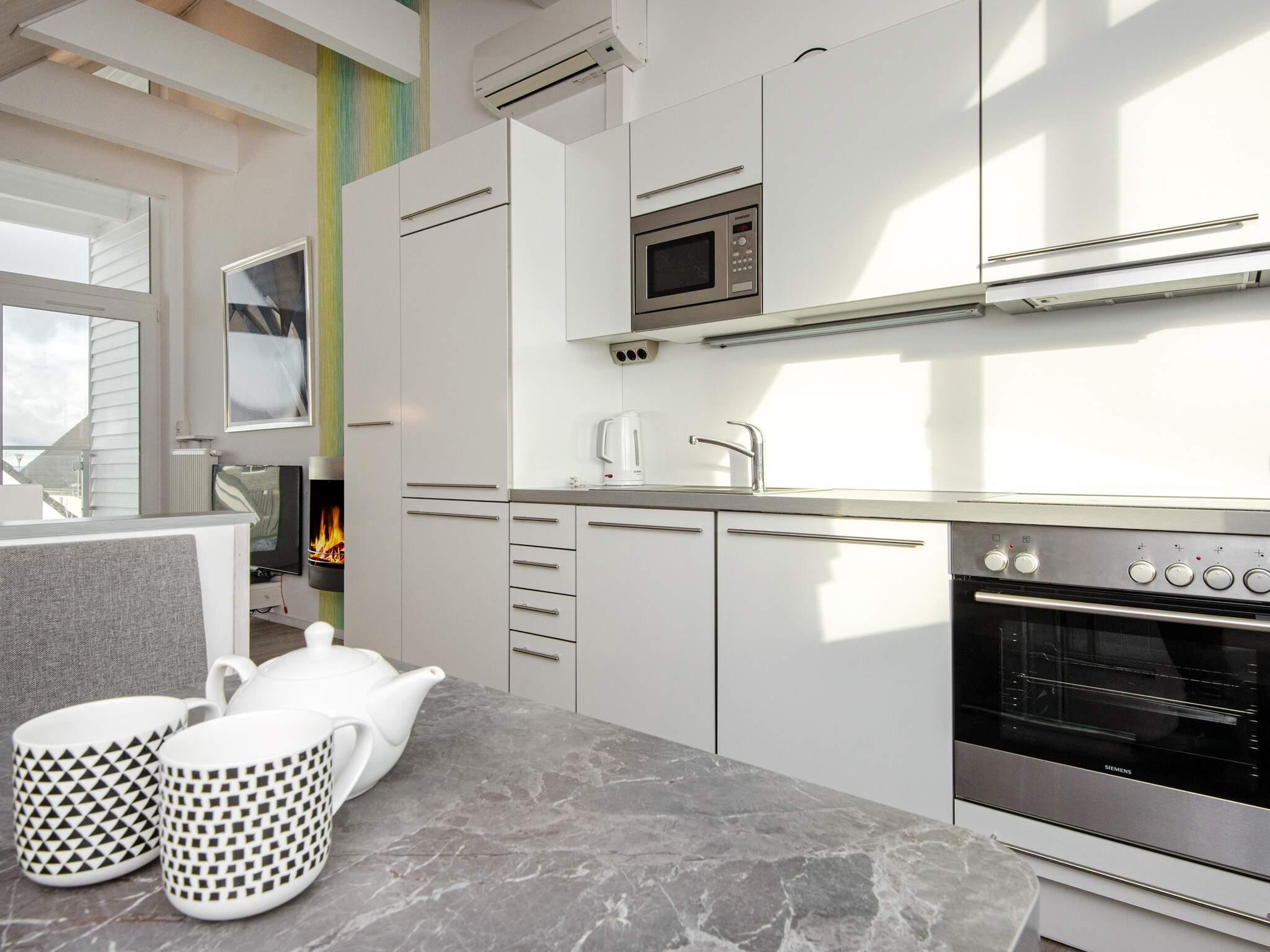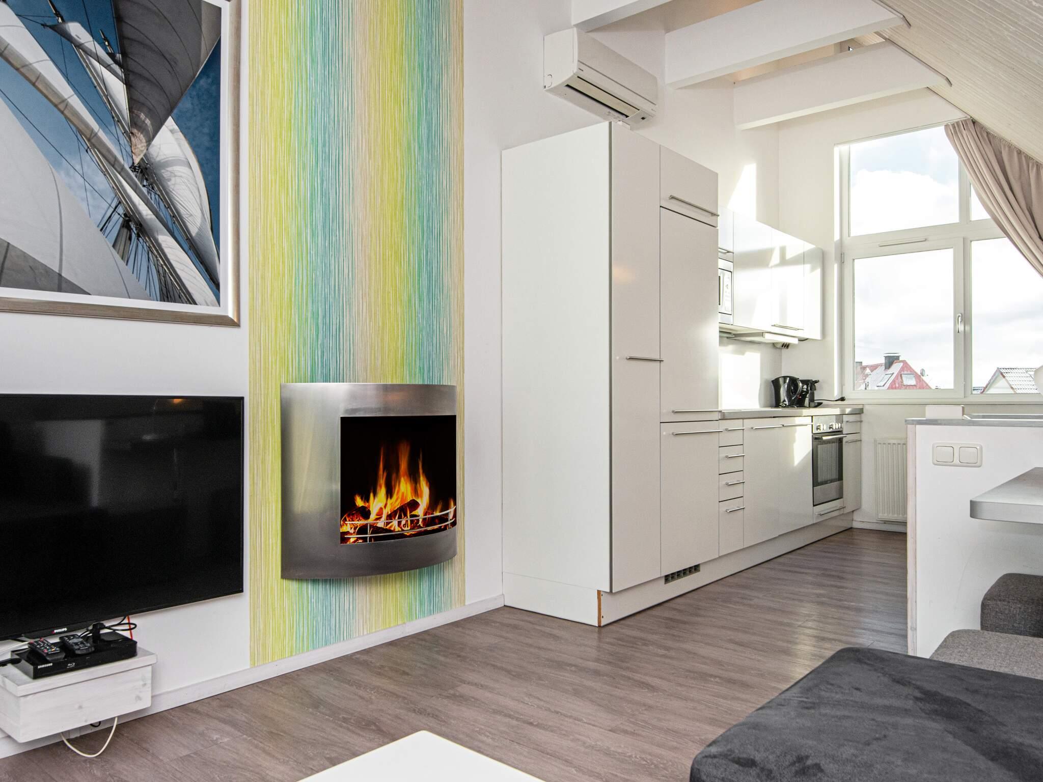 Das Wohnzimmer verfügt u.a. über einen Flachbildfernseher mit Blu-ray Player, eine Musikanlage mit CD-Player und MP3-Anschluss sowie einen Bioethanolkamin, der an kühlen Tagen wohlige Wärme verbreitet. Eine Klimaanlage sorgt für ein angenehmes Innenklima. Die Einrichtung kann variieren, u.a. gibt es unterschiedliche Typen von Kaffeemaschinen in den Häusern.