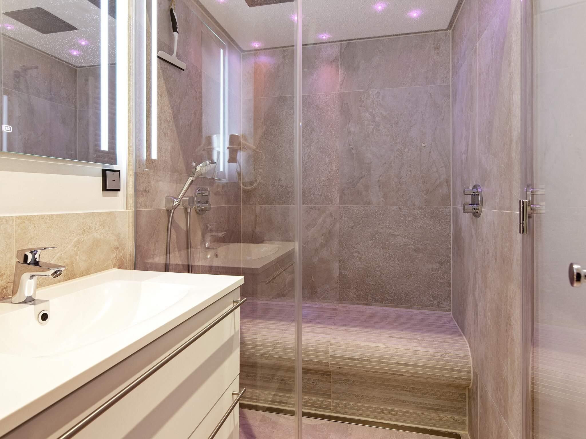 Bad: WC, Waschb., Dusche, Dampfkabine, Fußbodenheiz.
