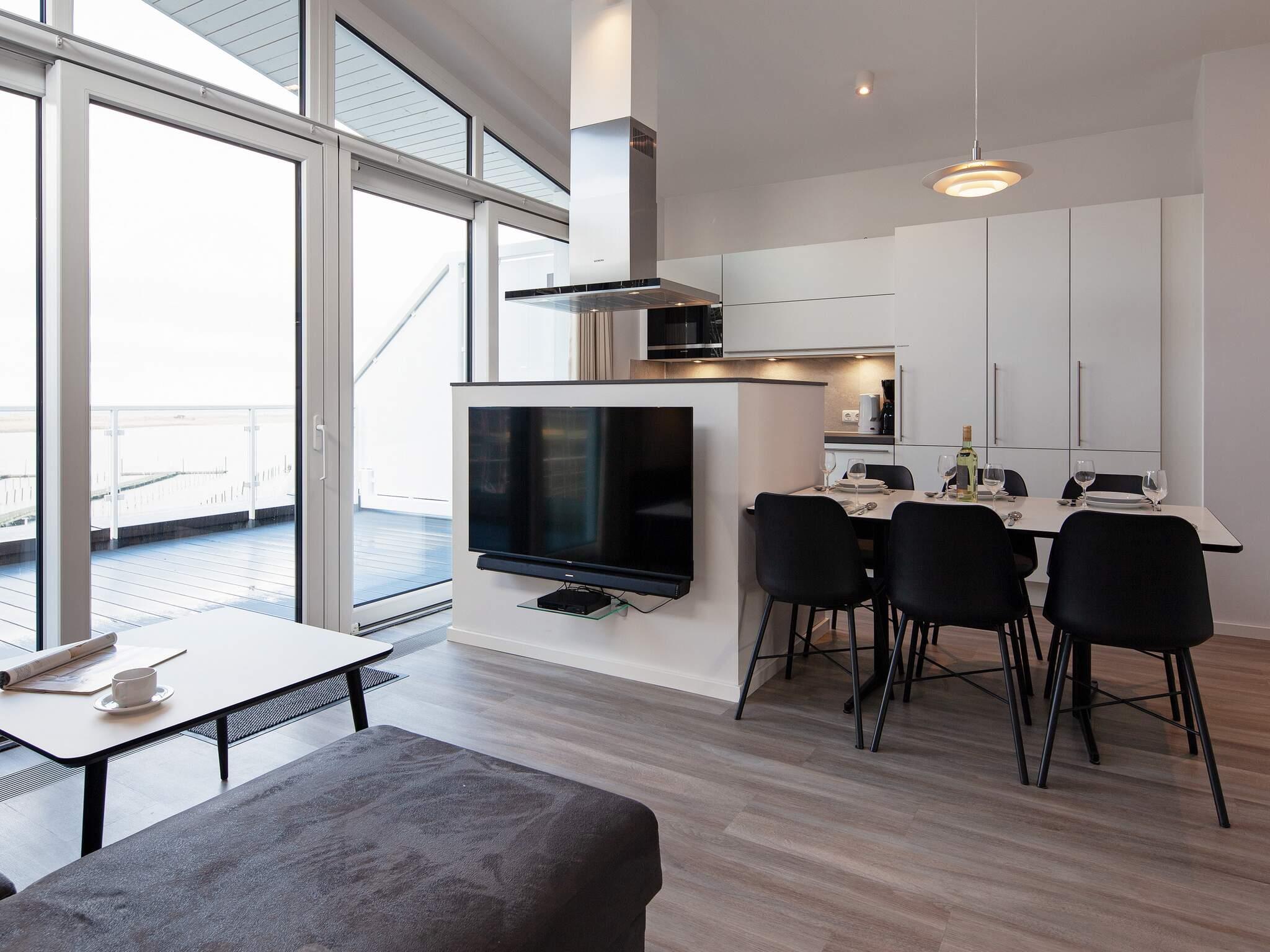 Die moderne und komfortabel eingerichtete Wohnung besteht aus einem kombinierten Küchen- und Wohnbereich, von dem aus Sie auf die große Dachterrasse gelangen. Zusaätzlich zum Herd verfügt die Wohnung über ein WOK-Kochfeld. Die zwei Schlafzimmer sind mit je einem Doppelbett und einem Flachbildfernseher ausgestattet. Die zwei anderen Schlafplätze sind Aufbettungen auf der Schlafcouch im Wohnzimmer. Darüber hinaus gibt es ein Badezimmer mit Regendusche mit Dampfbad-Funktion sowie Fußbodenheizung. Ein Fernseher mit Blu-Ray-Player und eine Soundbar mit Bluetooth-Anbindung sorgen für Unterhaltung und der Bioethanolkamin für gemütliche Wärme.