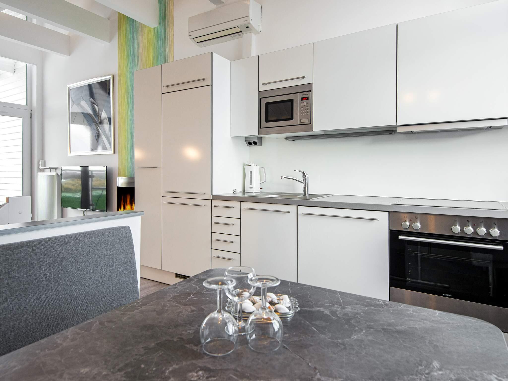 Der kombinierte Küchen-/Aufenthaltsbereich befindet sich im 1. Stock, von wo aus Sie einen herrlichen Blick auf das Meer und die Umgebung haben. Hier erwartet Sie auch eine Loggia, wo Sie laue Sommerabende und den Panoramablick auf den Deich und den dahinter liegenden Strand genießen können. Nutzen Sie das Fernglas, um den Schiffsverkehr und die herrliche Natur zu beobachten.