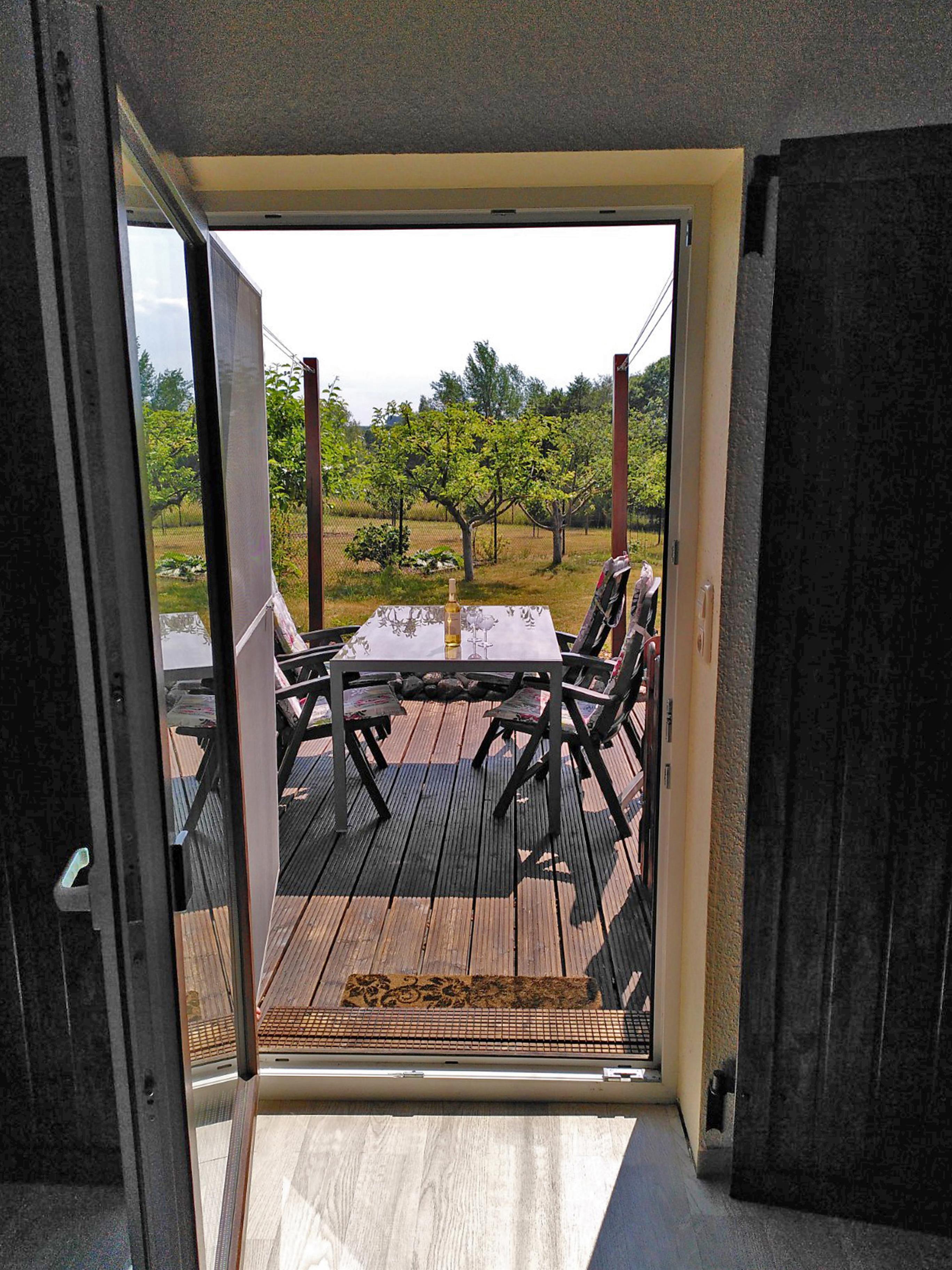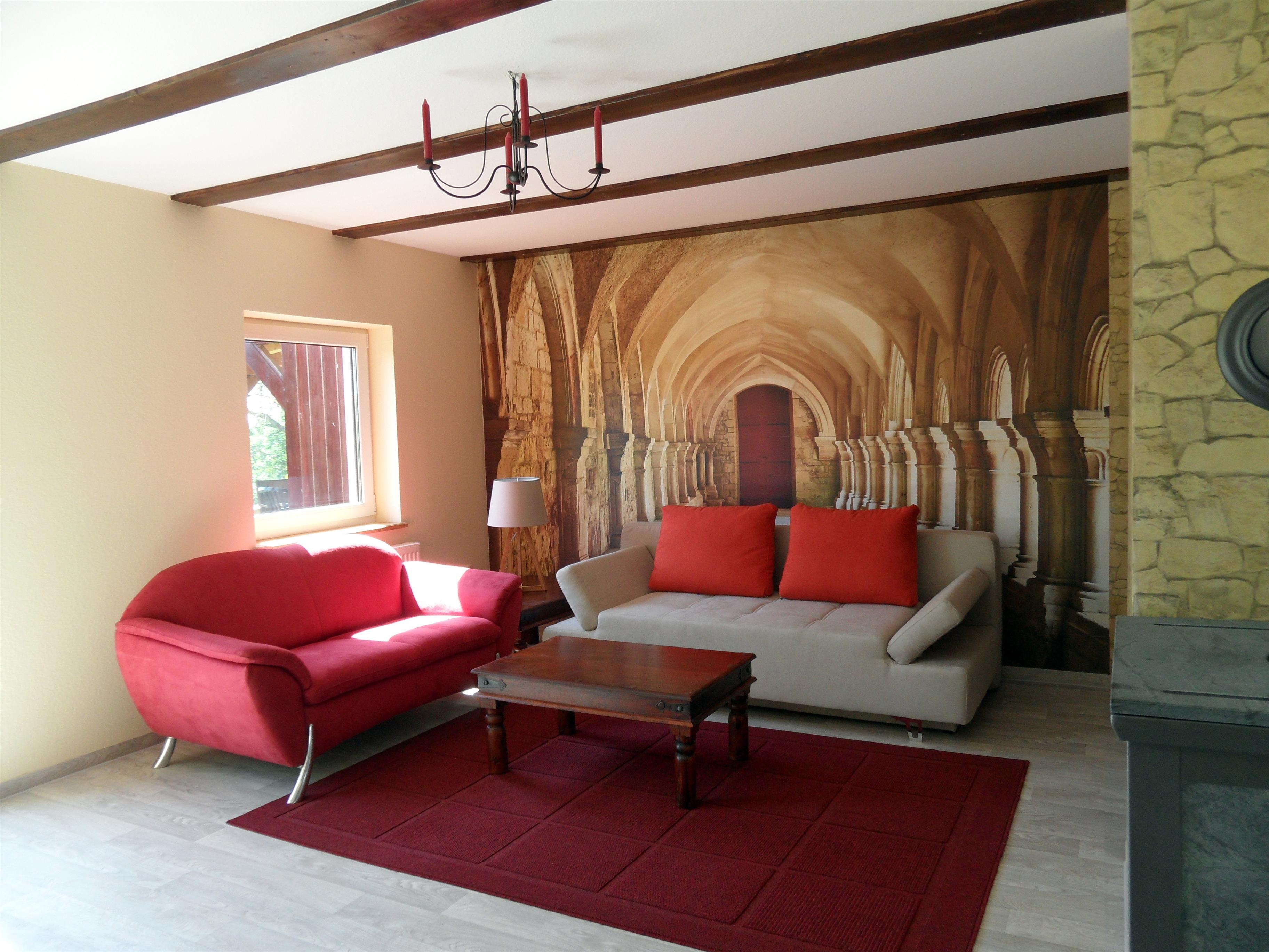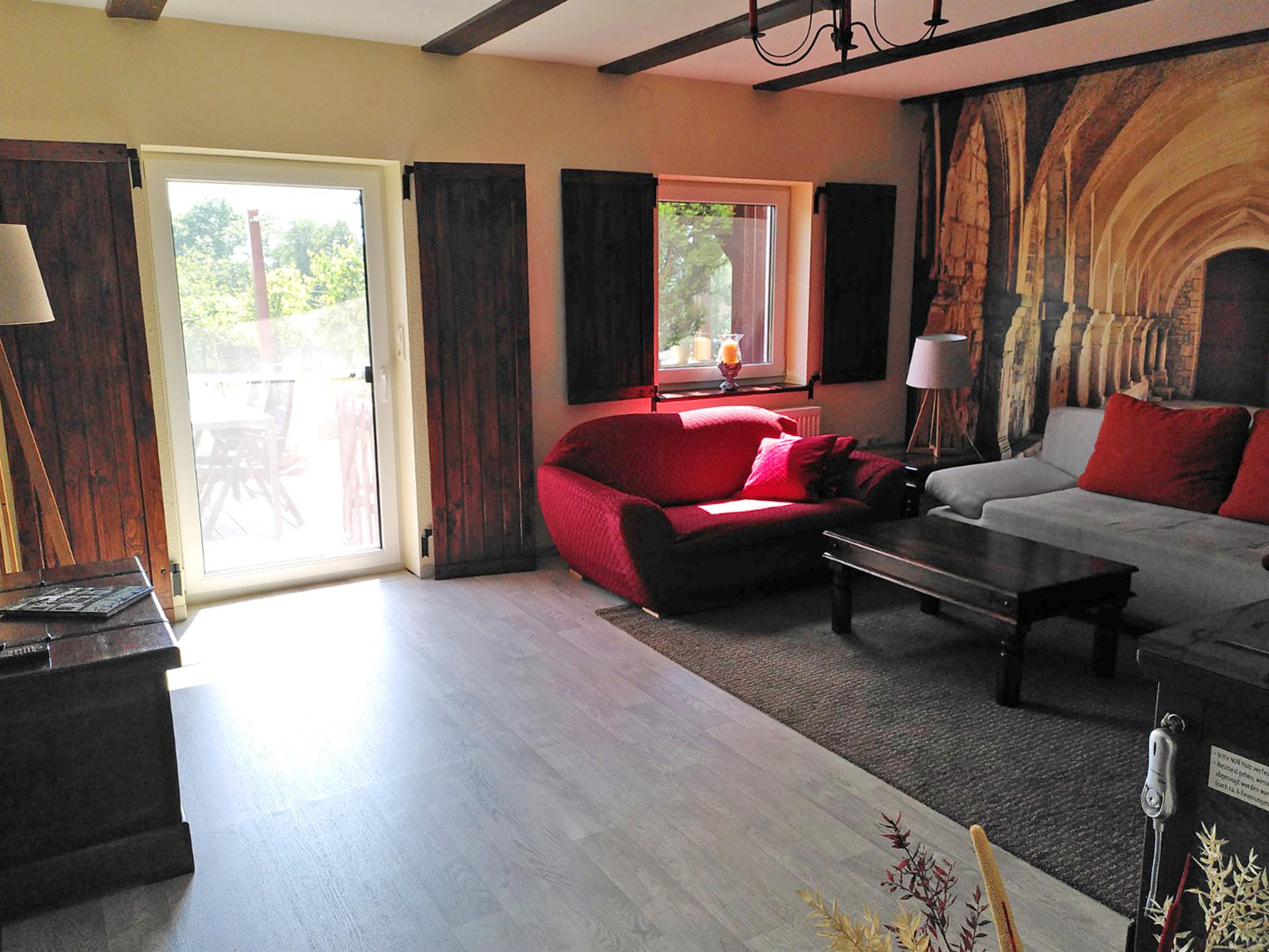 Im gemütlichen Wohnzimmer steht ein Schlafsofa(Liegefläche 1,50 m x 2,00 m) für 2 weitere Personen zur Verfügung. Hier befinden sich ebenfalls ein Kleiderschrank, ein zusätzliches Sofa und ein Holzofen für kalte Winterabende. Von hier aus ist auch die hübsch angelegte 12 qm-Terrasse mit Südwest-Ausrichtung zugänglich.