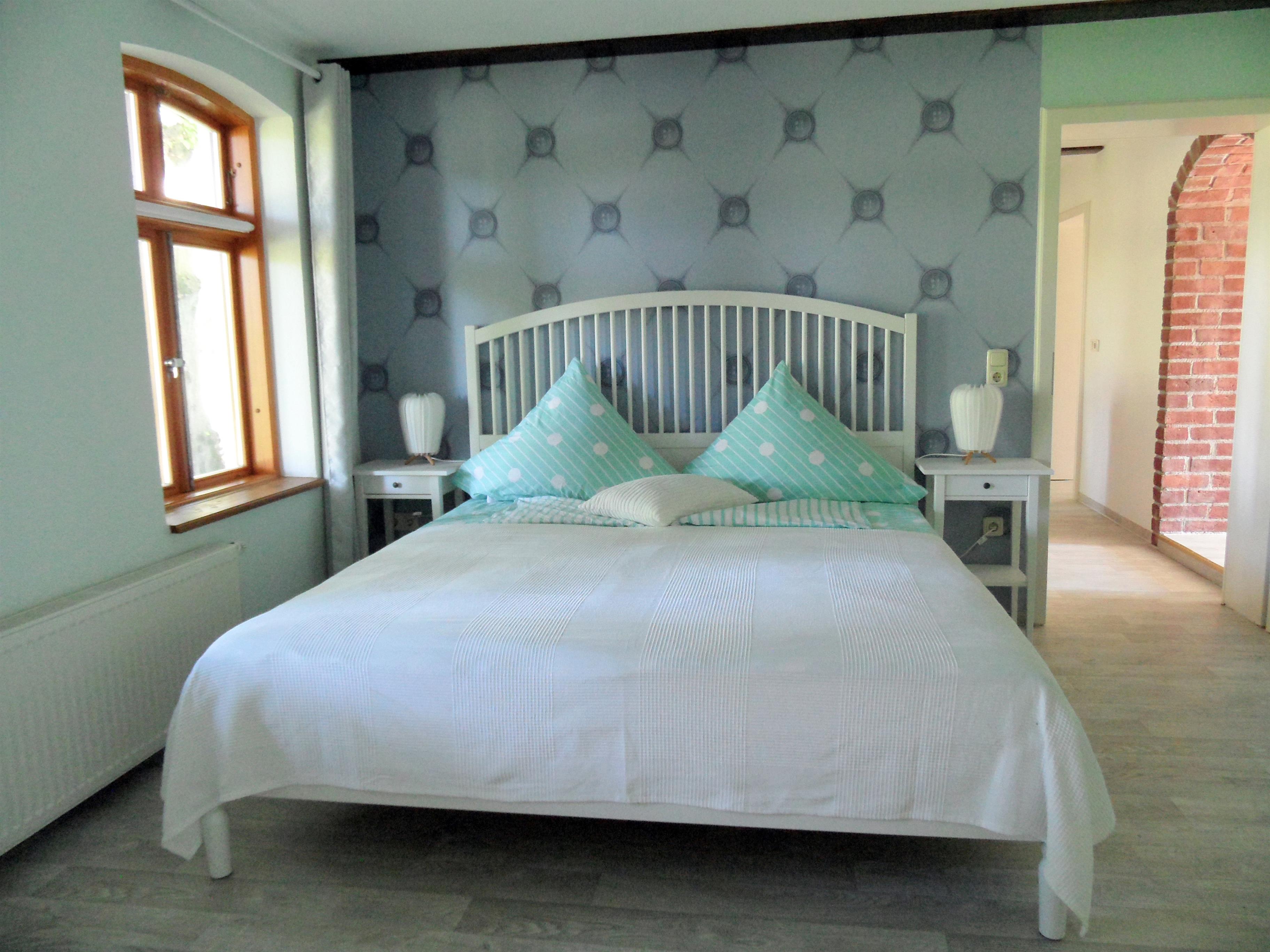 Das geräumige Schlafzimmer ist mit einem großen Doppelbett(Liegefläche 1,80 m x 2,00 m), Kleiderschrank und Kommode ausgestattet.