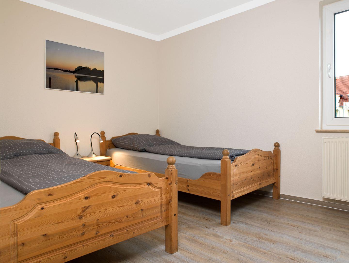 Ein Schlafzimmer mit Doppelbett und ein weiteres Schlafzimmer mit zwei Einzelbetten bieten Platz für 4 Gäste.