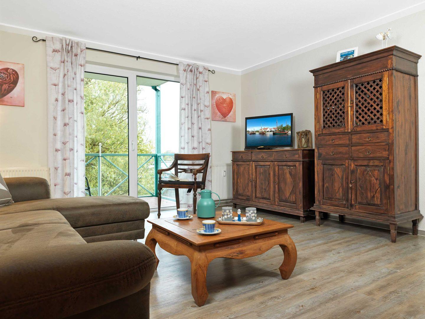 Vom gut ausgestatteten Wohnzimmer mit Flach-TV, und Sofaecke, gelangen Sie auf den Balkon.